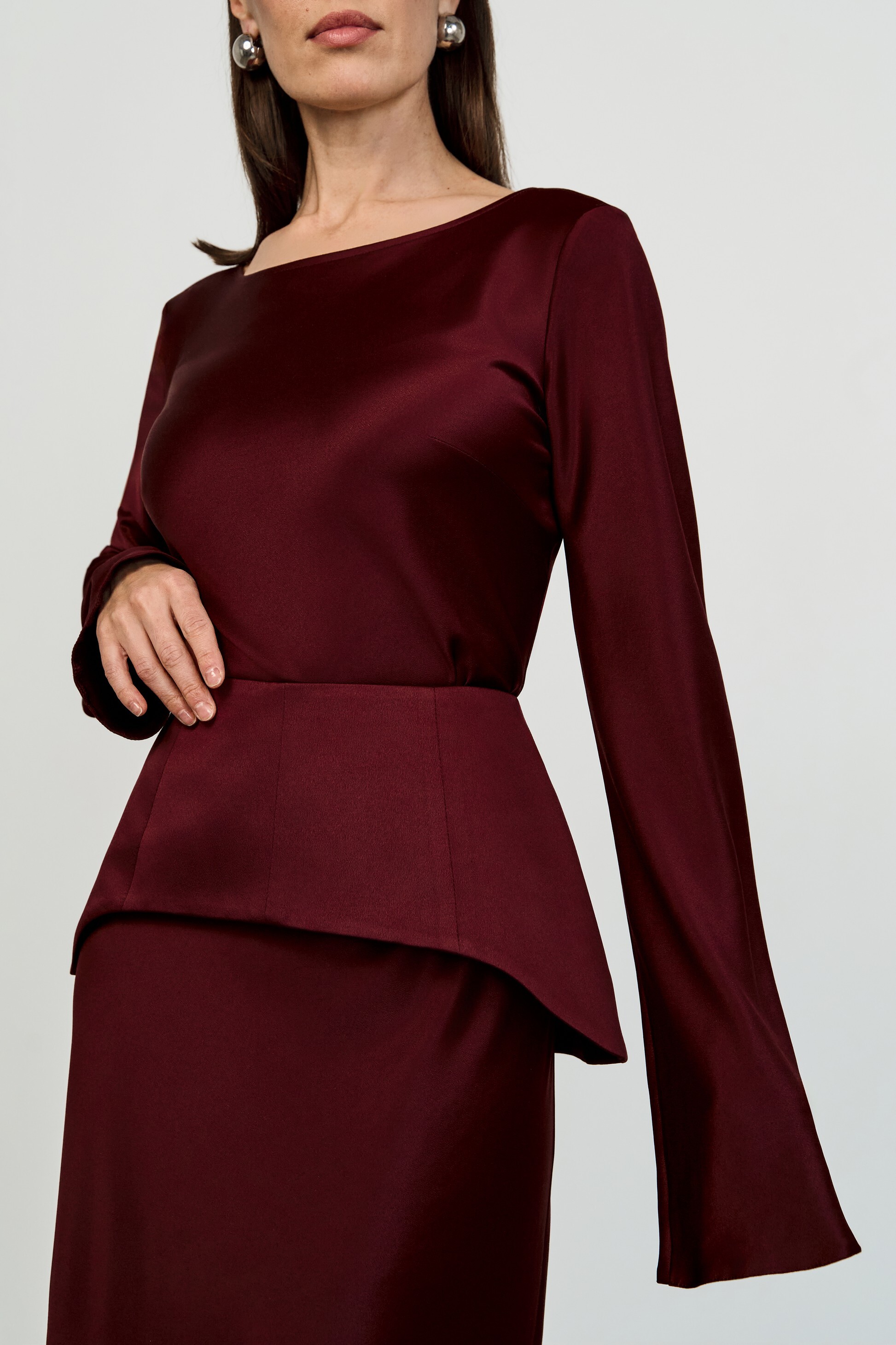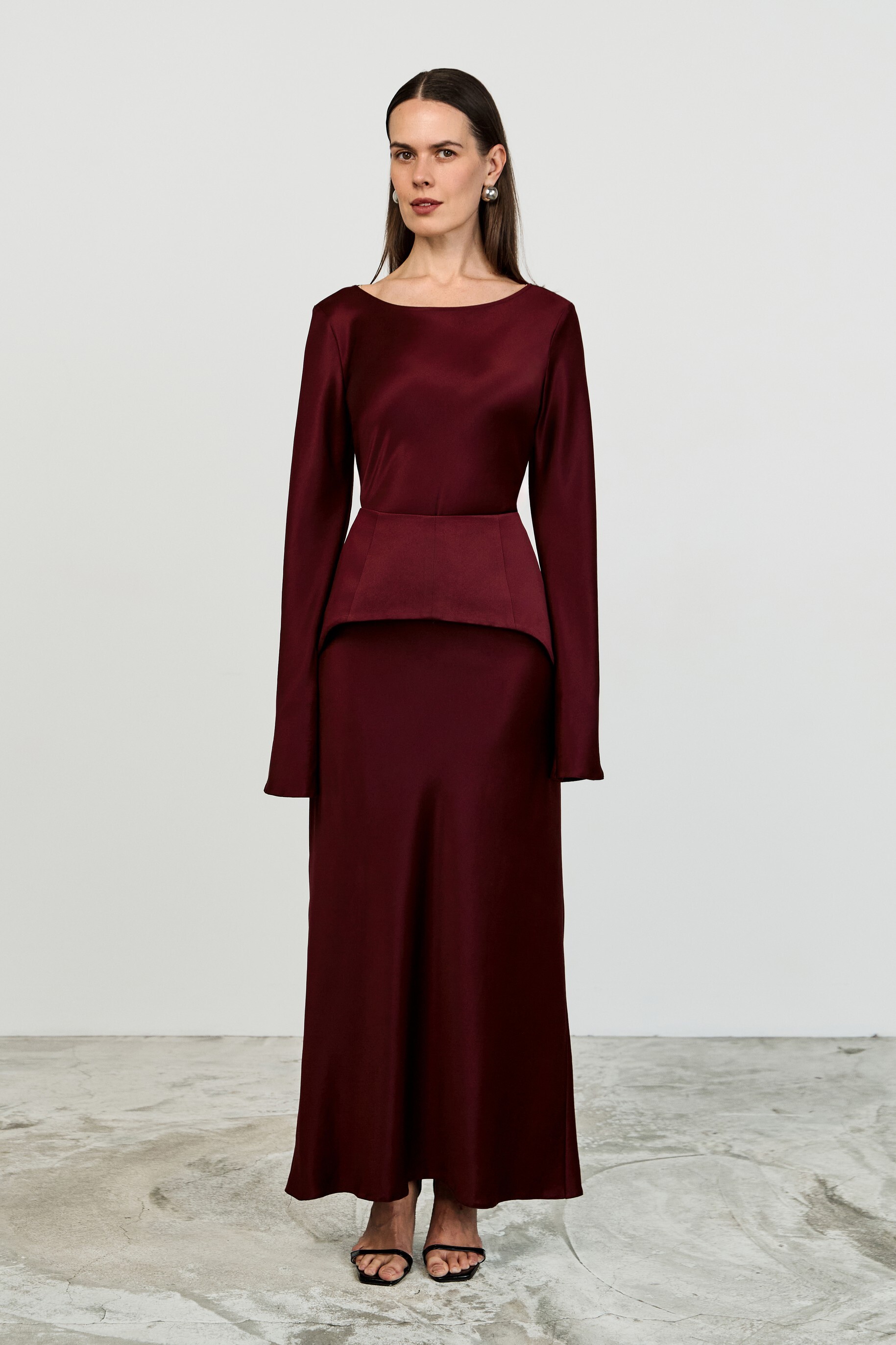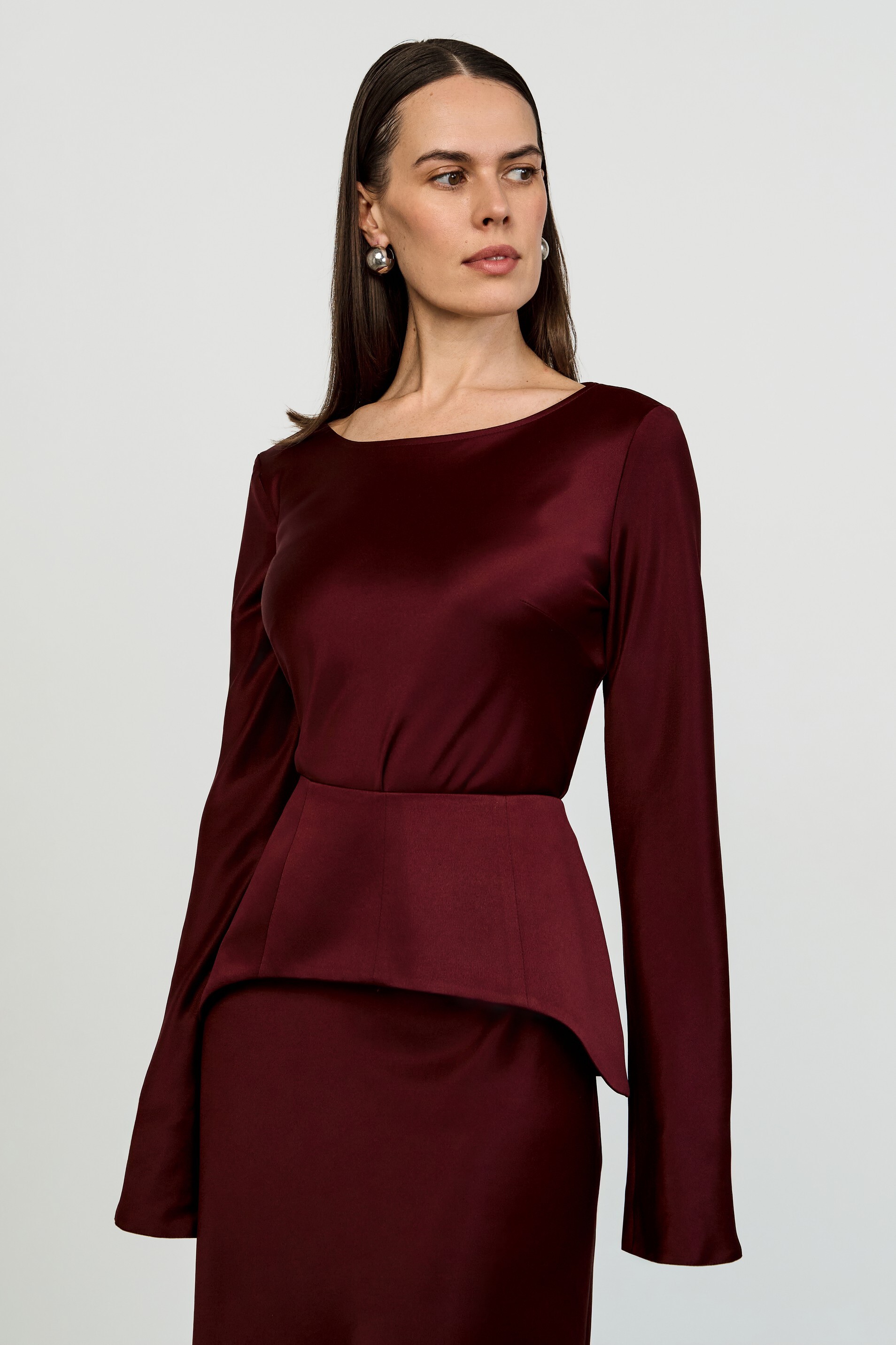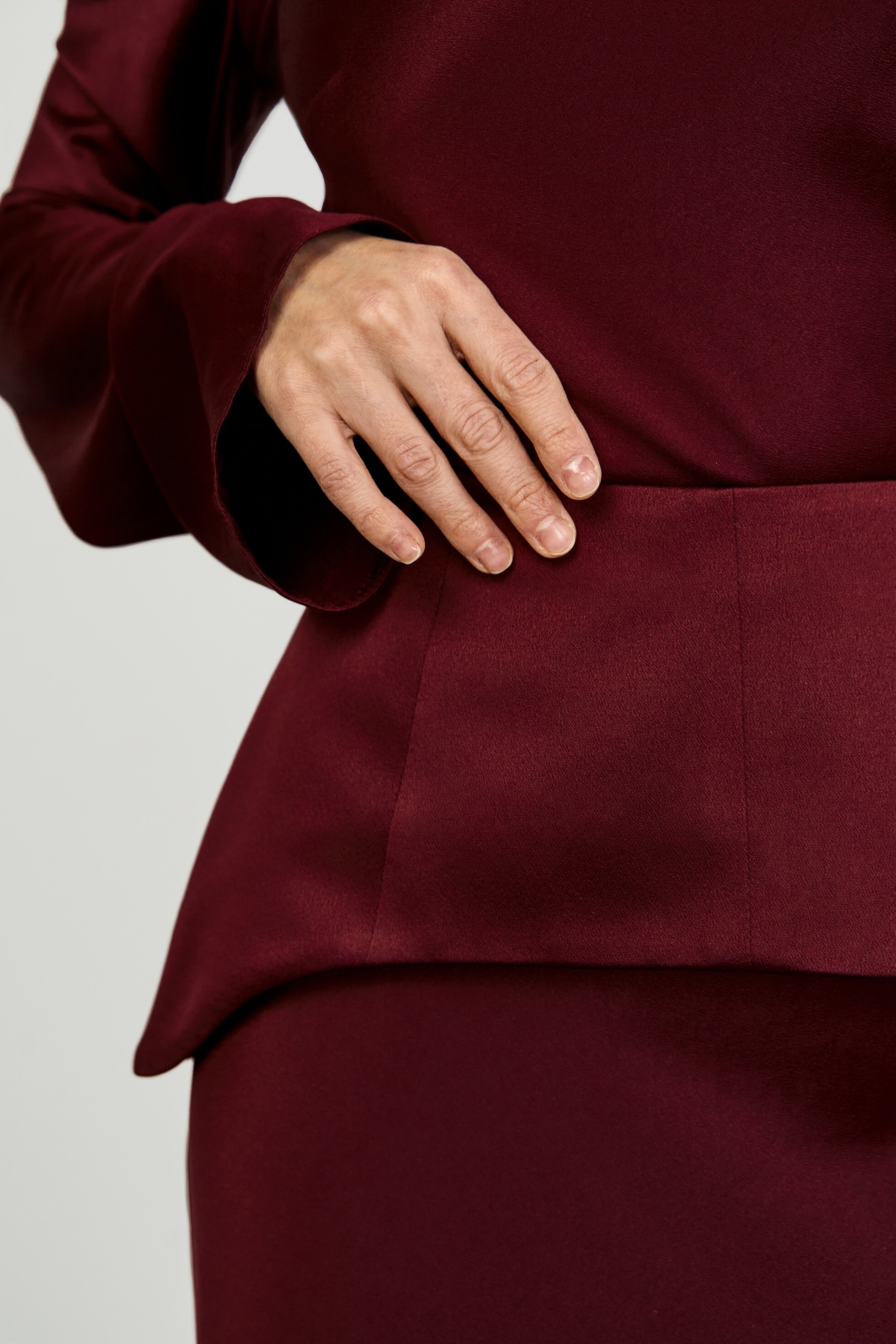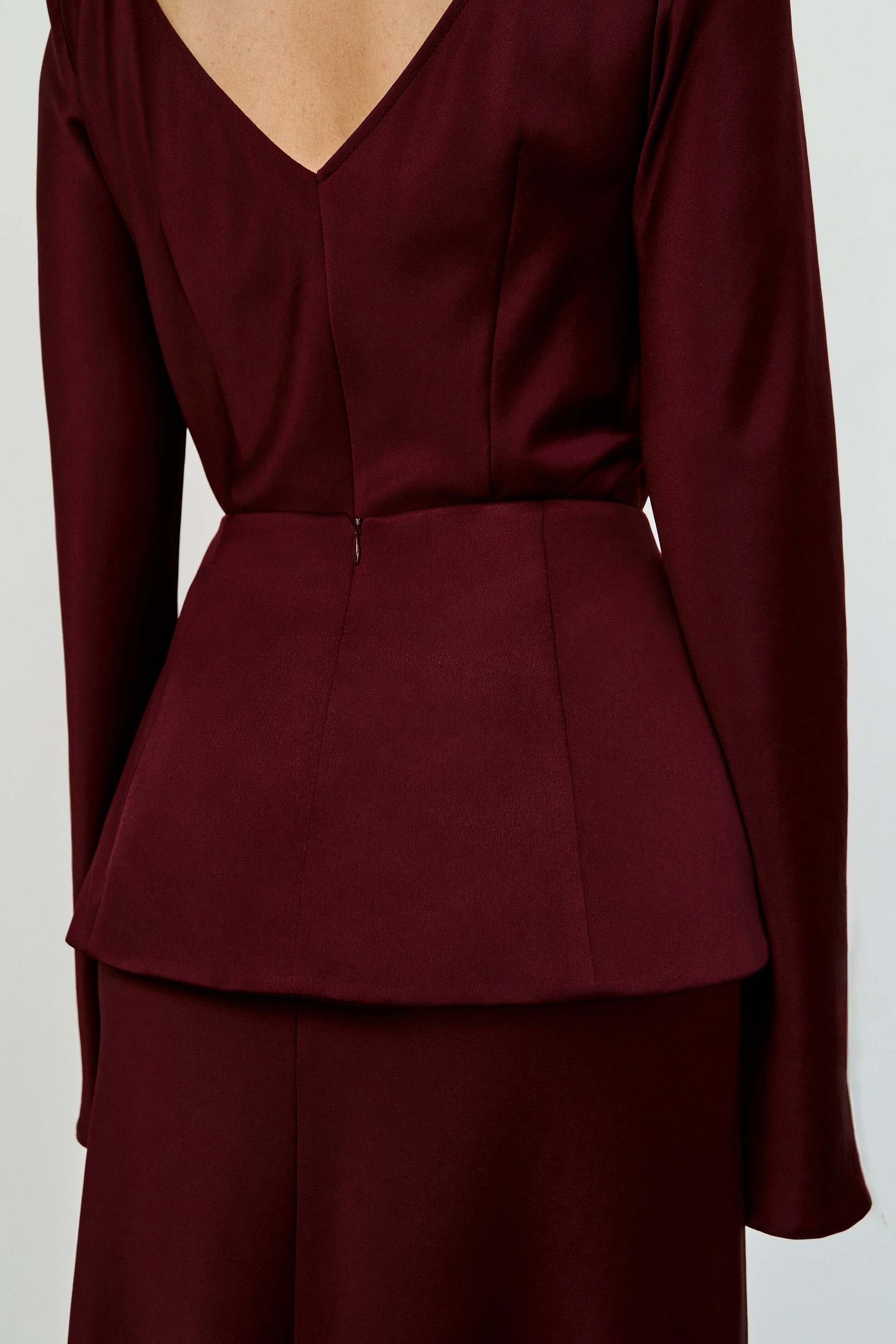 Трапециевидная съёмная баска с рельефами — лаконичный дизайн с асимметричным низом и потайной молнией на спинке. Добавит индивидуальности любому образу.