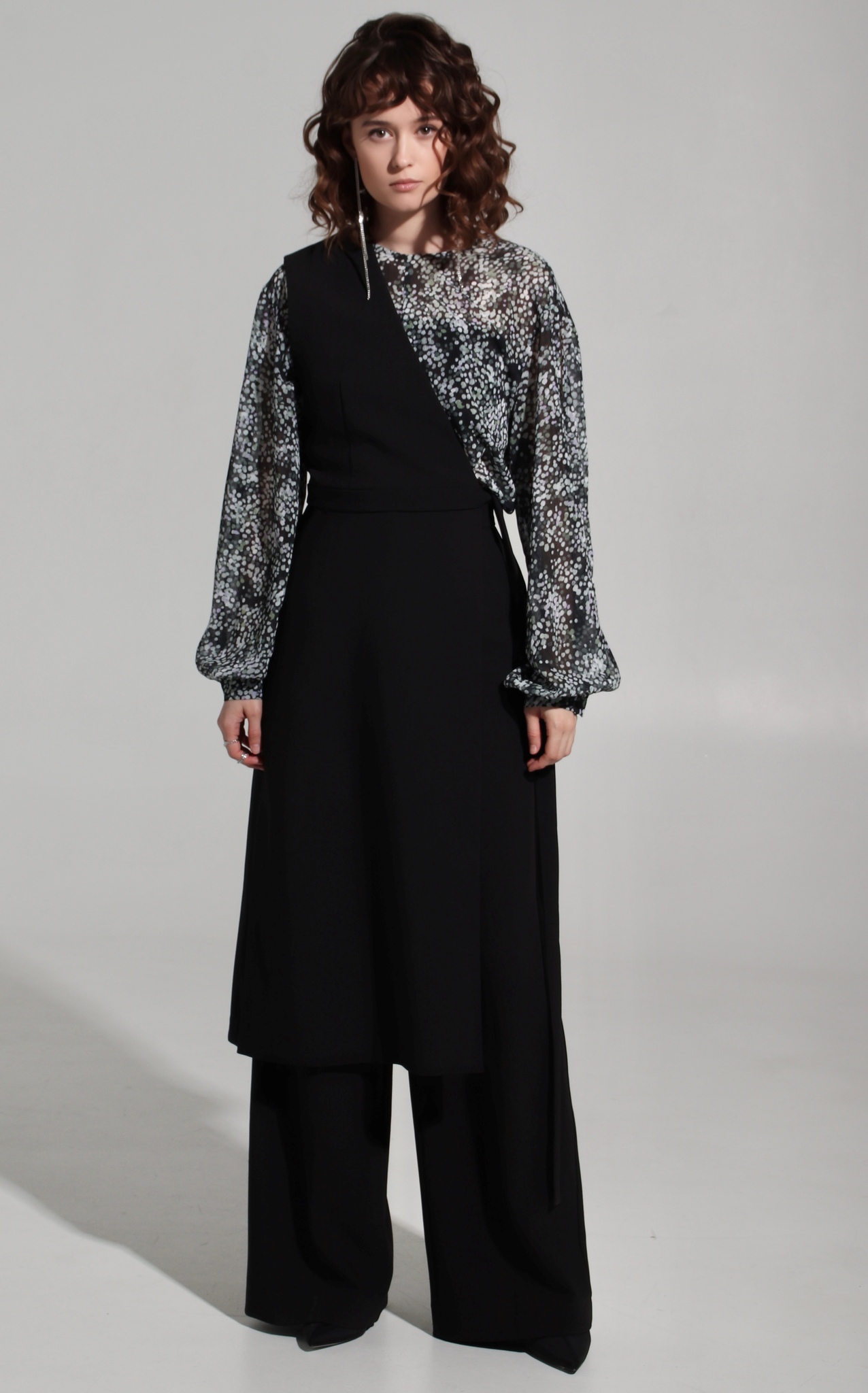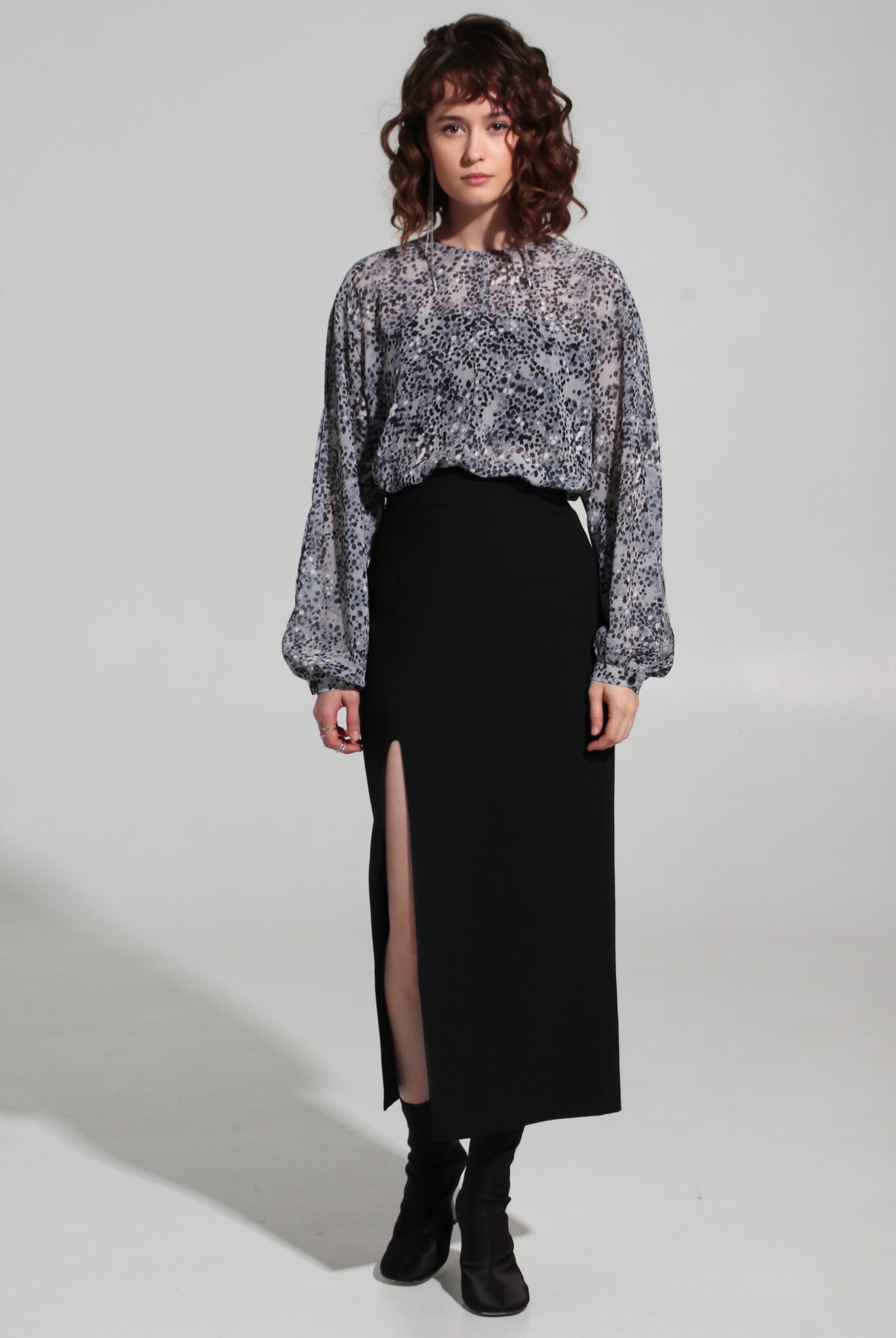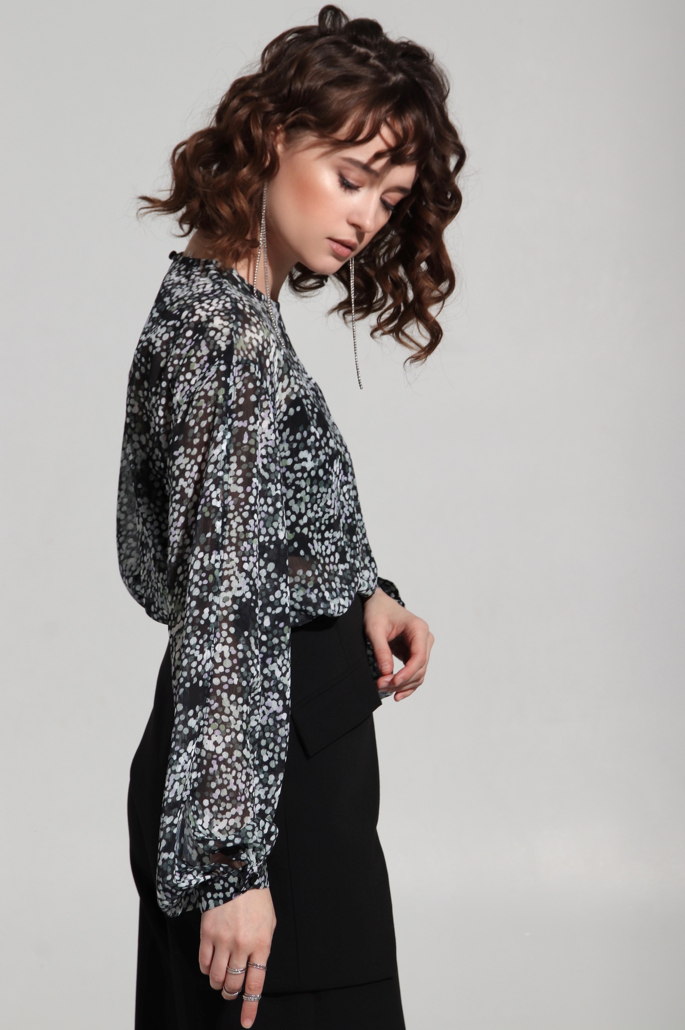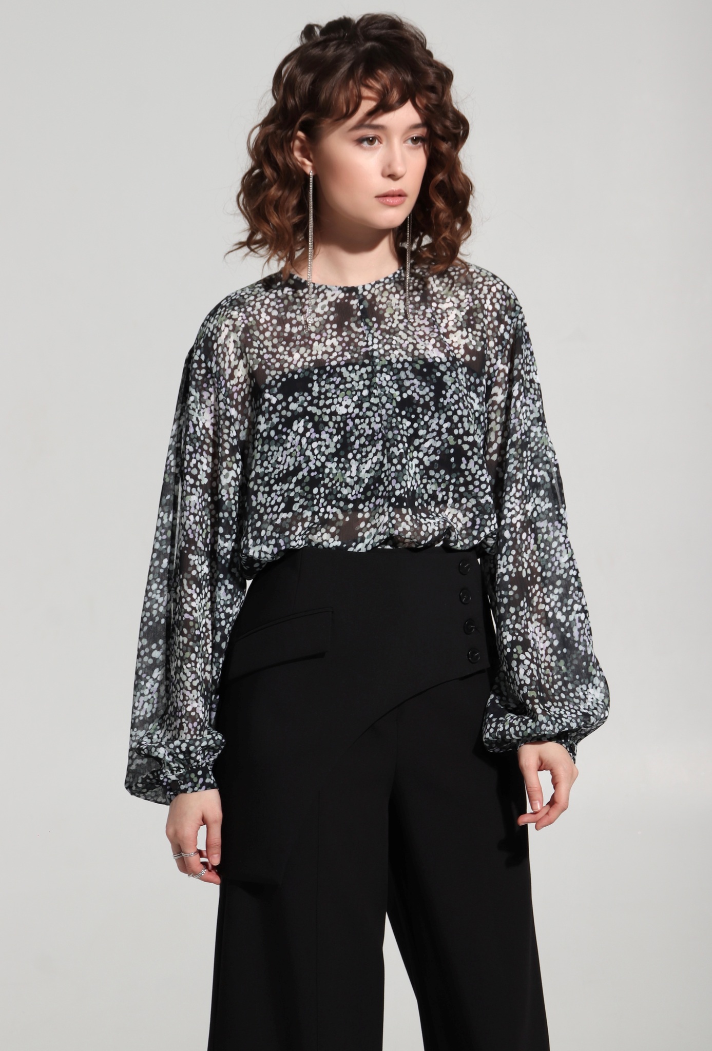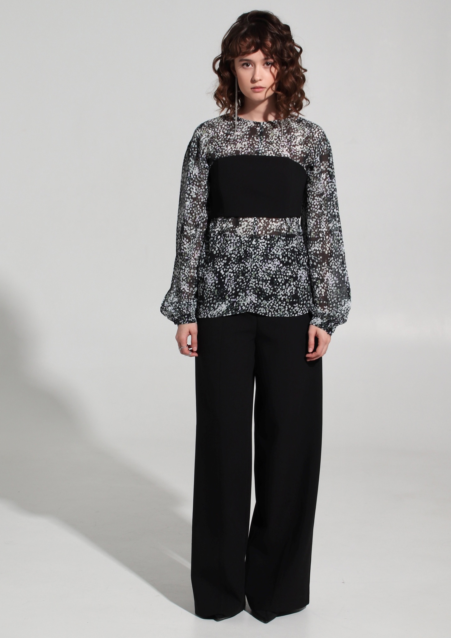 Блуза прямого силуэта умеренного объема. По переду центральный шов. На спинке средний шов с разрезом по горловине. Вырез горловины круглой формы. Рукав длинный, с разрезами по центру. Низ со сборкой на тонкой манжете.