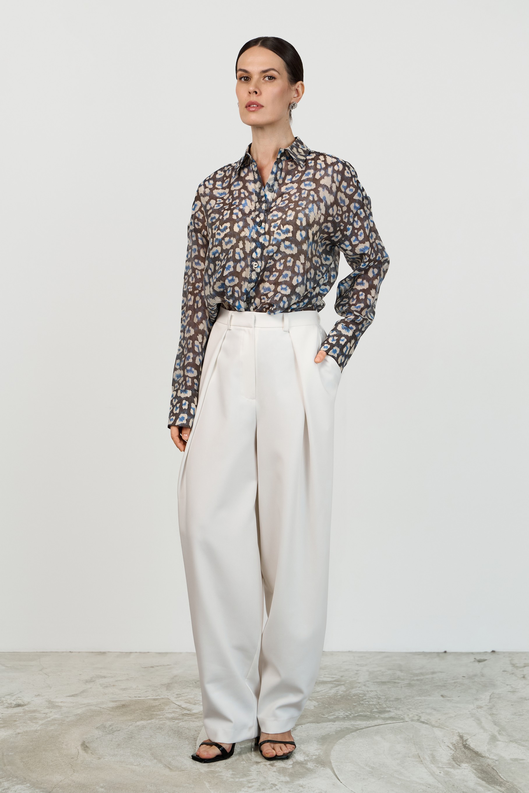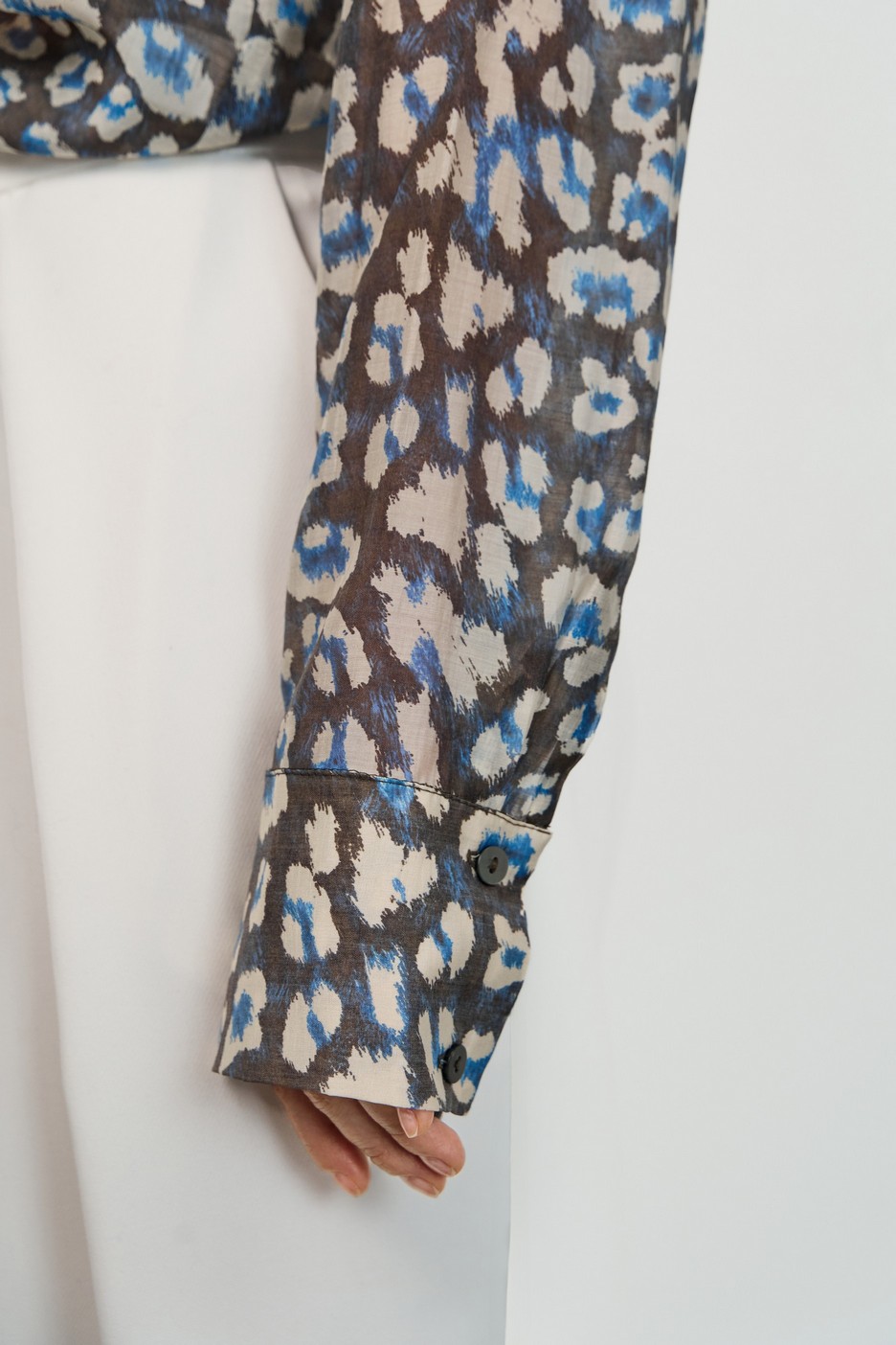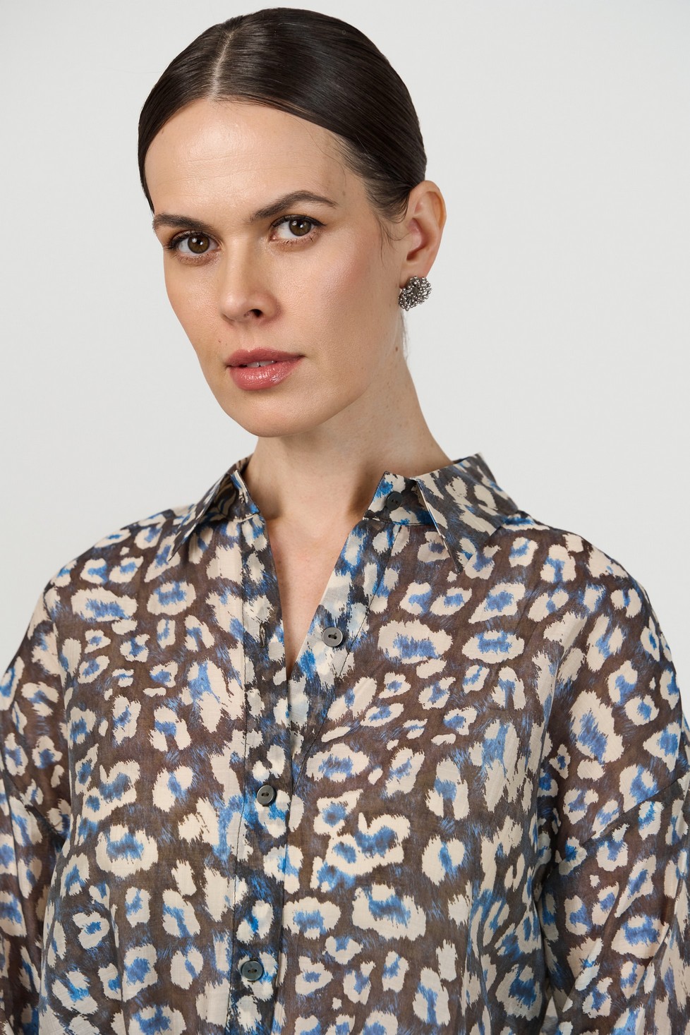 Объемная блуза-рубашка прямого силуэта со спущенной линией плеч создает мягкий, свободный силуэт. Высокие фигурные разрезы по бокам добавляют динамики и делают посадку комфортной.