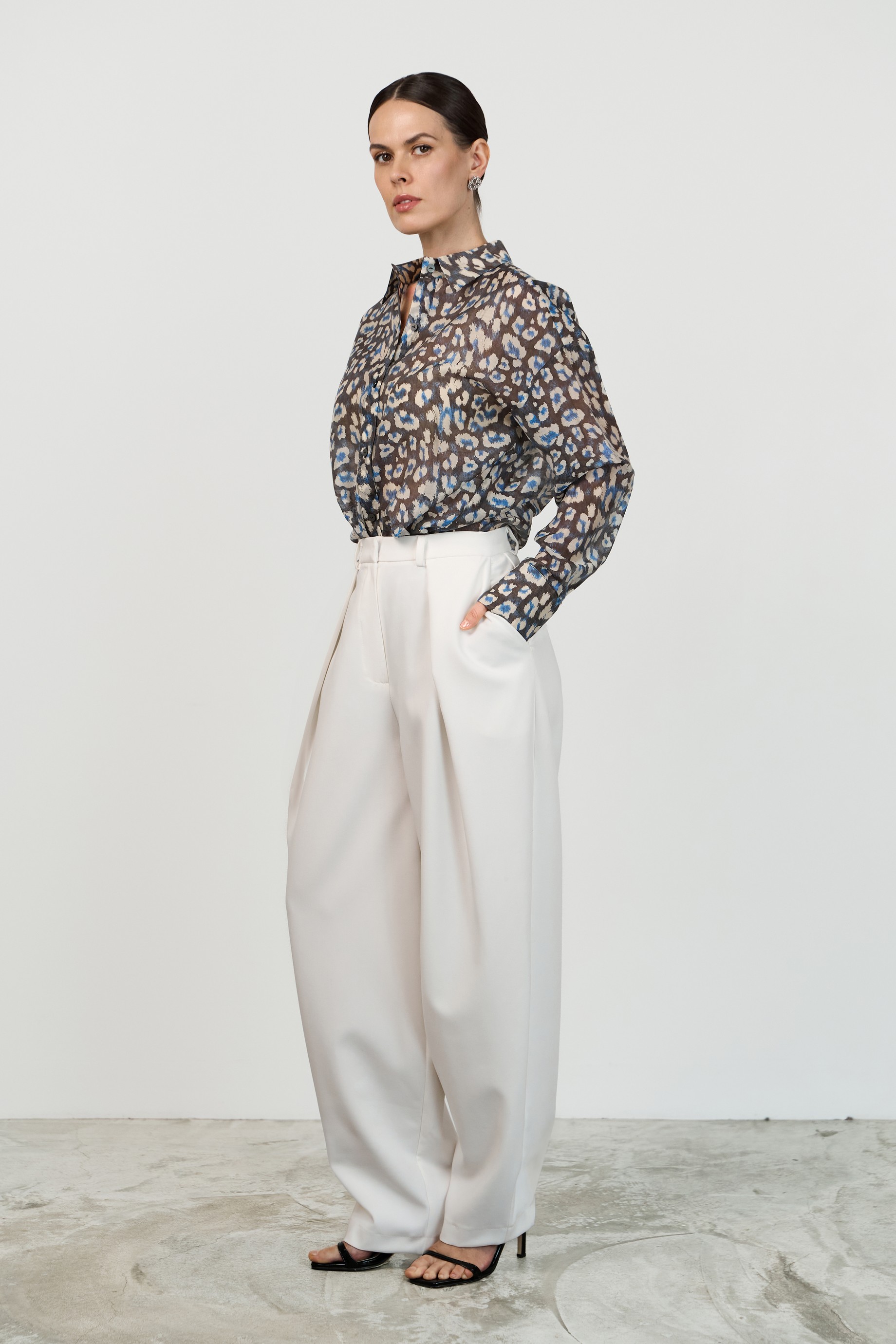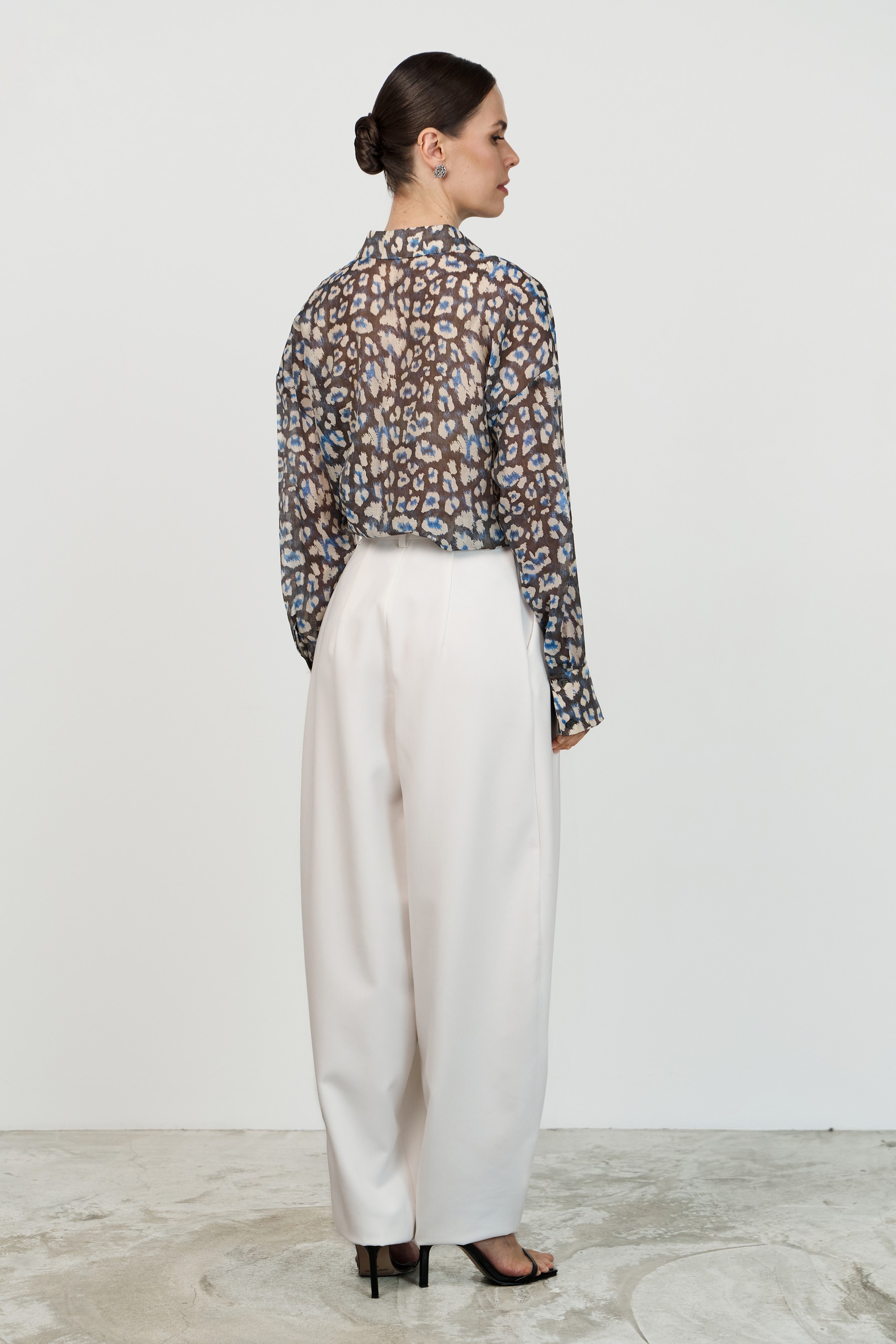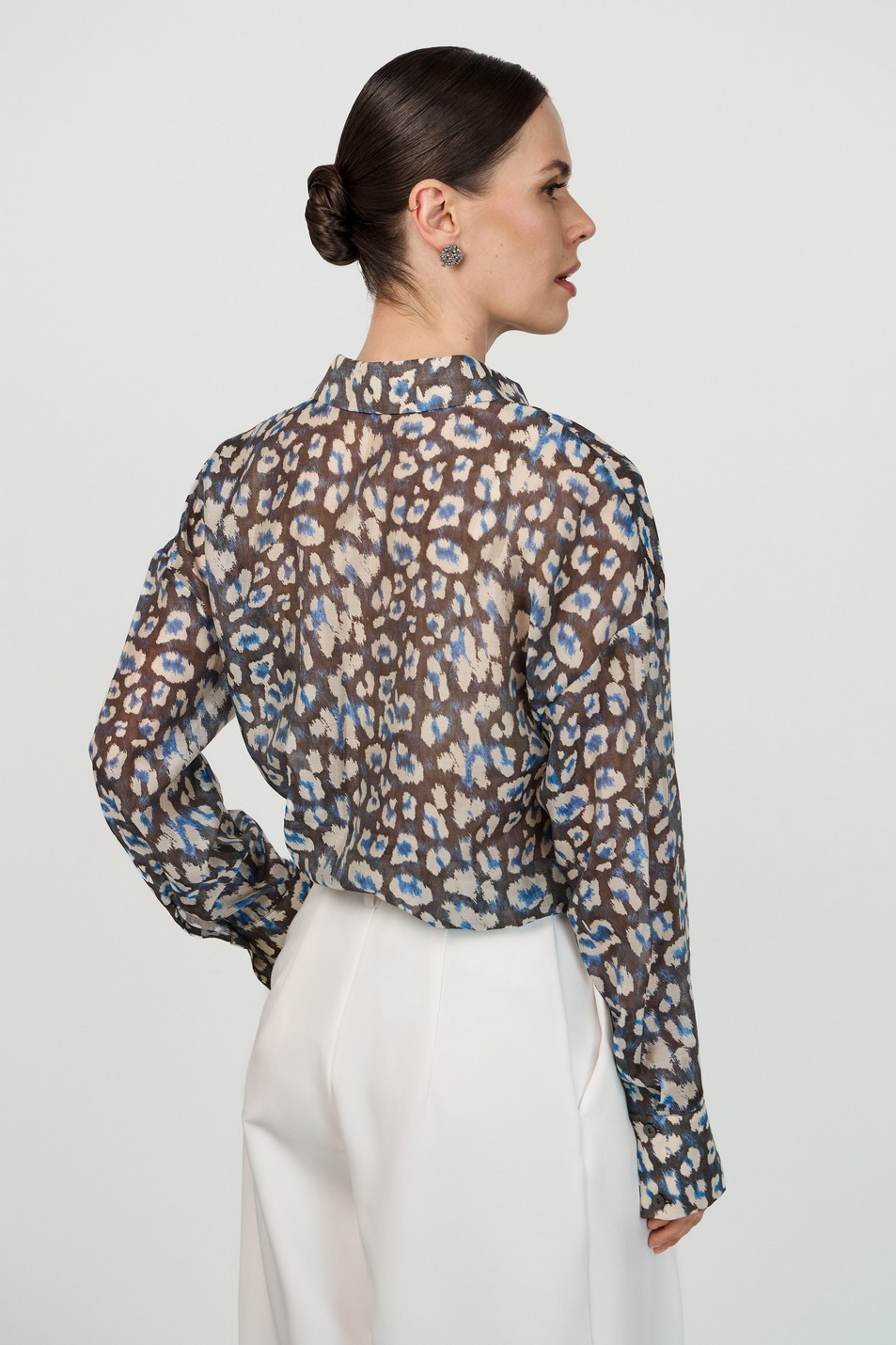Объемная блуза-рубашка прямого силуэта со спущенной линией плеч создает мягкий, свободный силуэт. Высокие фигурные разрезы по бокам добавляют динамики и делают посадку комфортной.