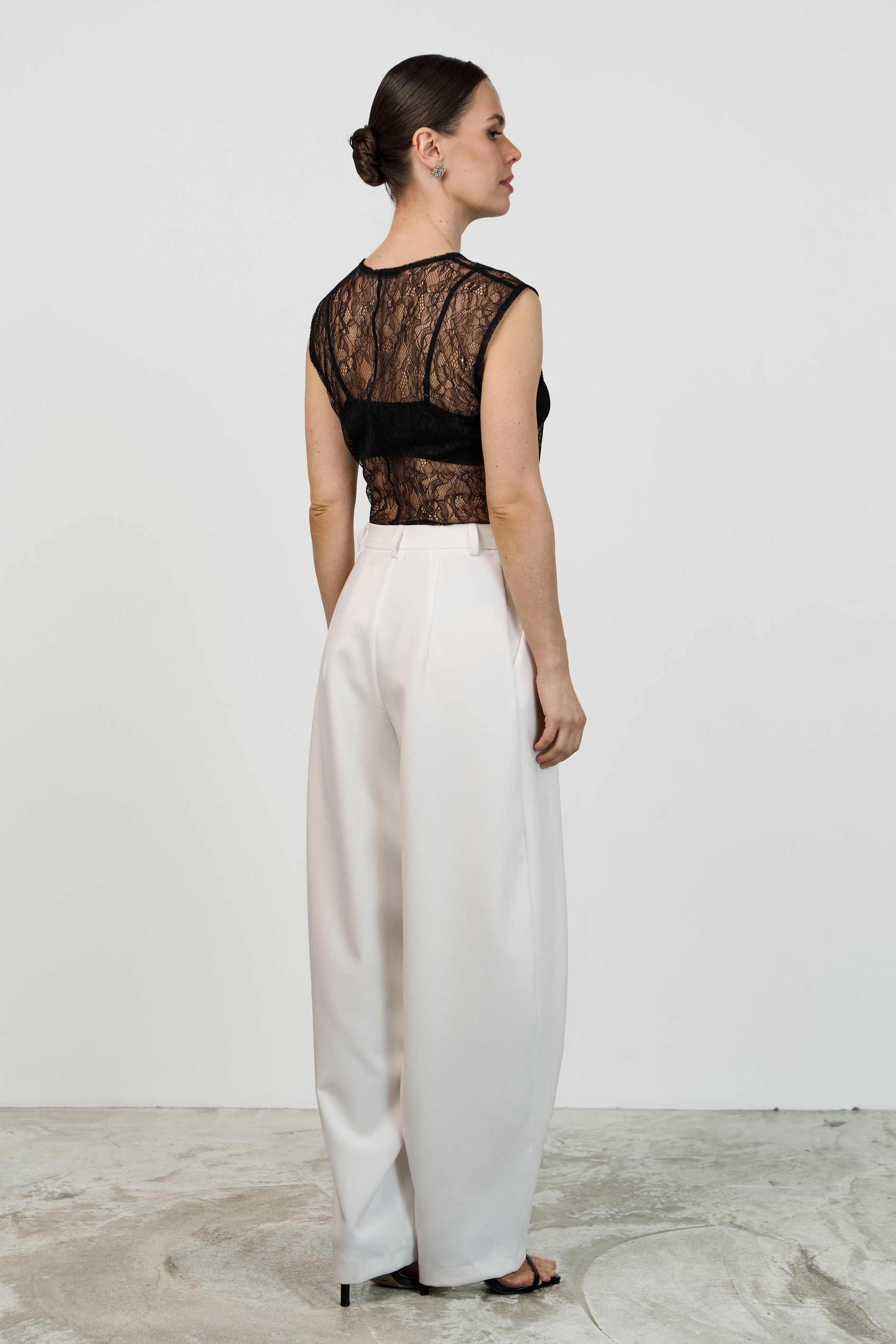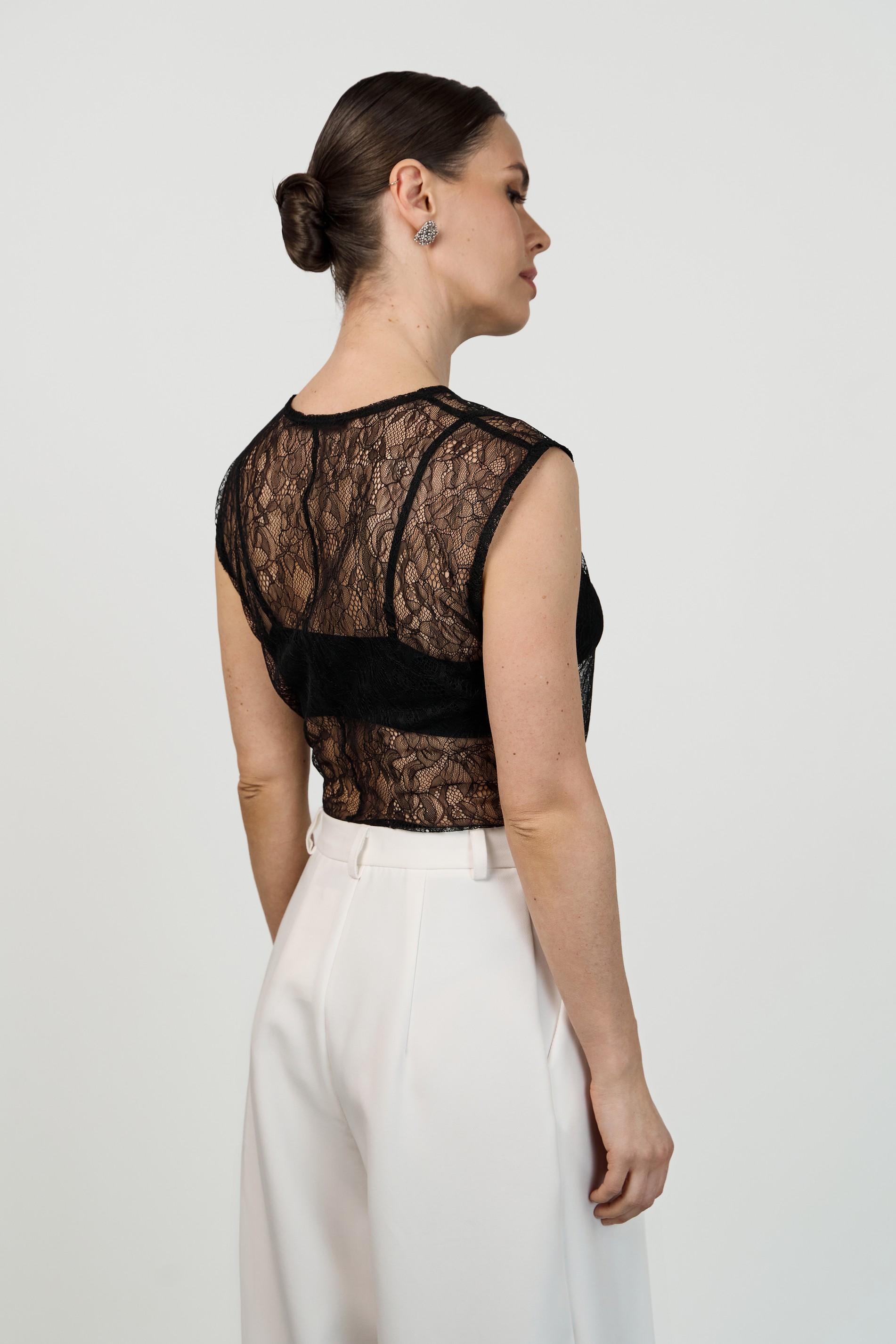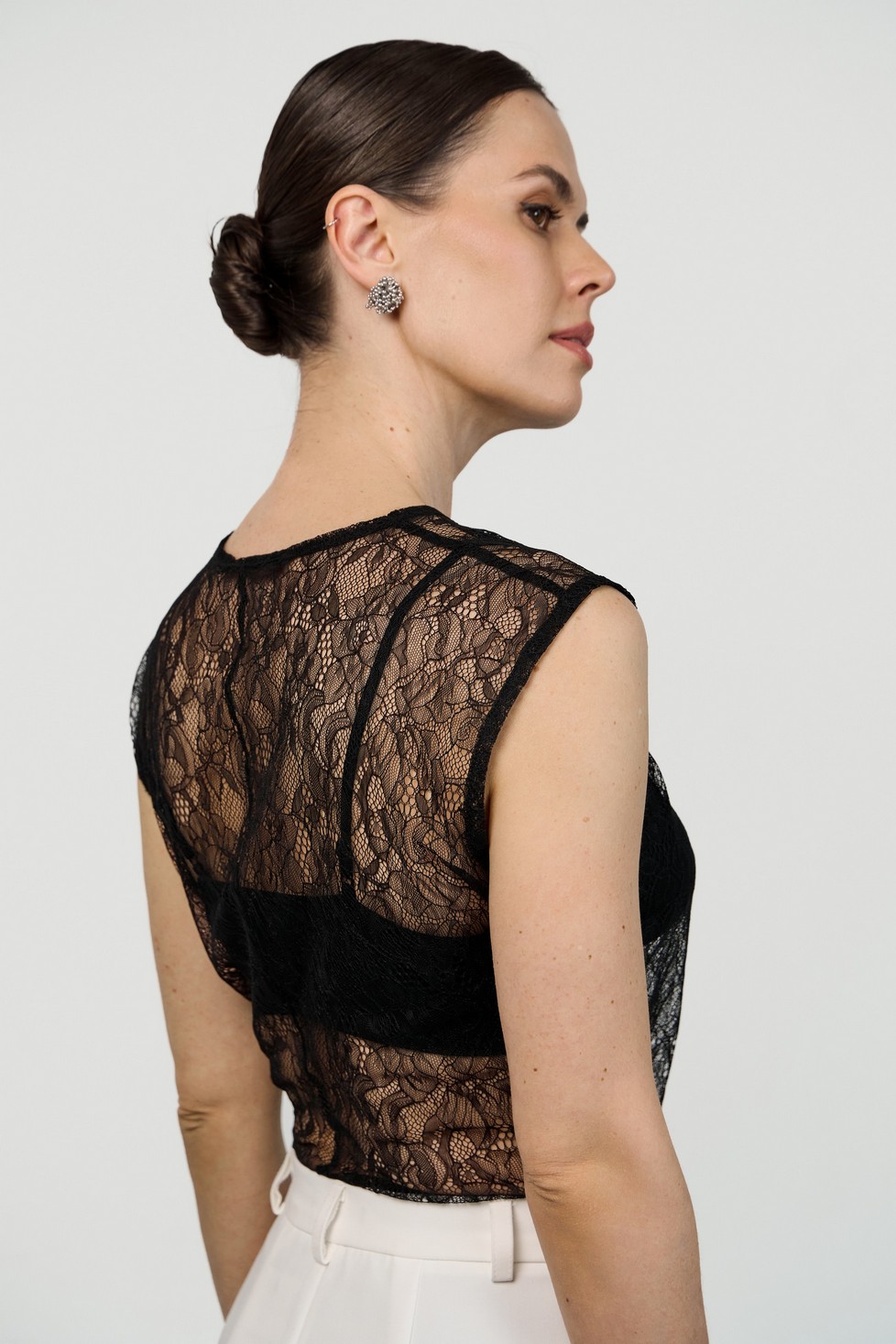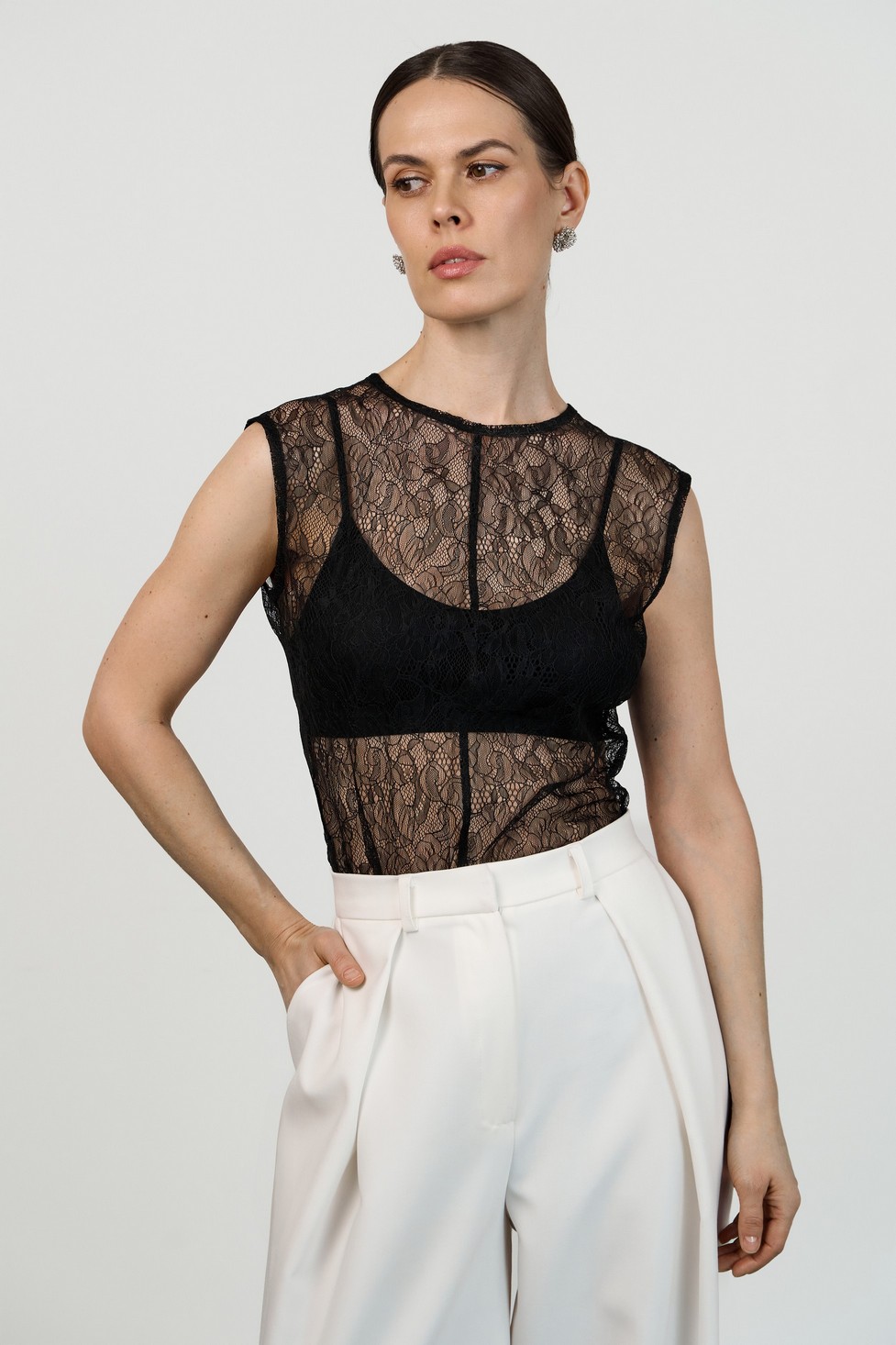 Боди из эластичного кружева с круглым вырезом без рукавов. Приталенный силуэт, малого объёма, по низу застёжка на кнопки.