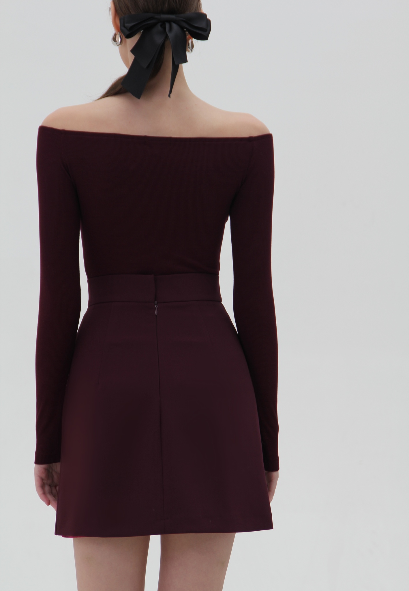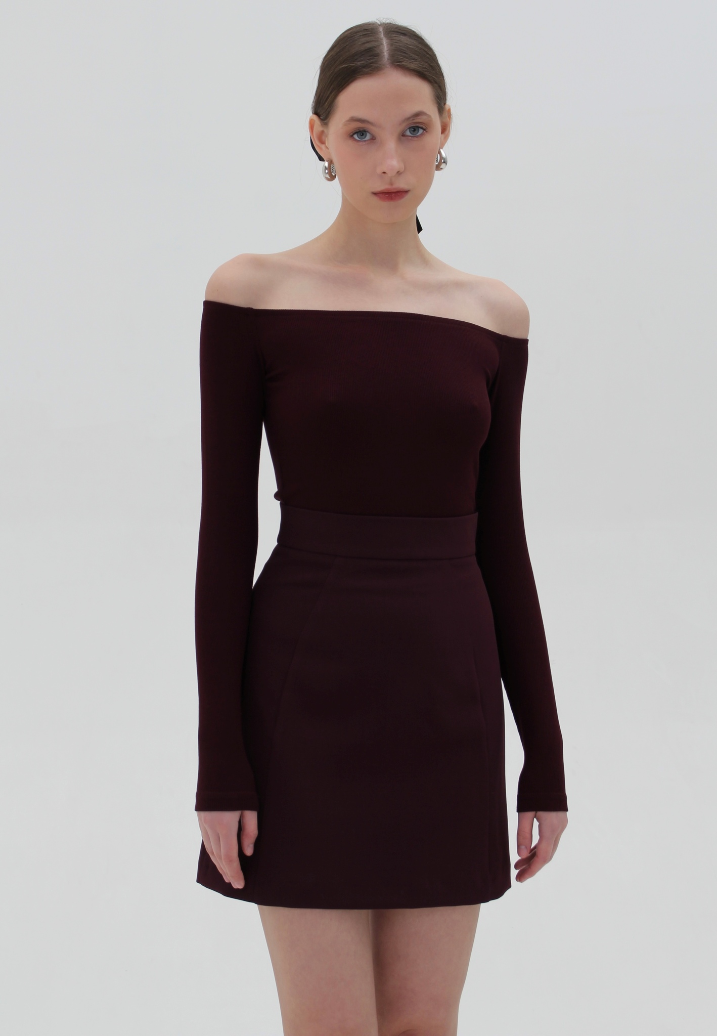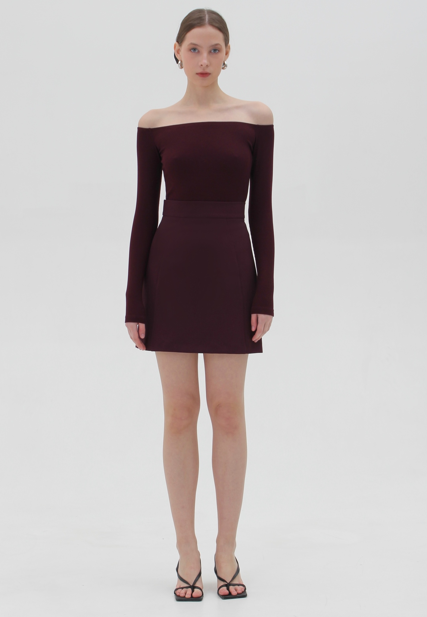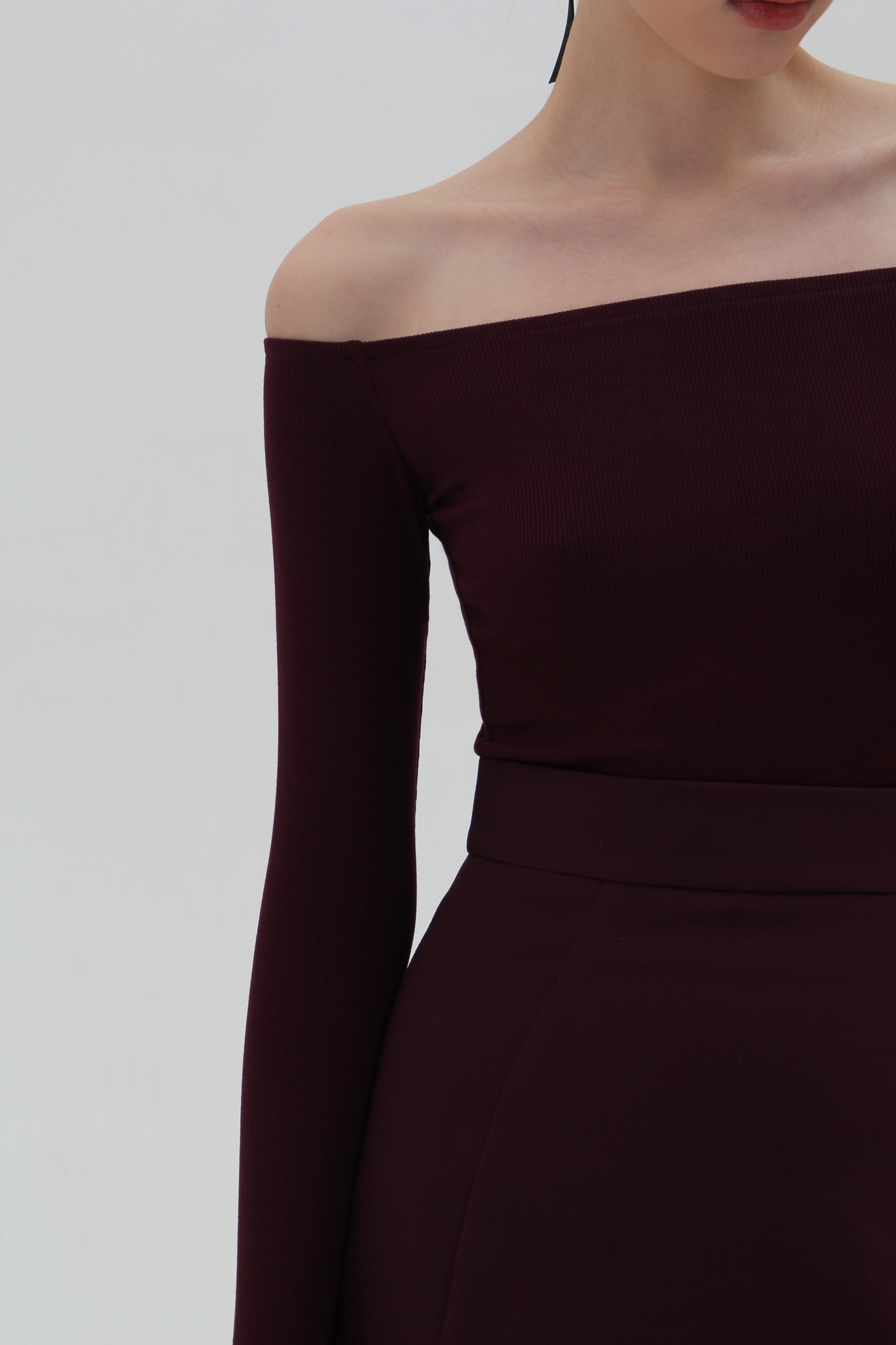 Лонгслив с открытыми плечами из мягкого эластичного трикотажа. Приталенный силуэт, малого объёма. Длинный узкий рукав.