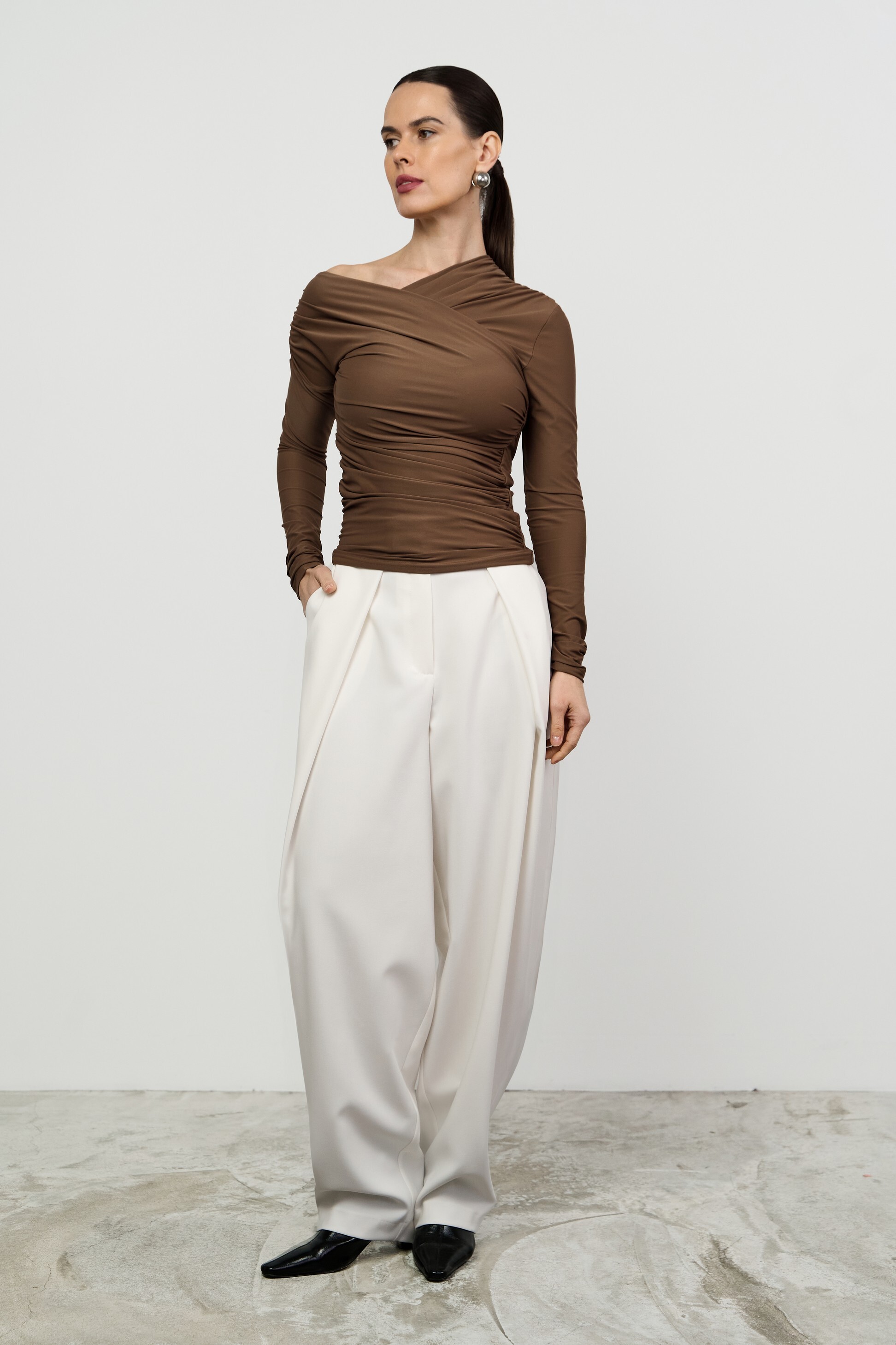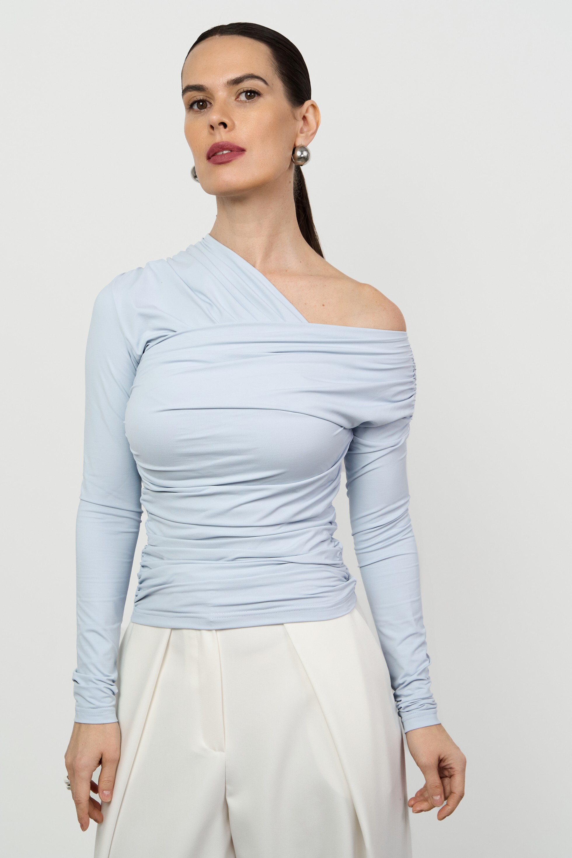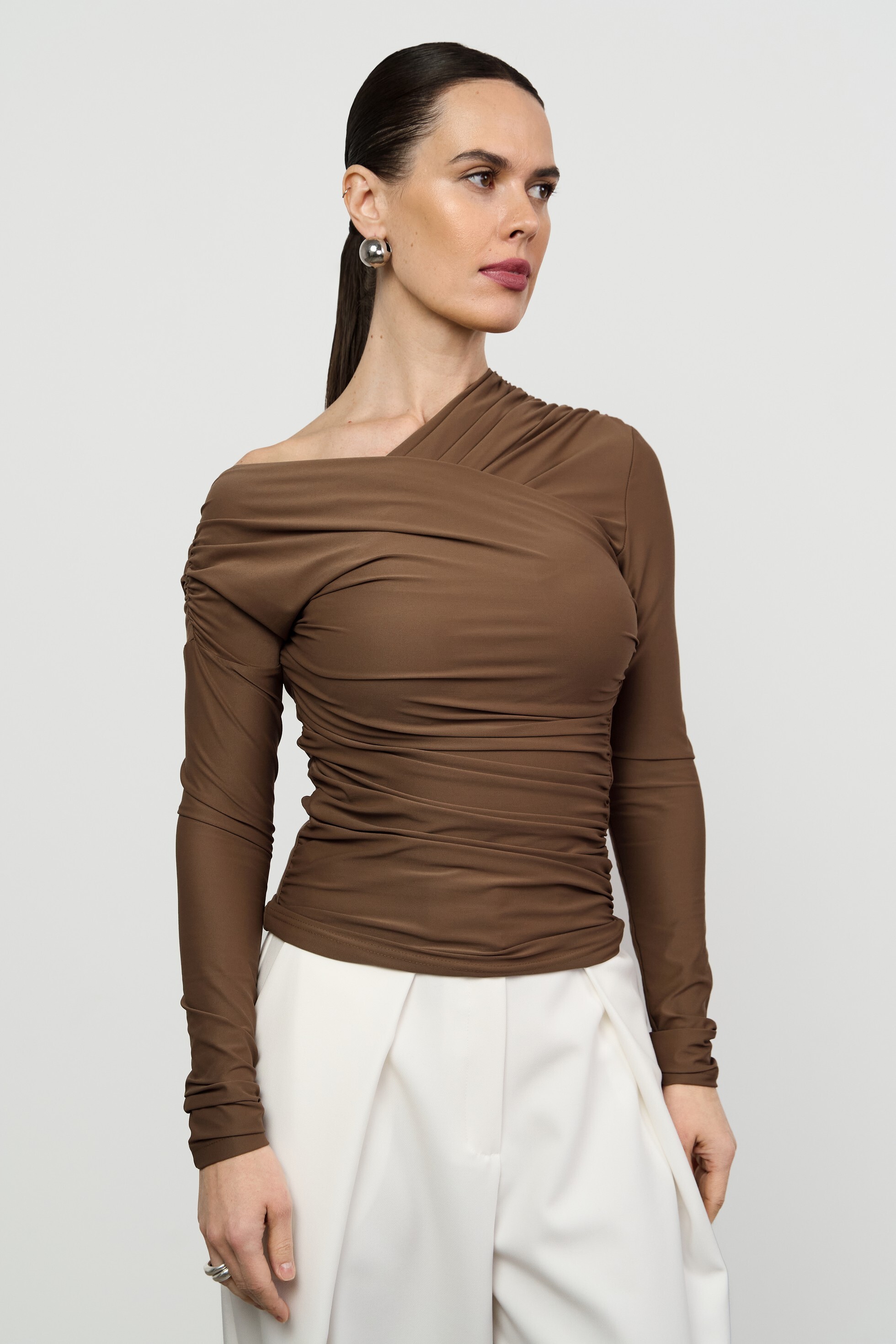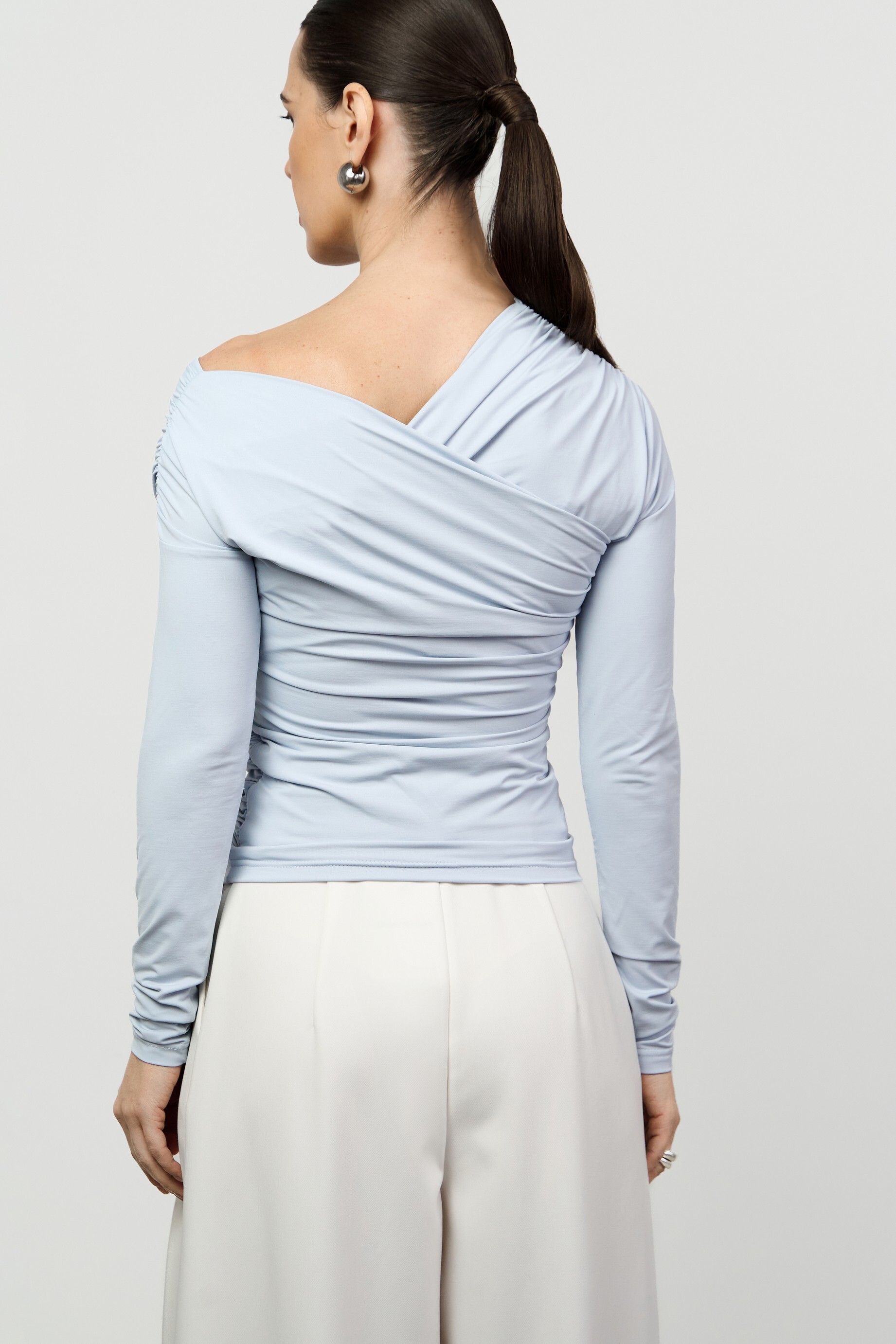 Прилегающий лонгслив малого объёма с асимметричной V-образной горловиной. Изысканность модели подчеркивает сочетание драпировки и открытого плеча.