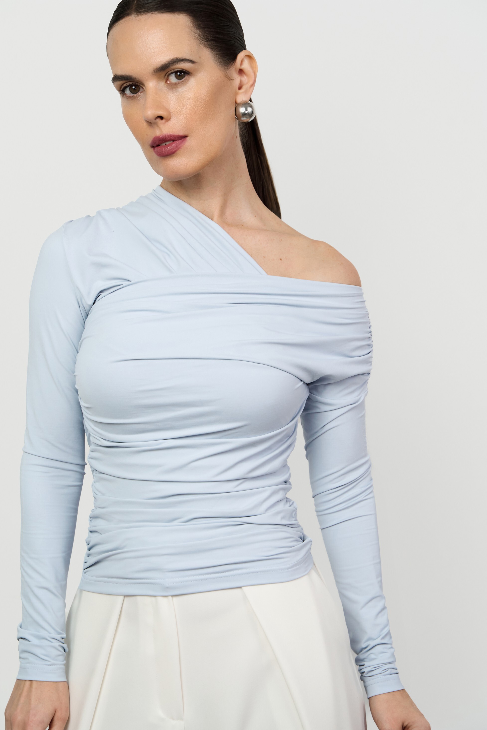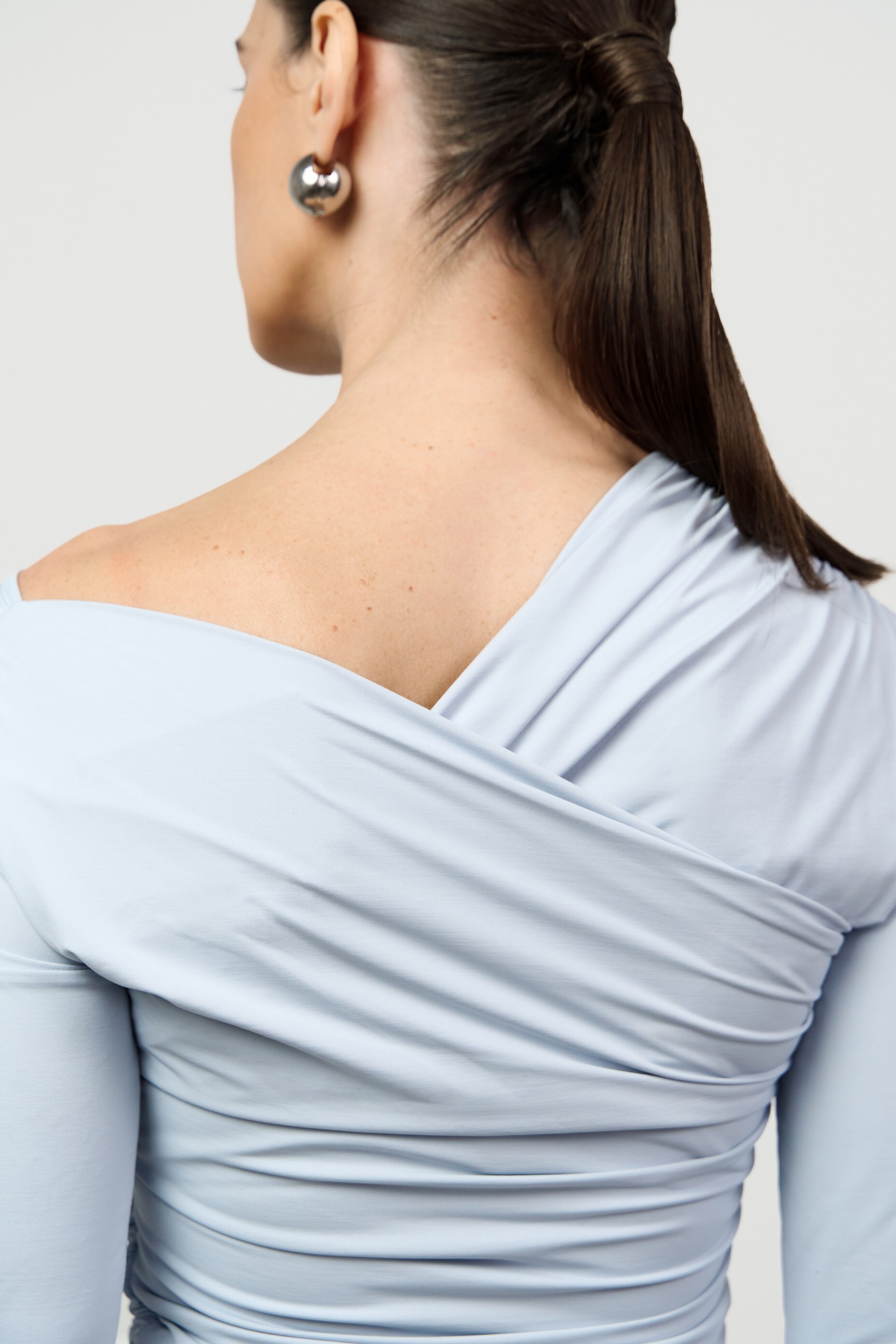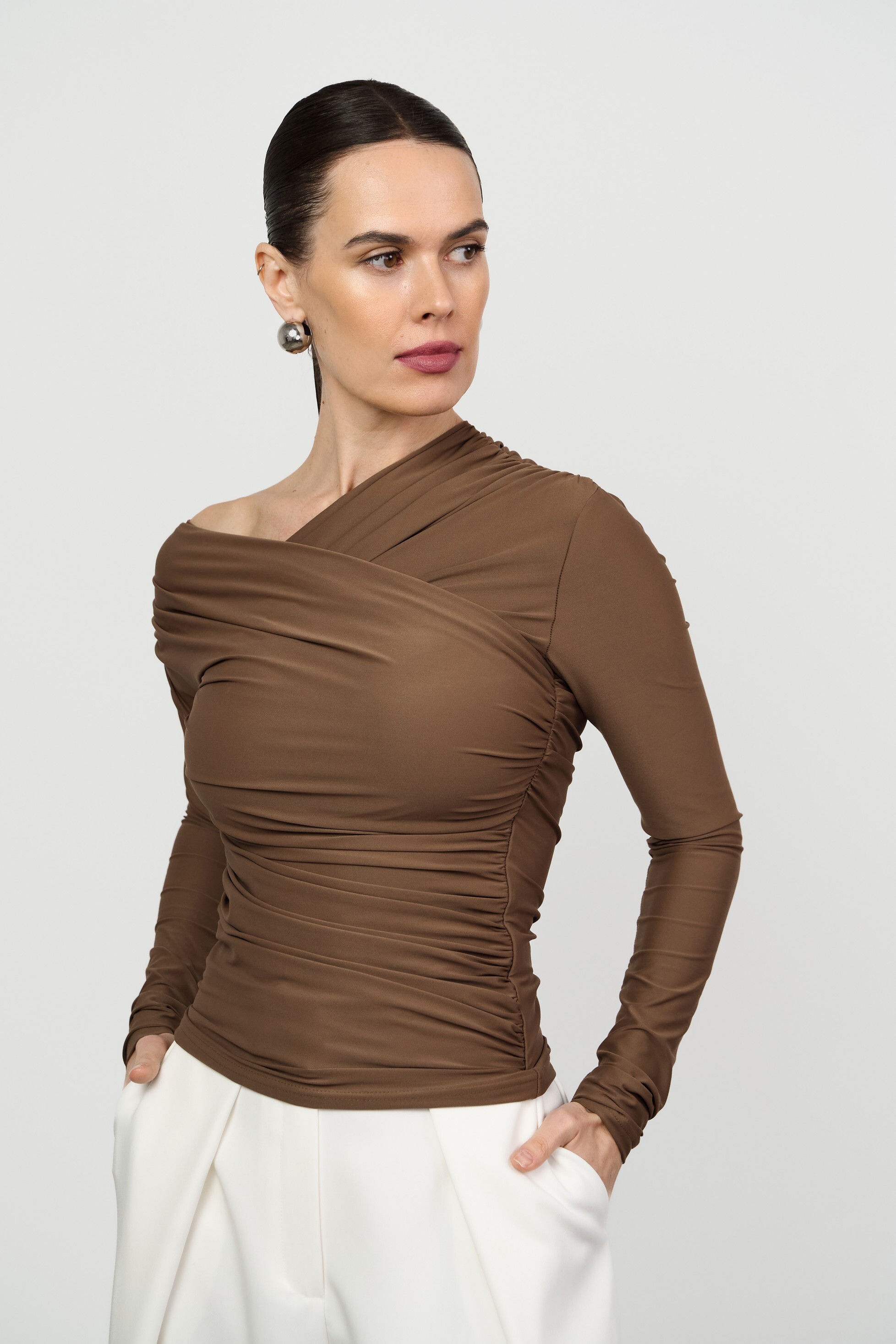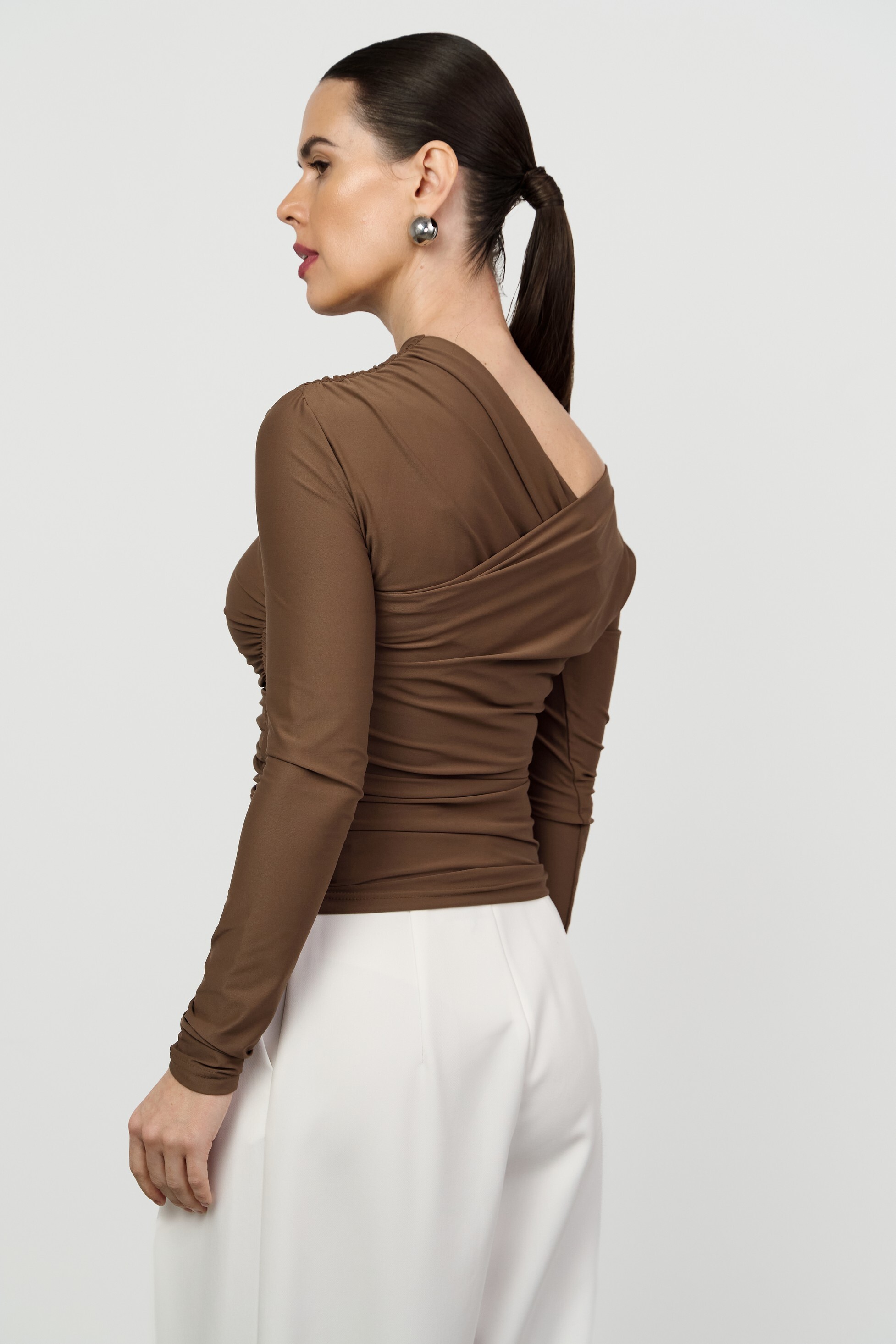 Прилегающий лонгслив малого объёма с асимметричной V-образной горловиной. Изысканность модели подчеркивает сочетание драпировки и открытого плеча.