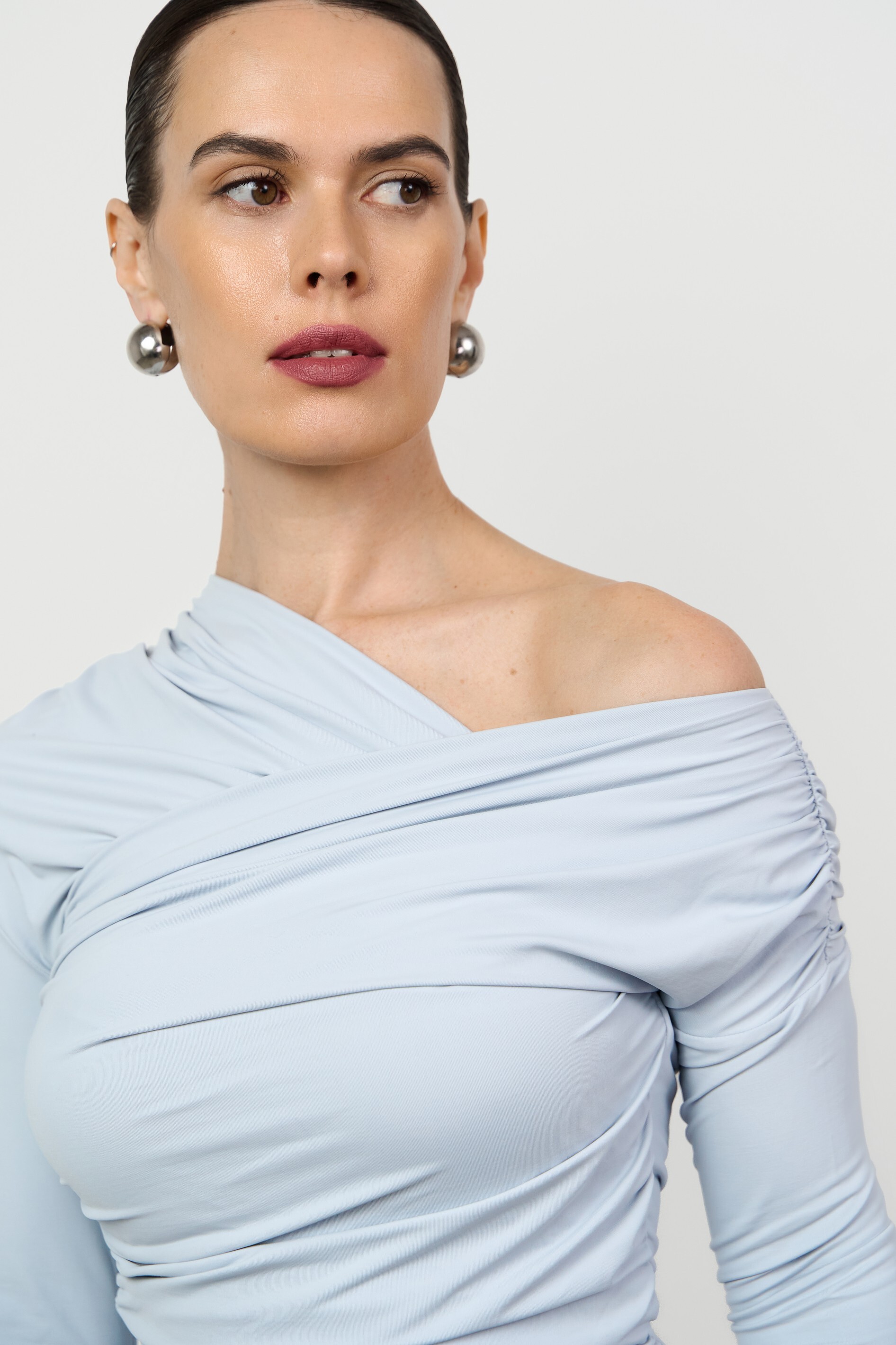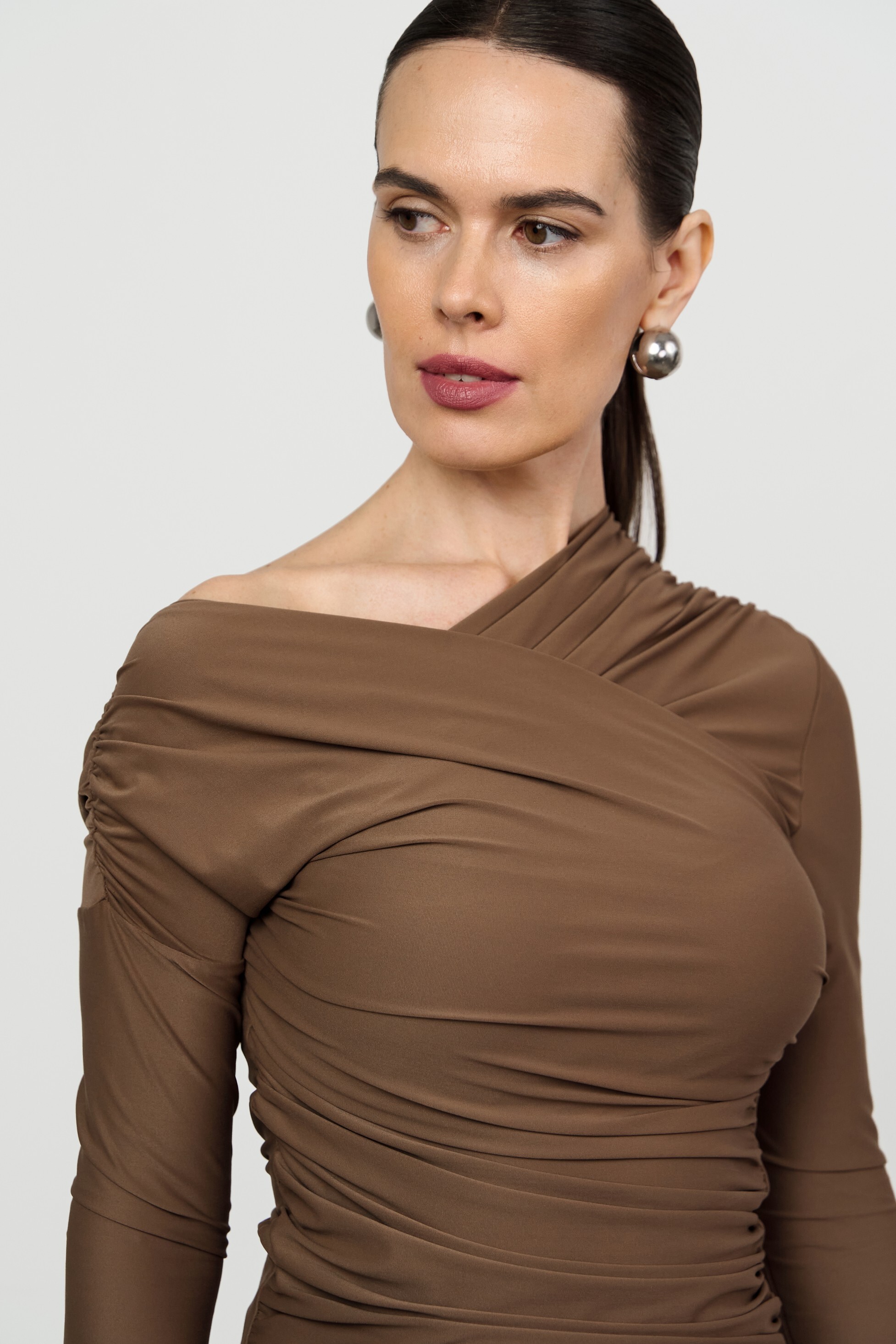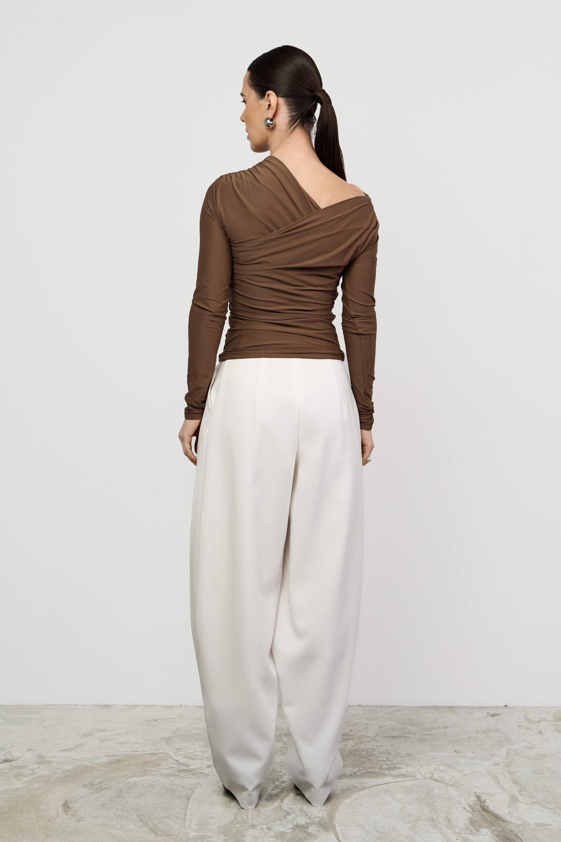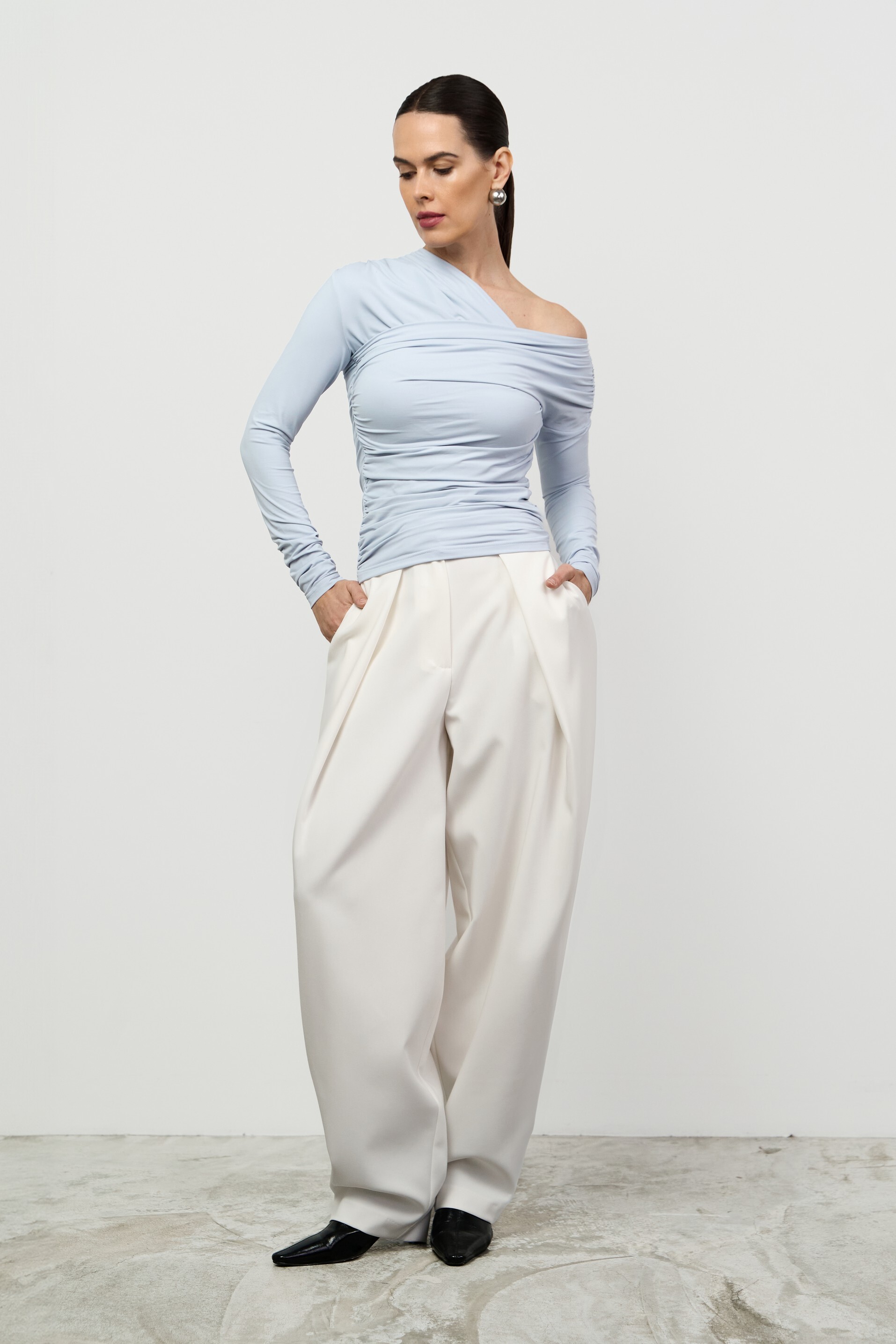 Прилегающий лонгслив малого объёма с асимметричной V-образной горловиной. Изысканность модели подчеркивает сочетание драпировки и открытого плеча.