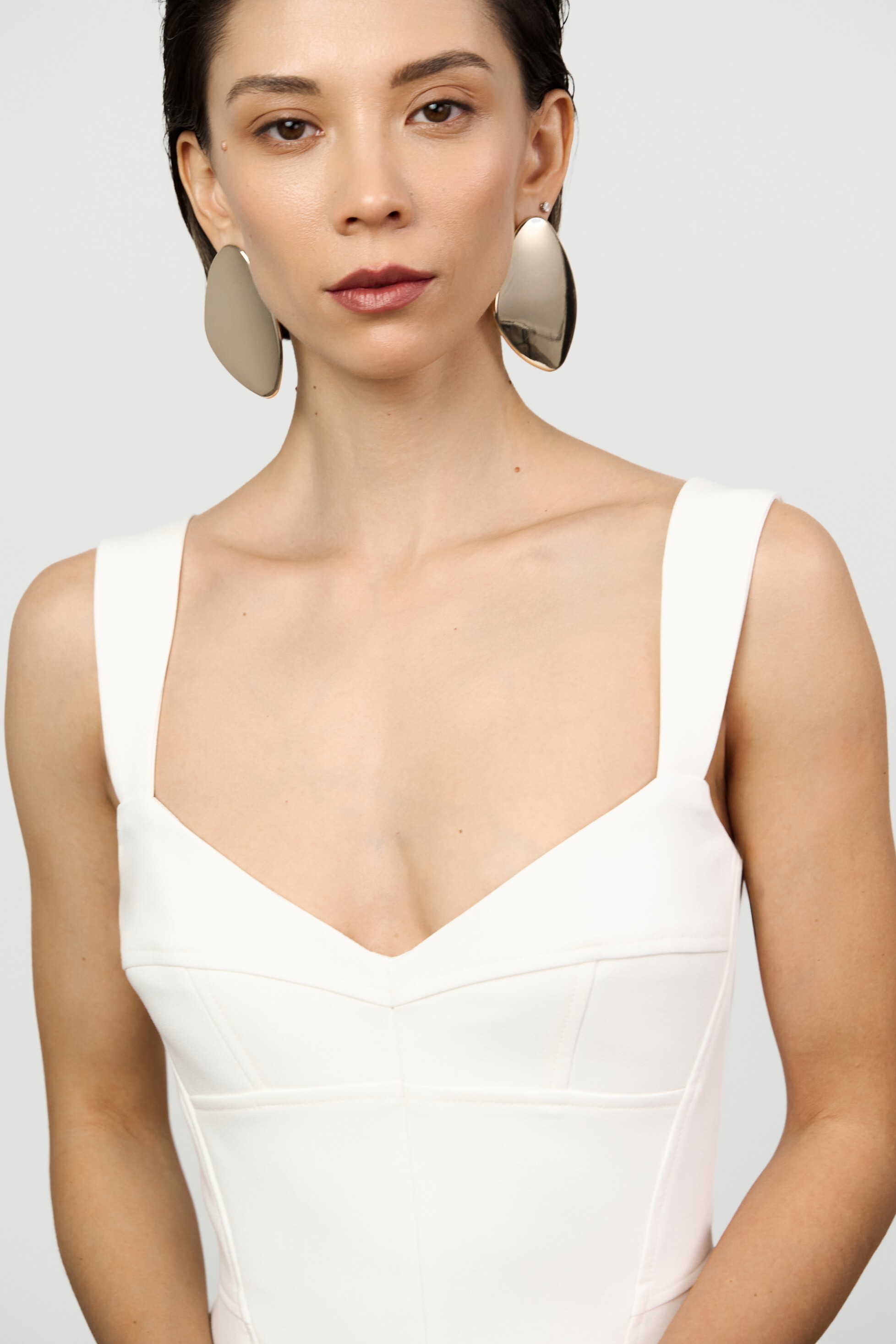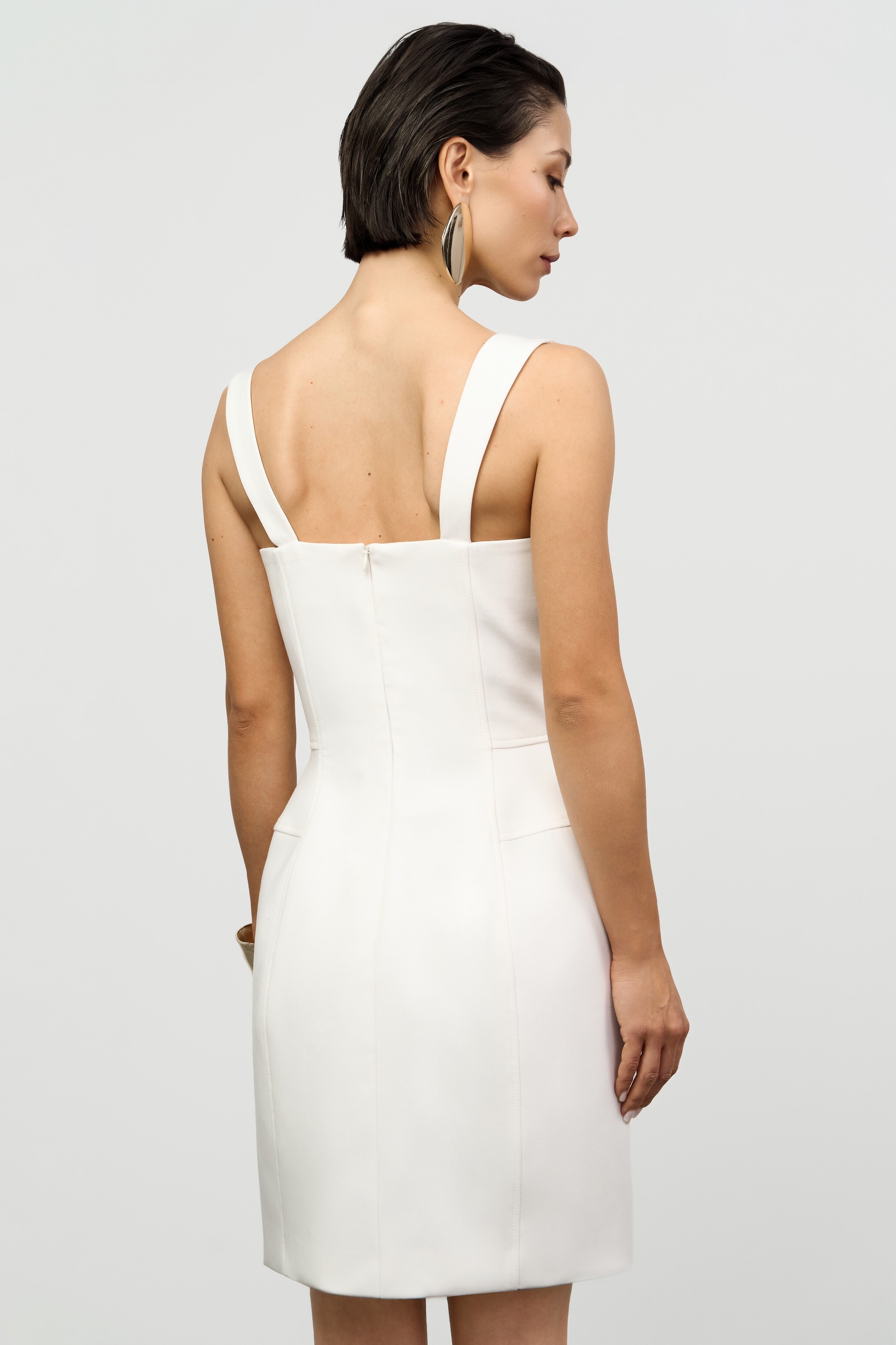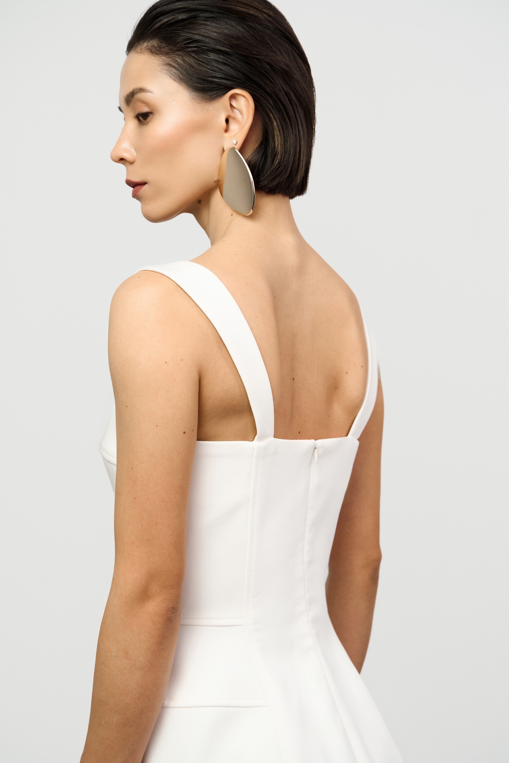 Платье-сарафан силуэта «песочные часы» с широкими бретелями подчёркивает талию и изящно расширяется на бёдрах. Модель на подкладке, лаконичный крой и застежка на потайную молнию.