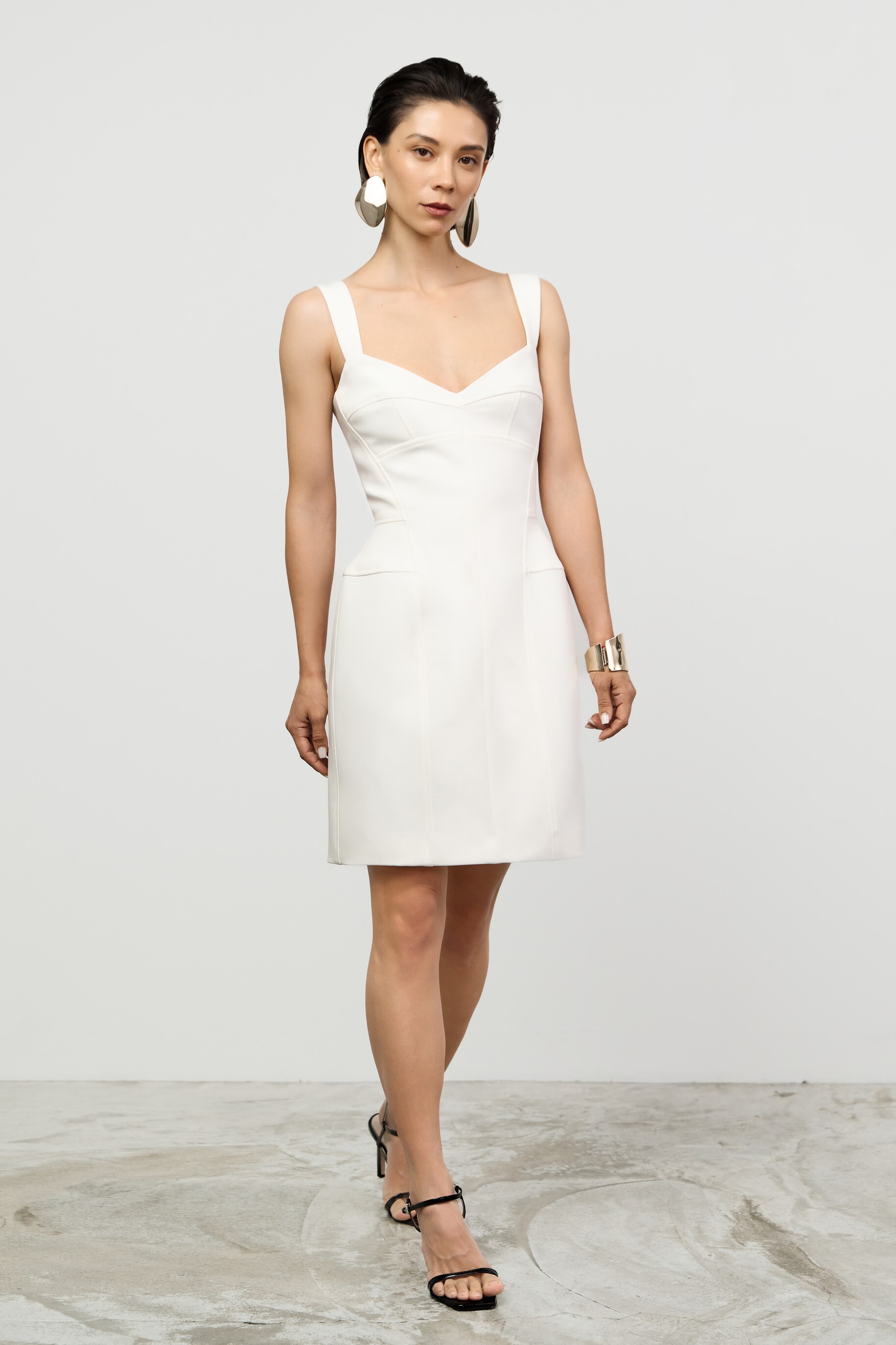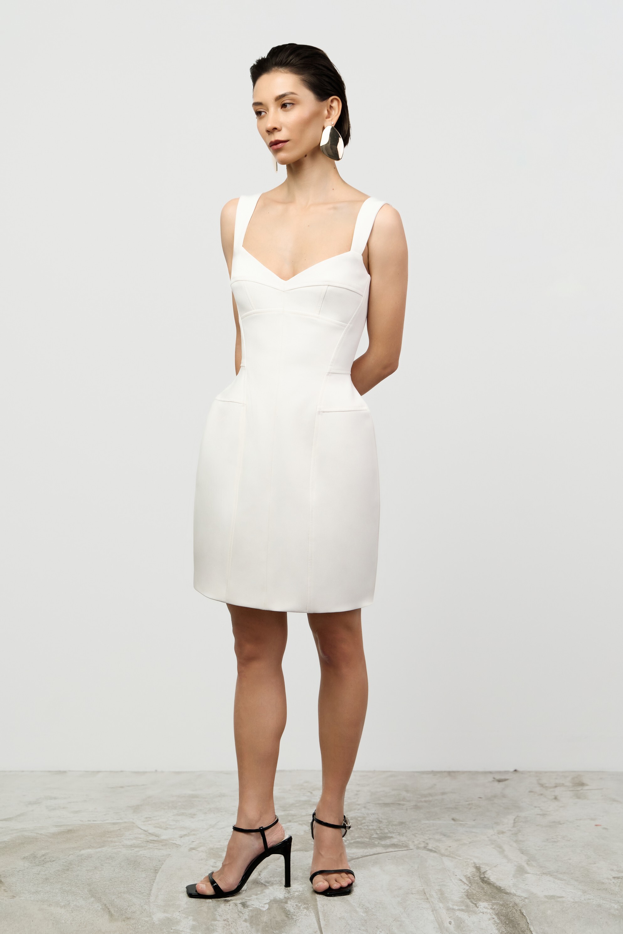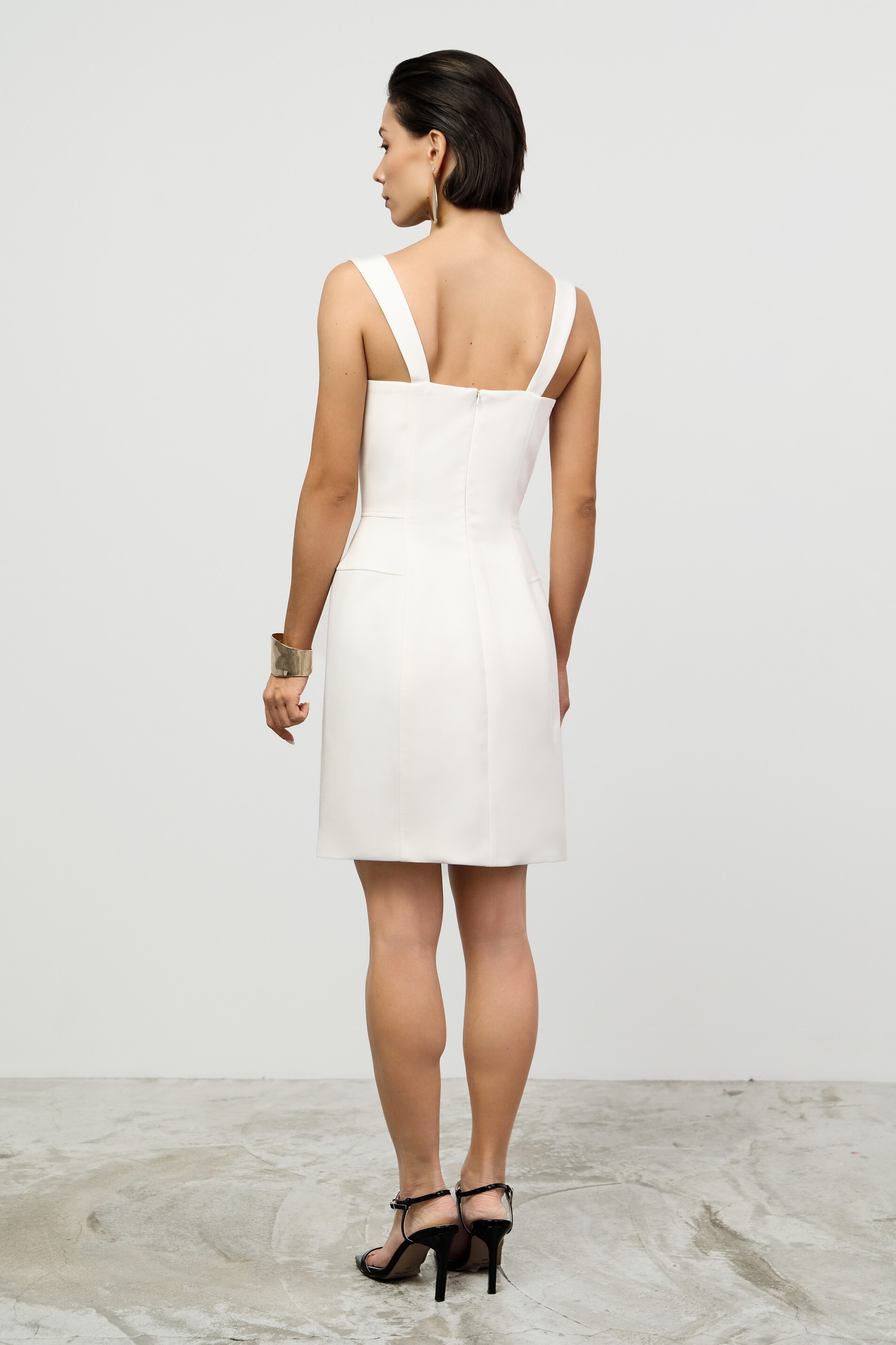 Платье-сарафан силуэта «песочные часы» с широкими бретелями подчёркивает талию и изящно расширяется на бёдрах. Модель на подкладке, лаконичный крой и застежка на потайную молнию.