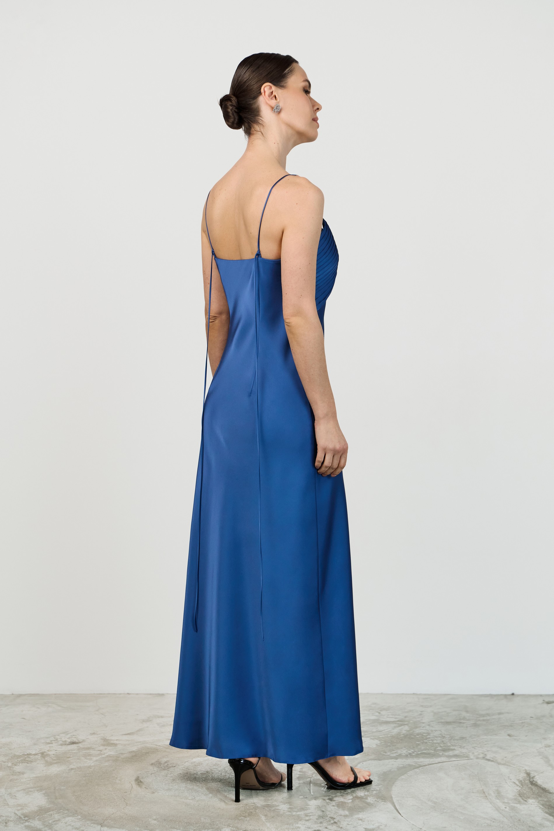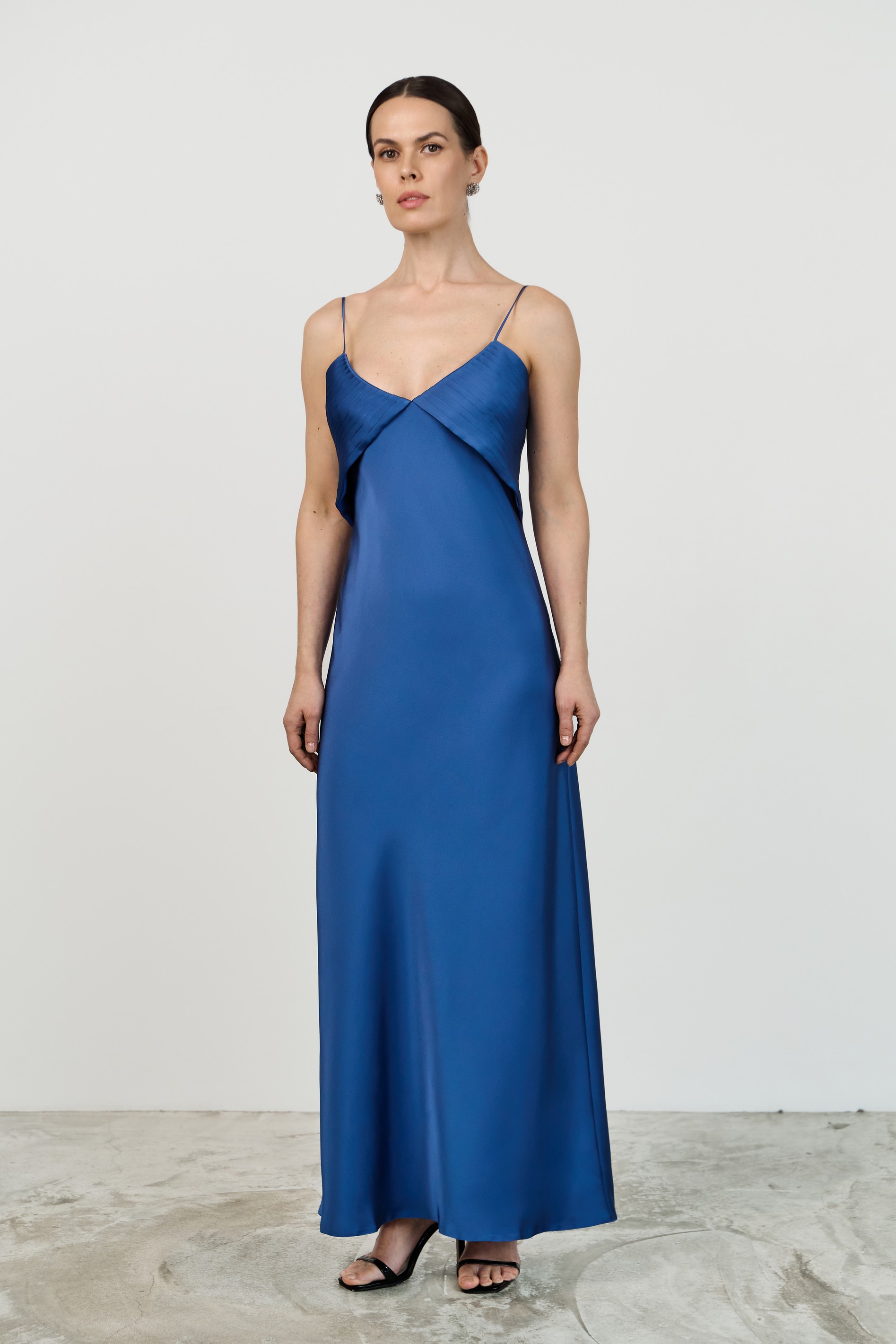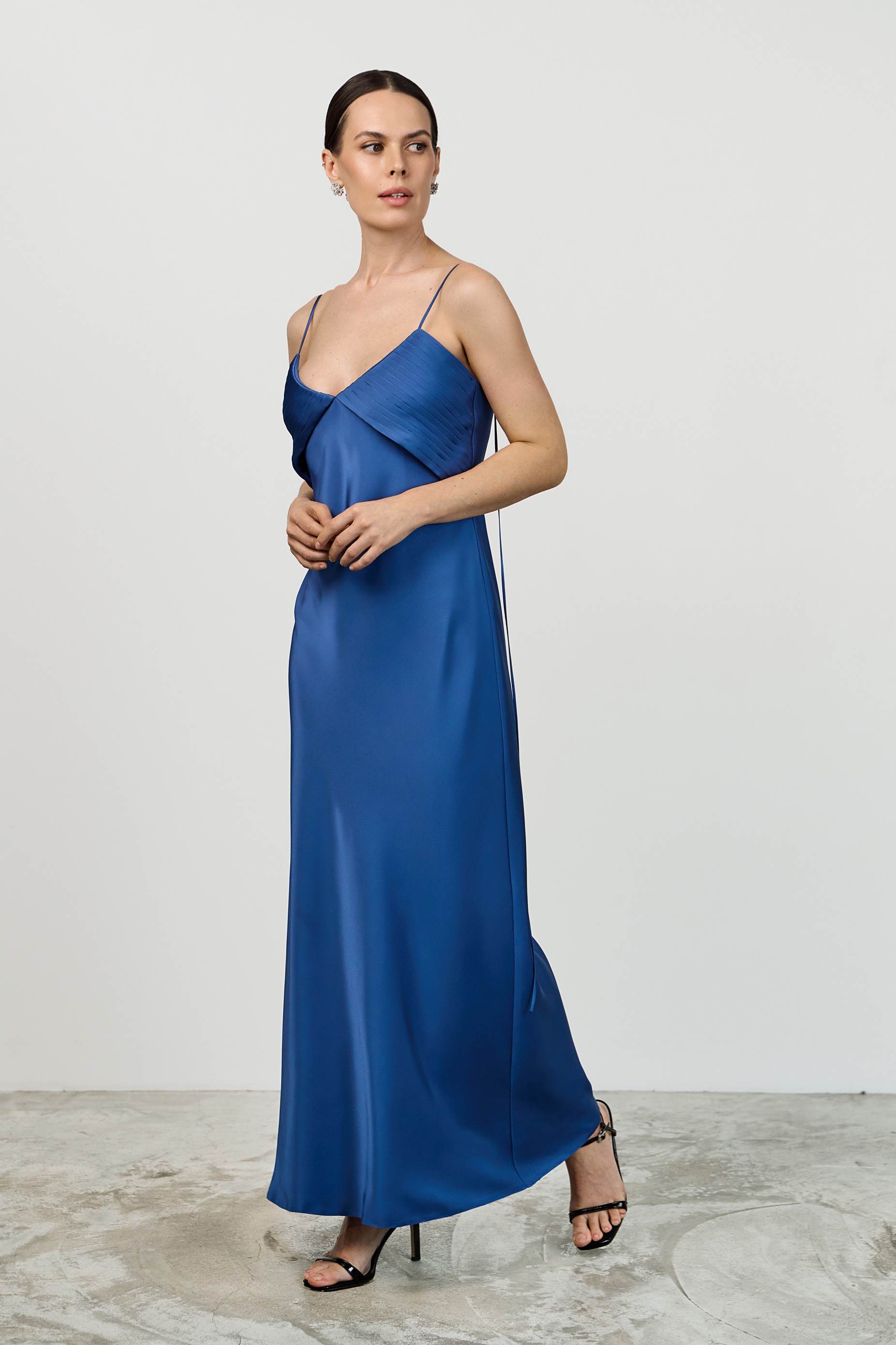Платье‑комбинация в длине макси с полуприлегающим силуэтом мягко расклёшено к низу. V‑образное декольте, украшенное драпировками на отлётной кокетке, и длинная бретель‑шнурок добавляют модели индивидуальности. Модель на подкладке, крой по косой.