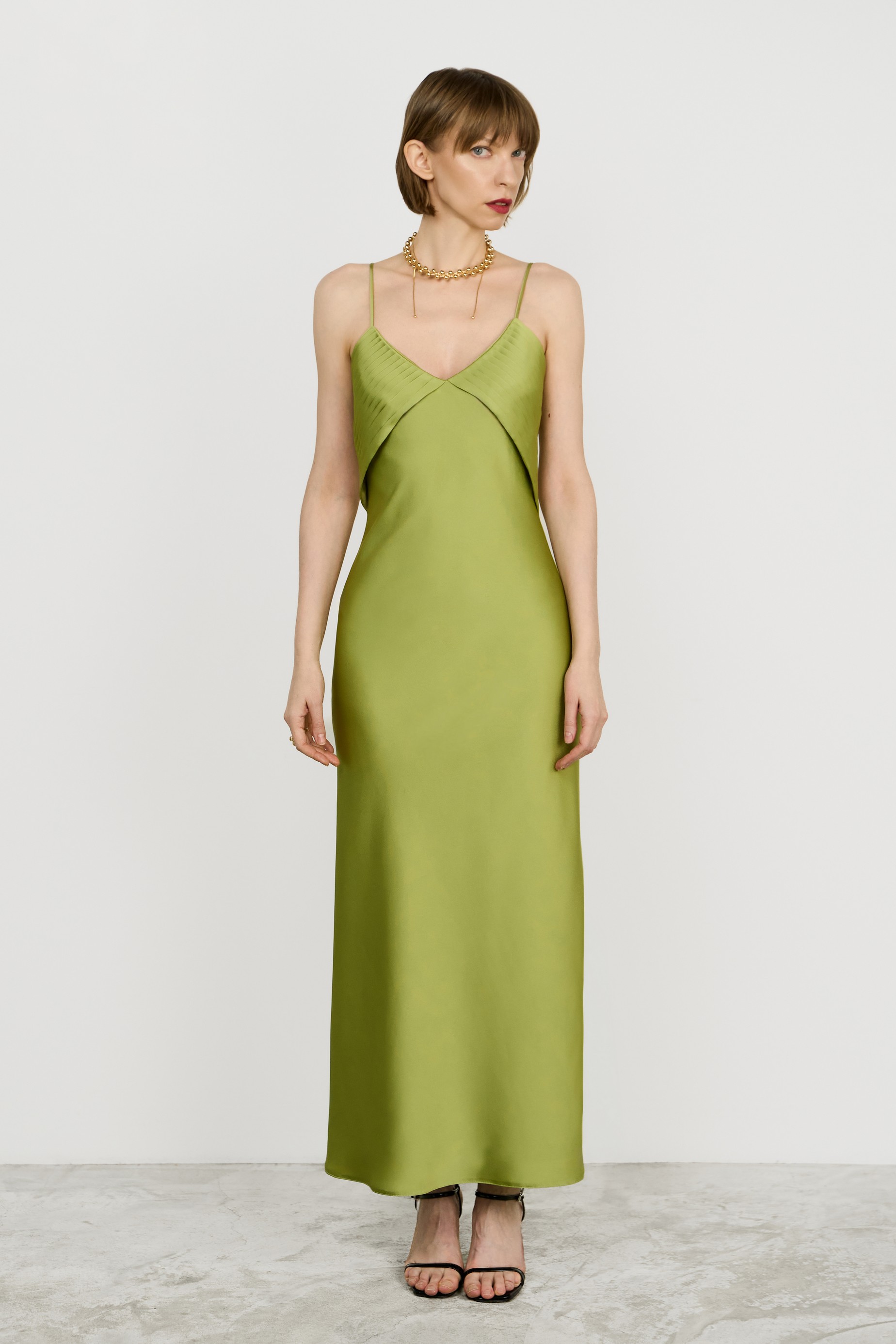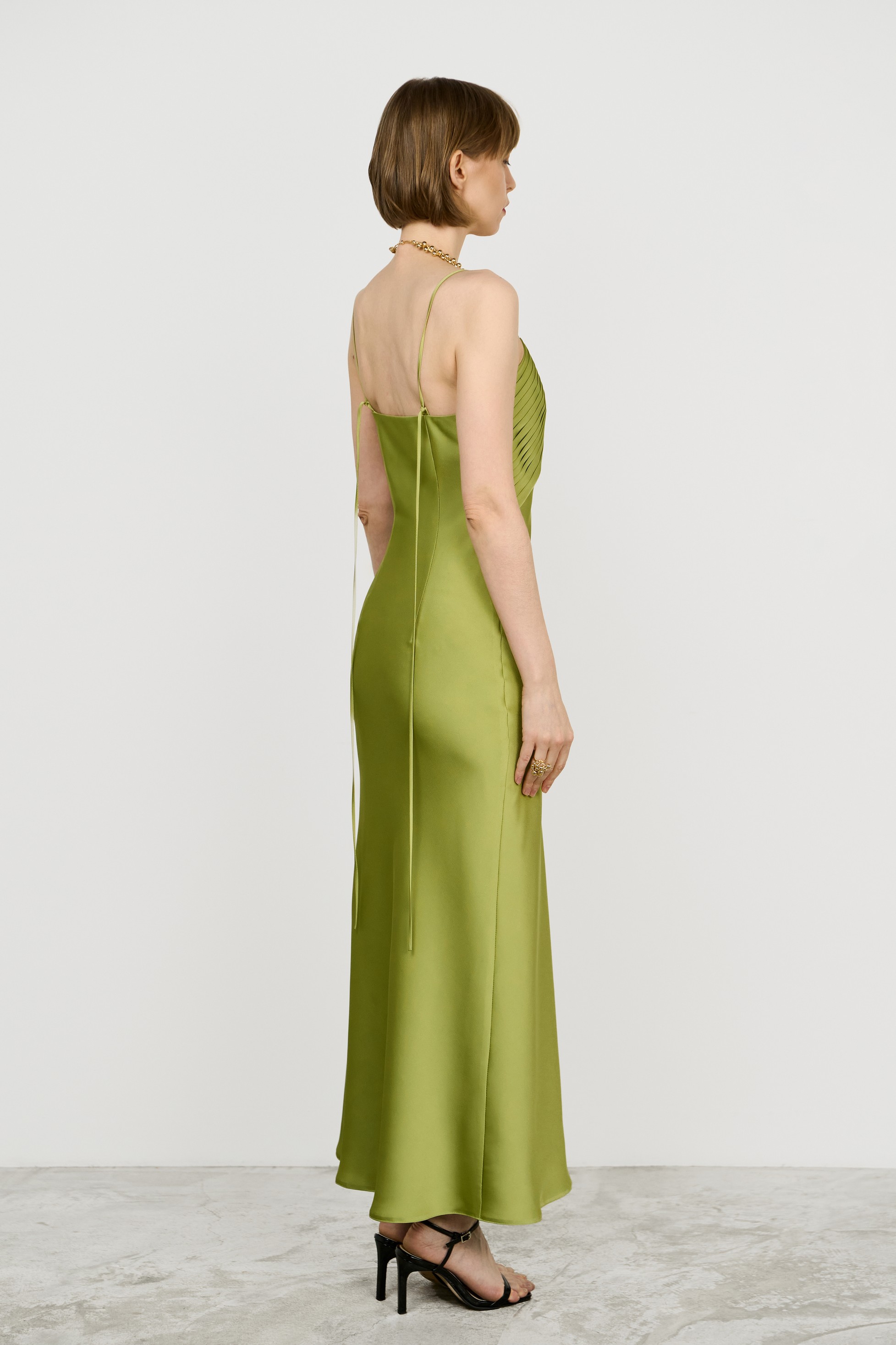 Платье‑комбинация в длине макси с полуприлегающим силуэтом мягко расклёшено к низу. V‑образное декольте, украшенное драпировками на отлётной кокетке, и длинная бретель‑шнурок добавляют модели индивидуальности. Модель на подкладке, крой по косой.