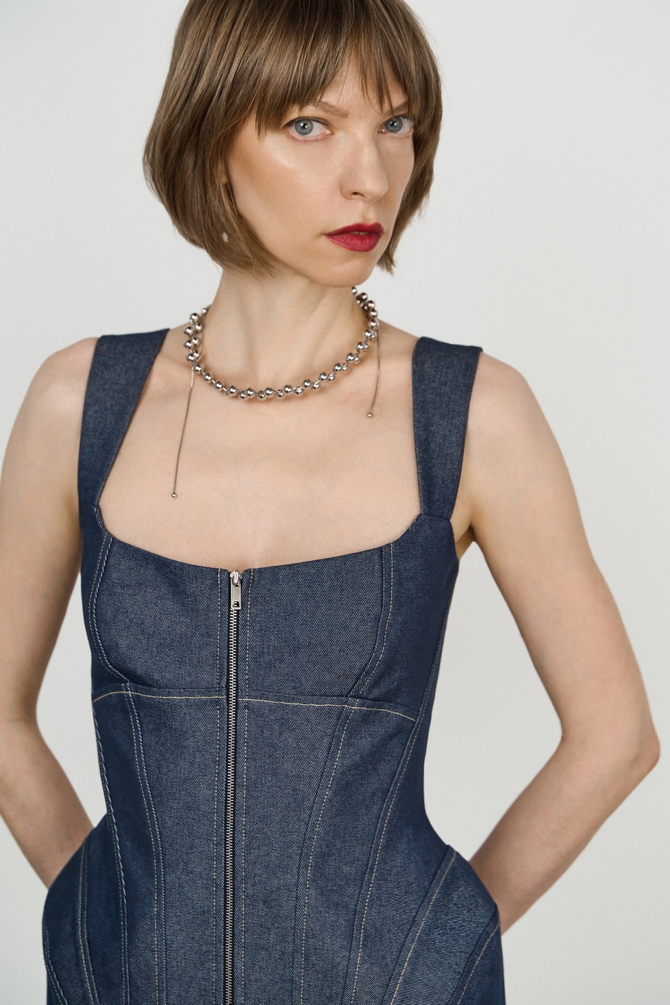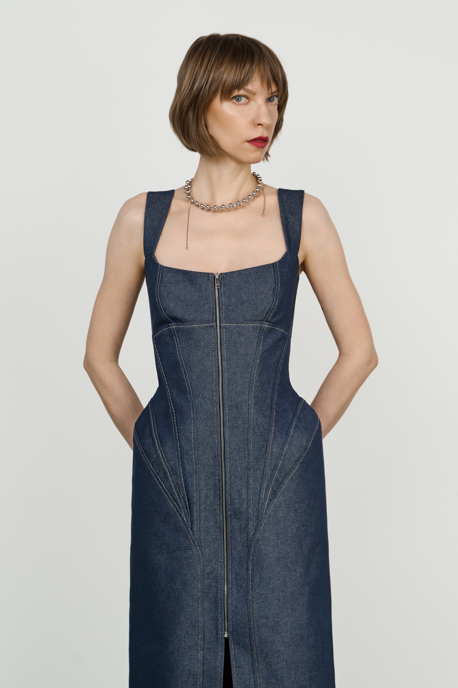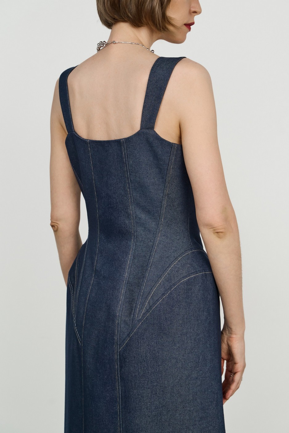 Платье-корсет с выразительным силуэтом и продуманной конструкцией — акцентная модель, подчёркивающая фигуру. Лиф с квадратным декольте и отрезной чашкой формирует чёткую линию верха, а широкие фигурные бретели мягко расширяются к плечу, добавляя образу выразительности.