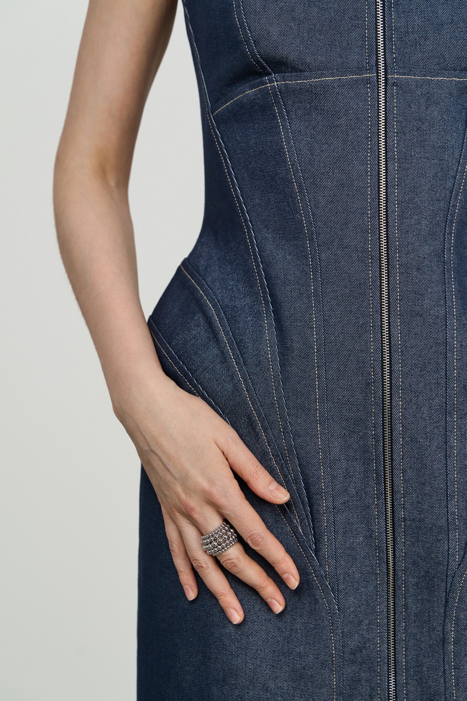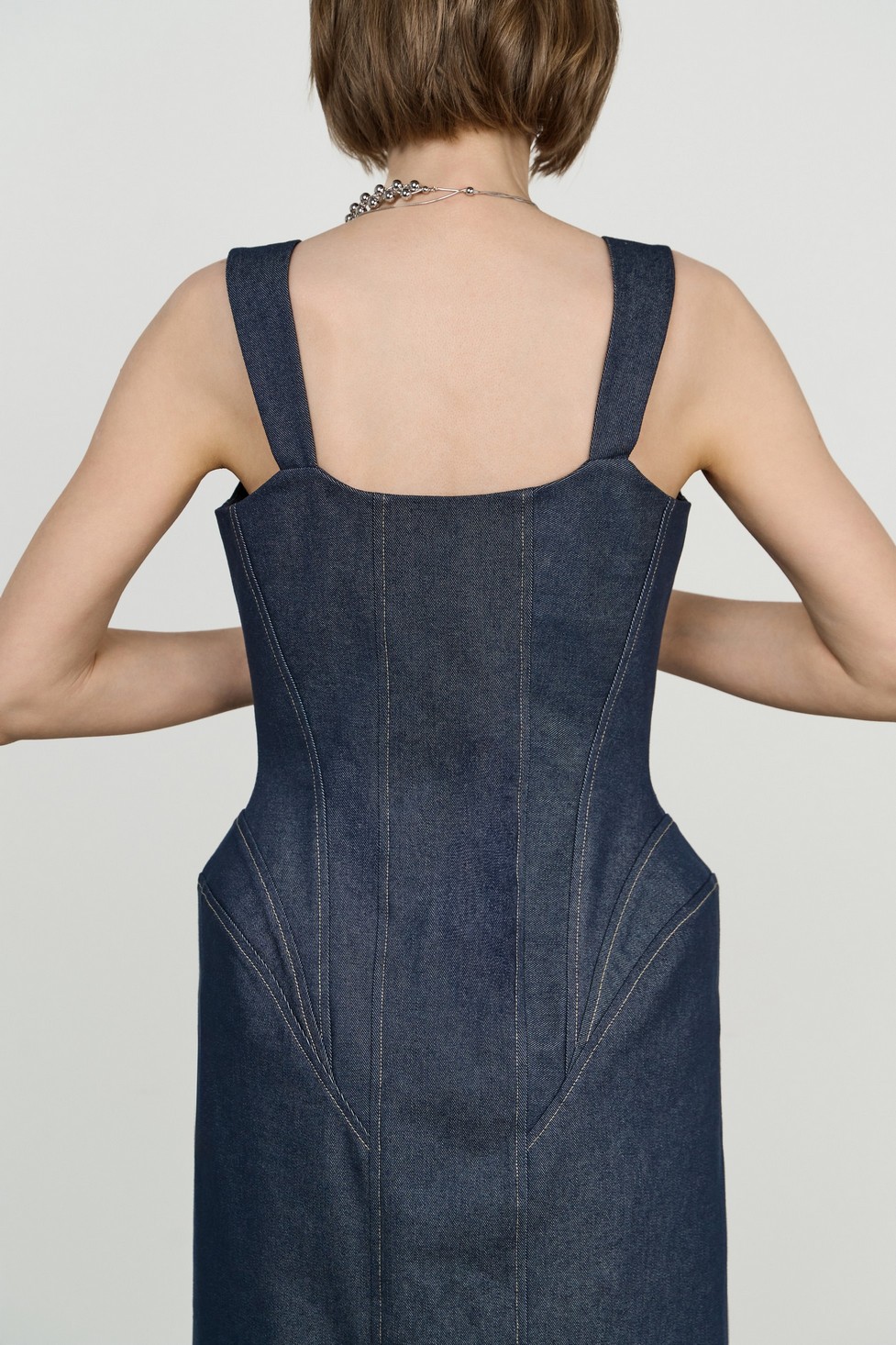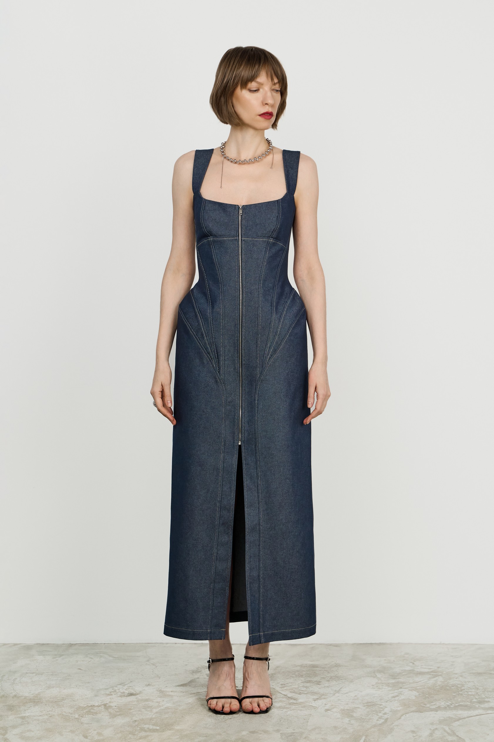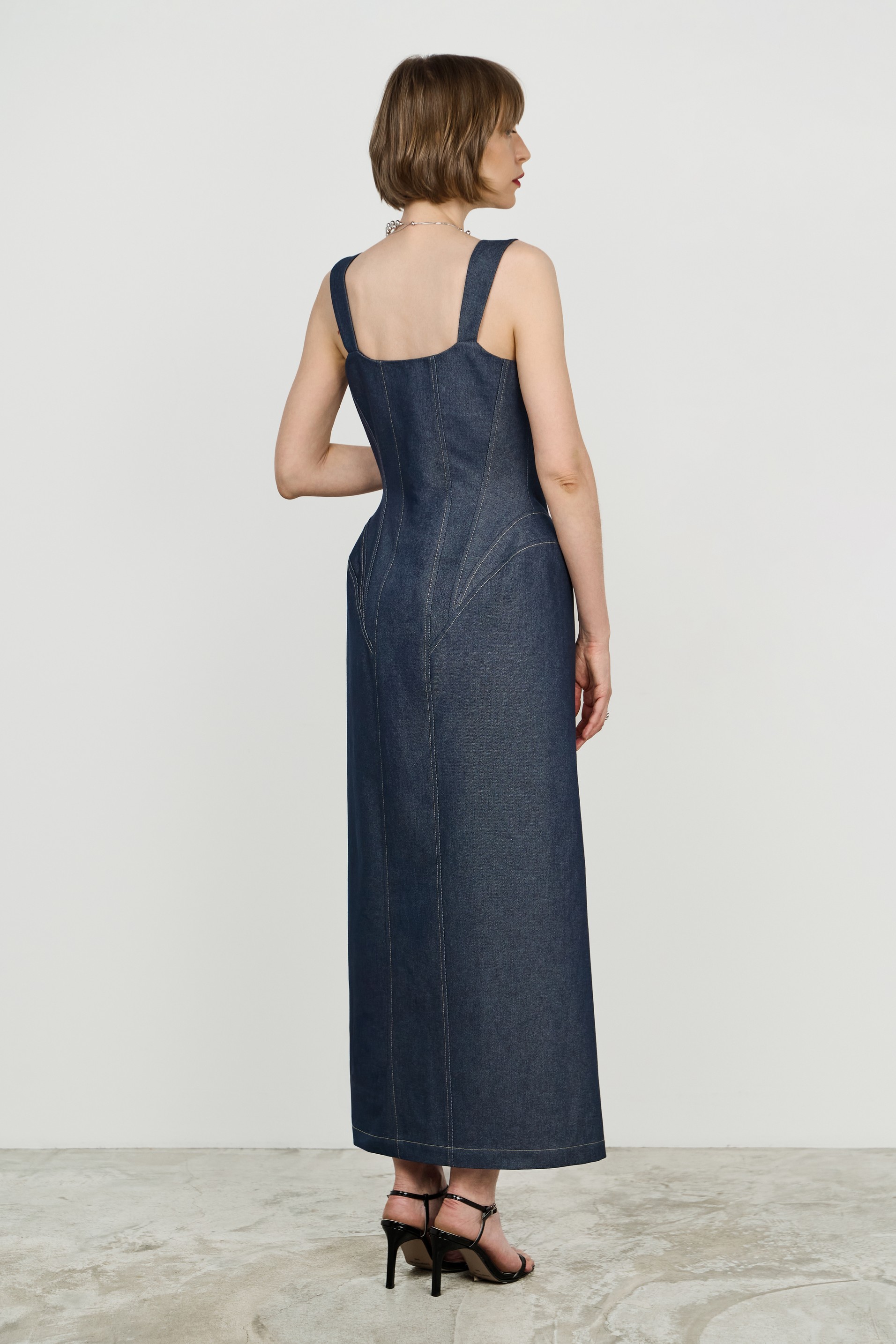 Платье-корсет с выразительным силуэтом и продуманной конструкцией — акцентная модель, подчёркивающая фигуру. Лиф с квадратным декольте и отрезной чашкой формирует чёткую линию верха, а широкие фигурные бретели мягко расширяются к плечу, добавляя образу выразительности.