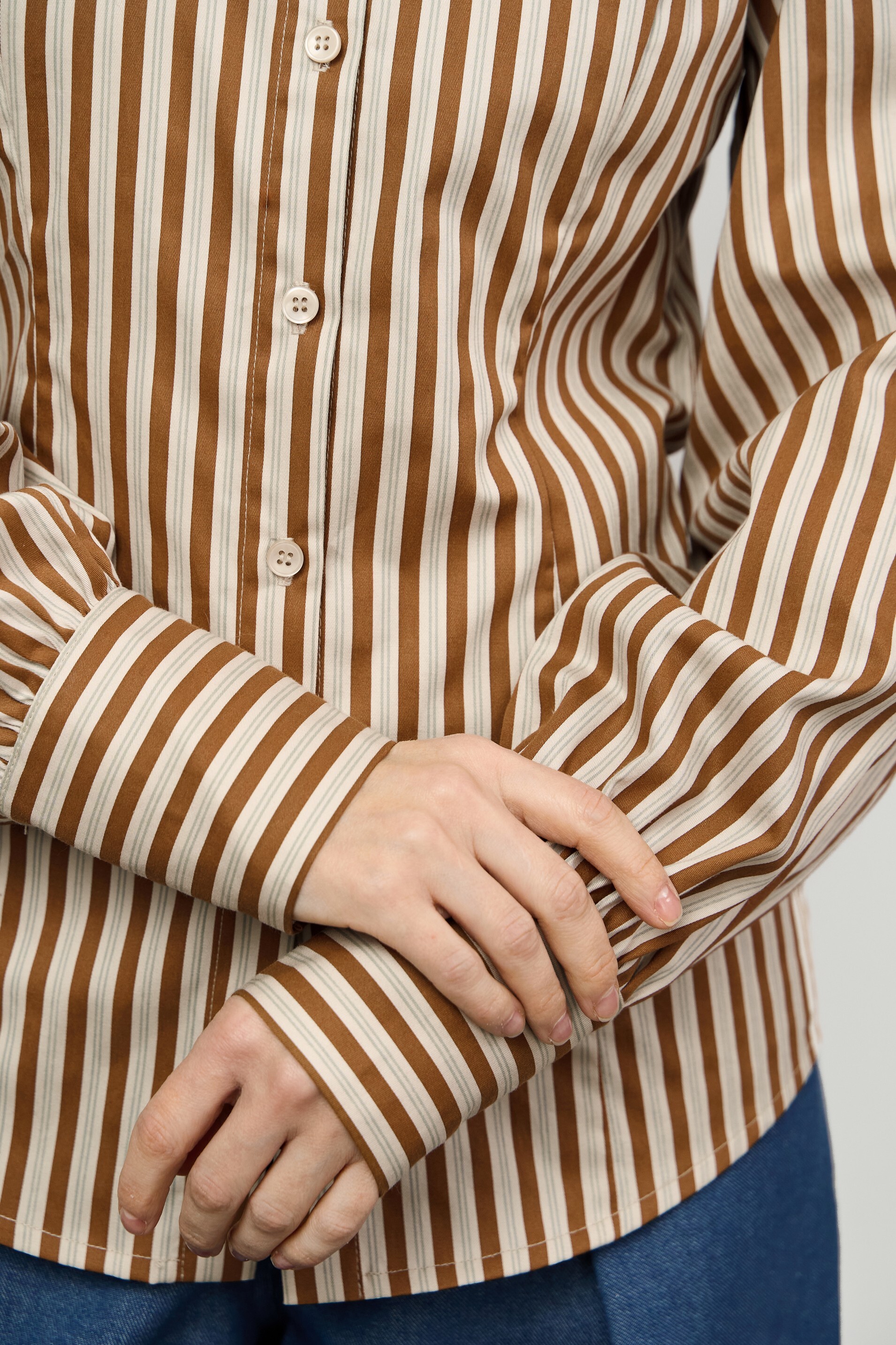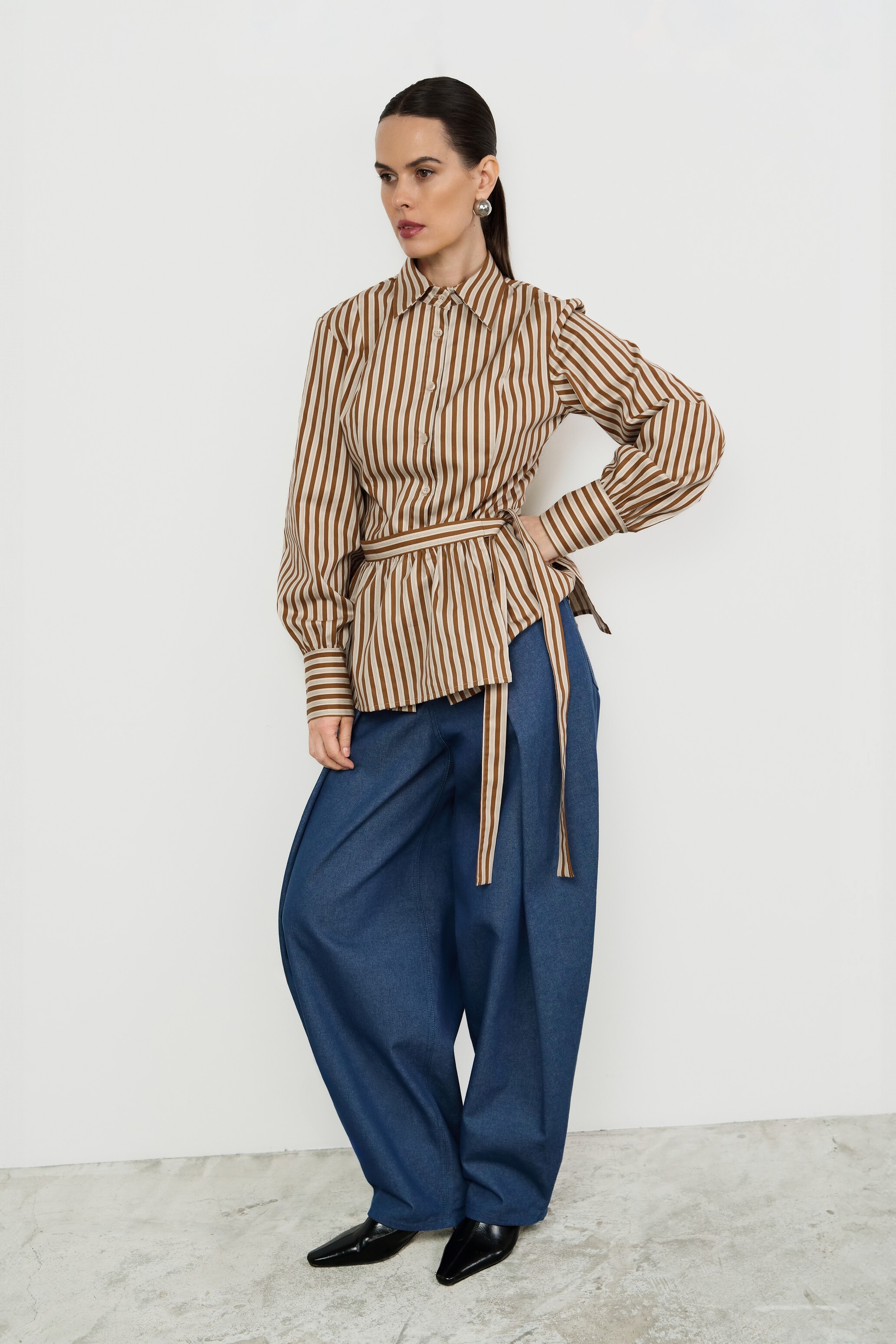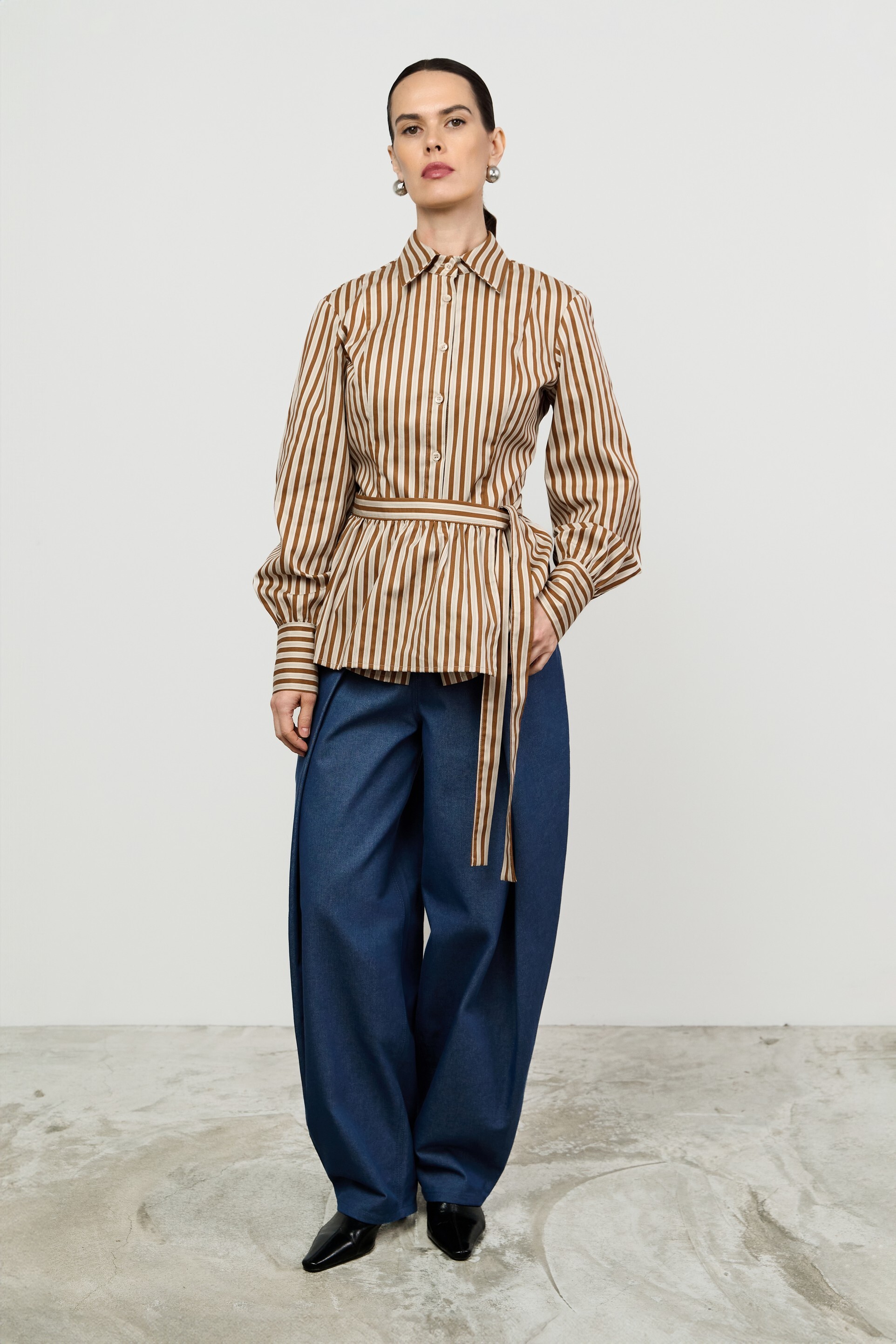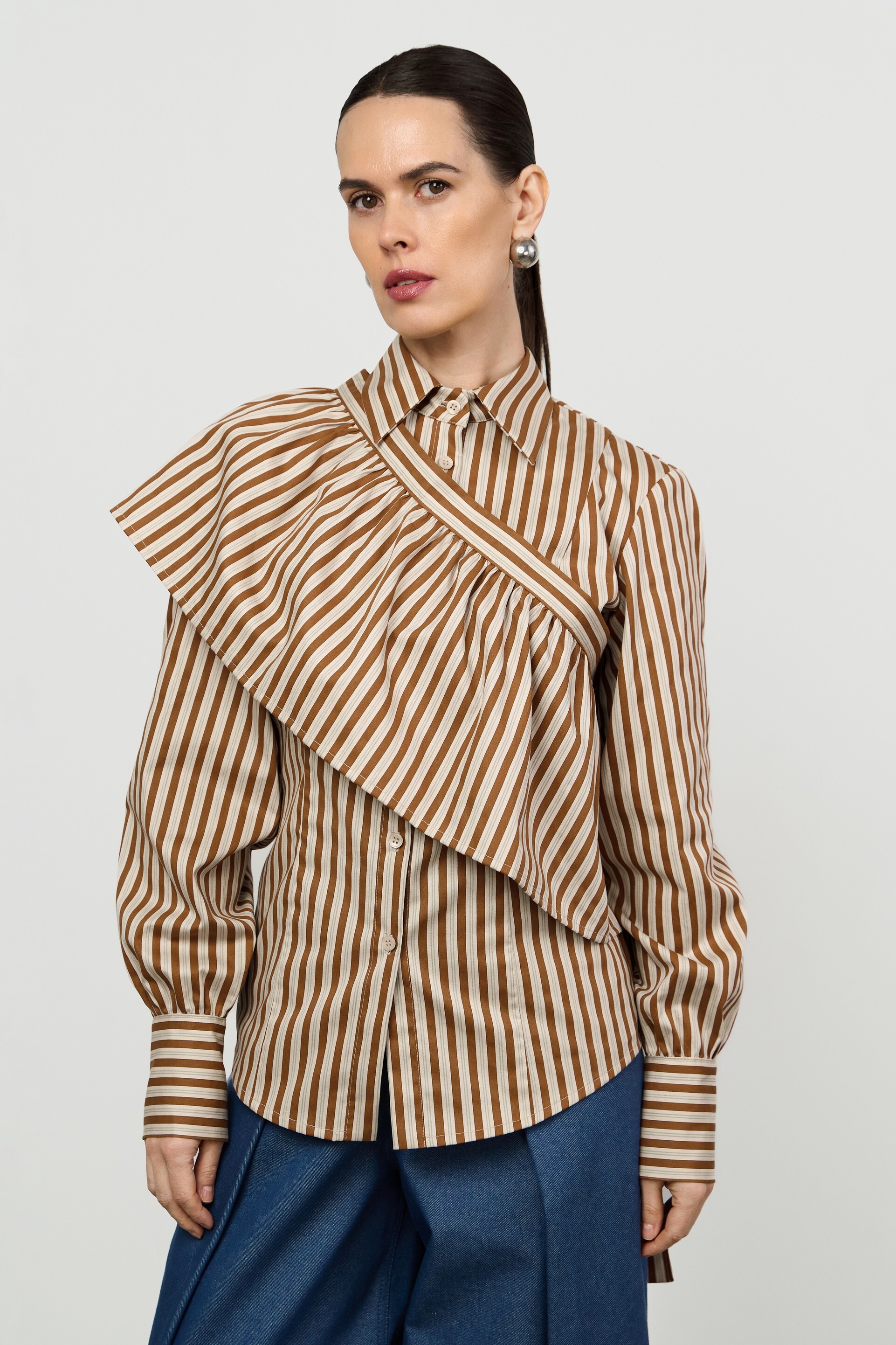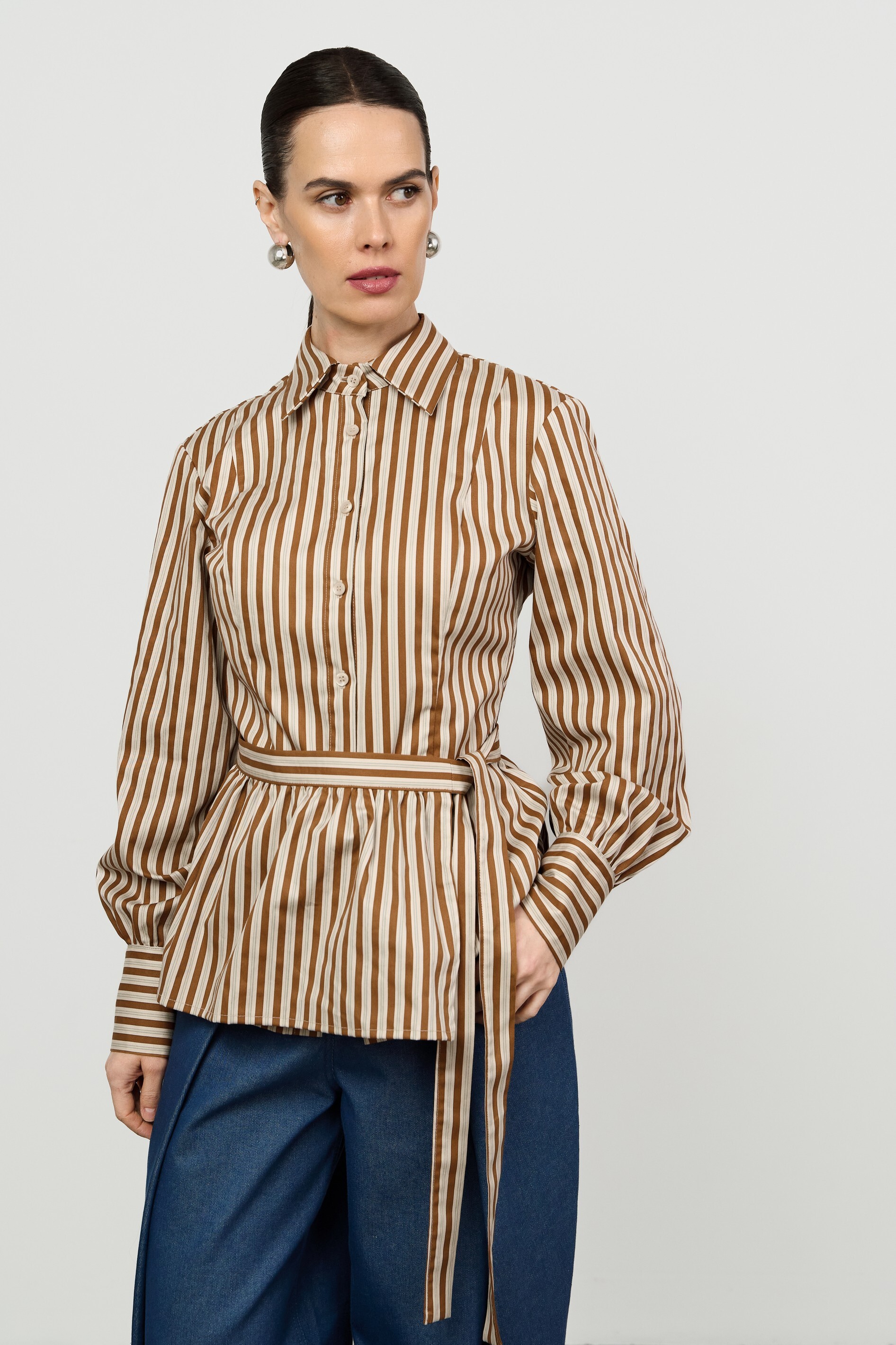 Рубашка умеренного объёма с приталенным силуэтом: длинный рукав с манжетой, рубашечный воротник и центральная застёжка на петли и пуговицы. Эффектный акцент — съёмная баска с поясом, завязками и сборкой по талии.