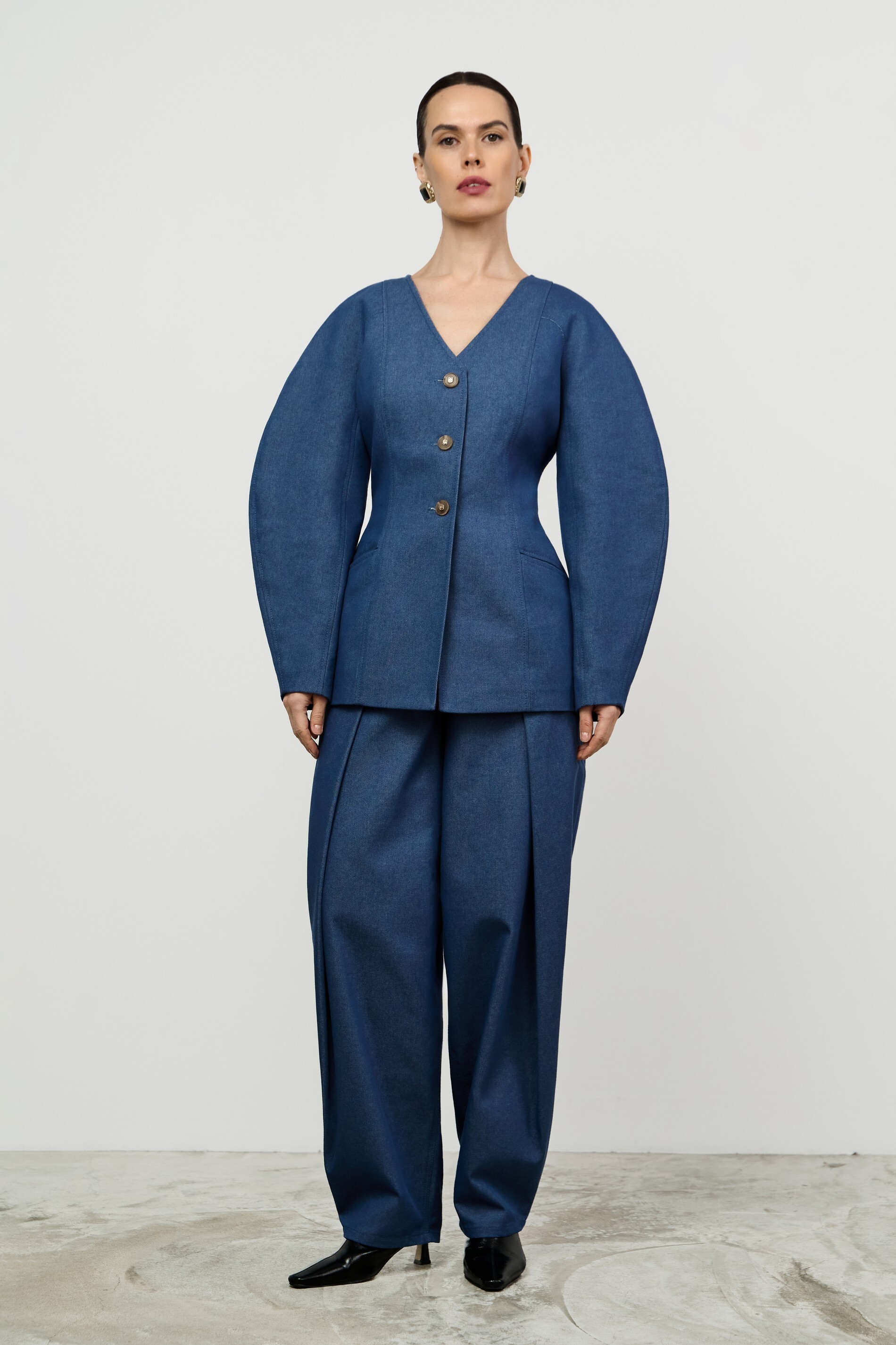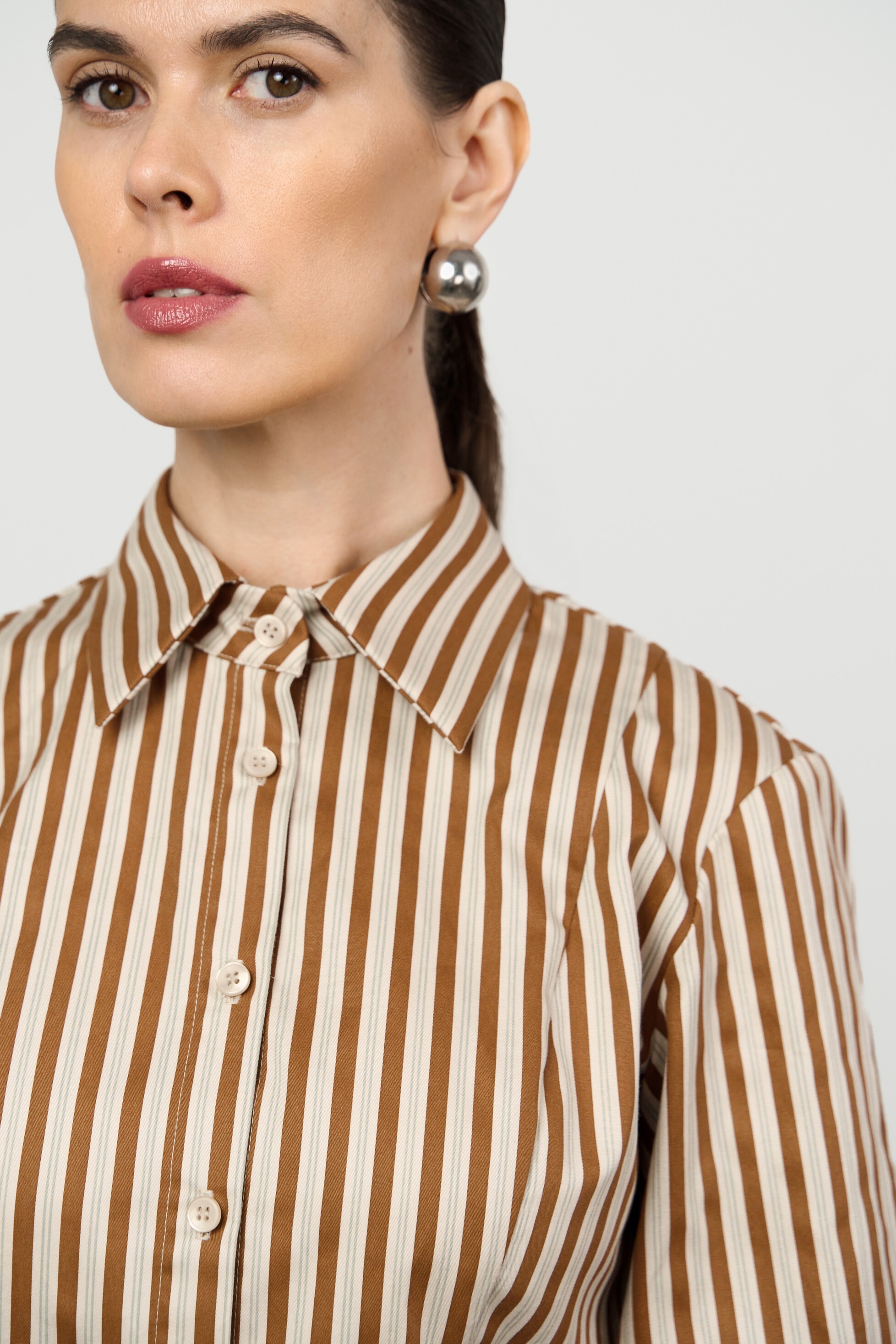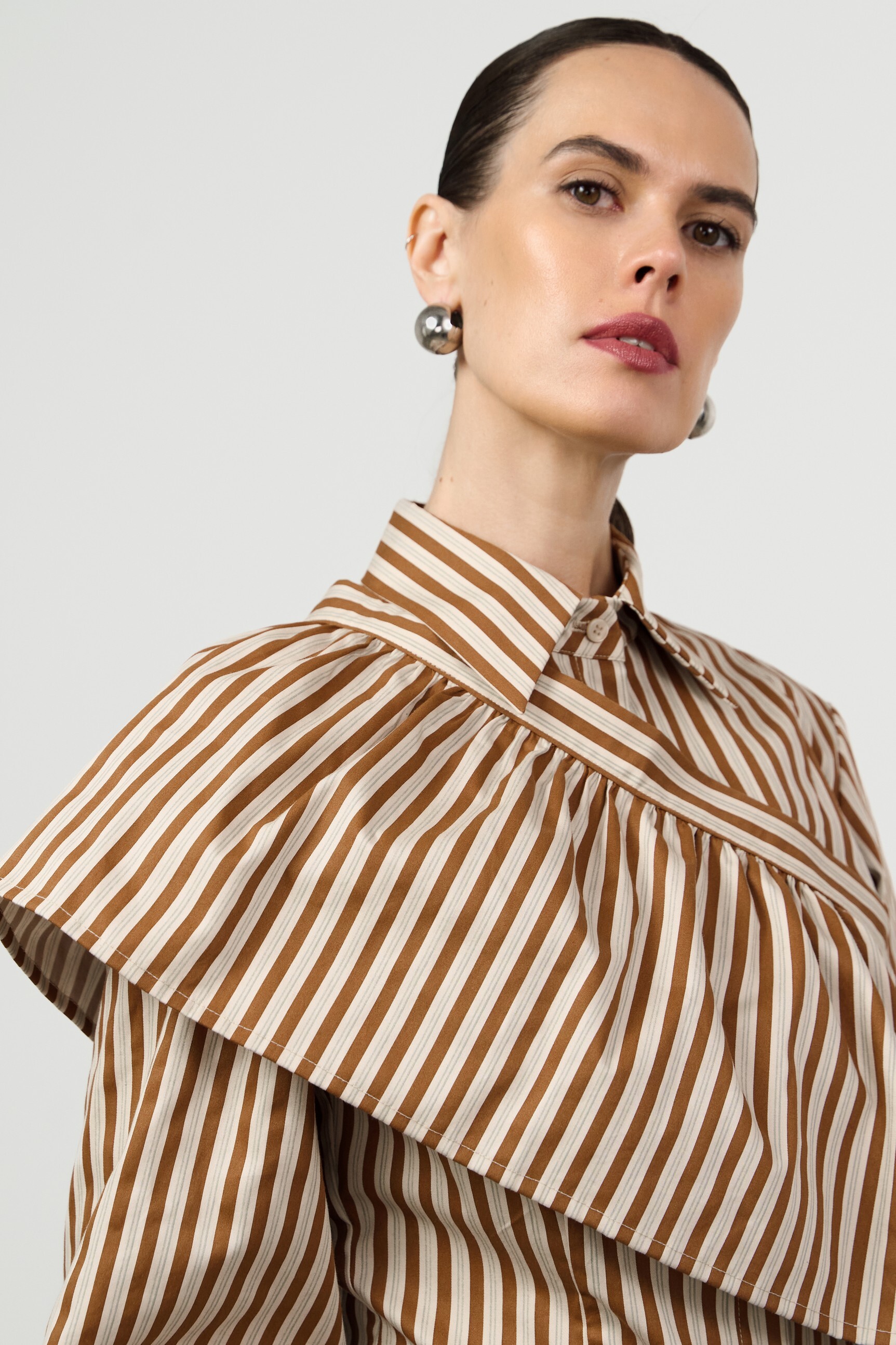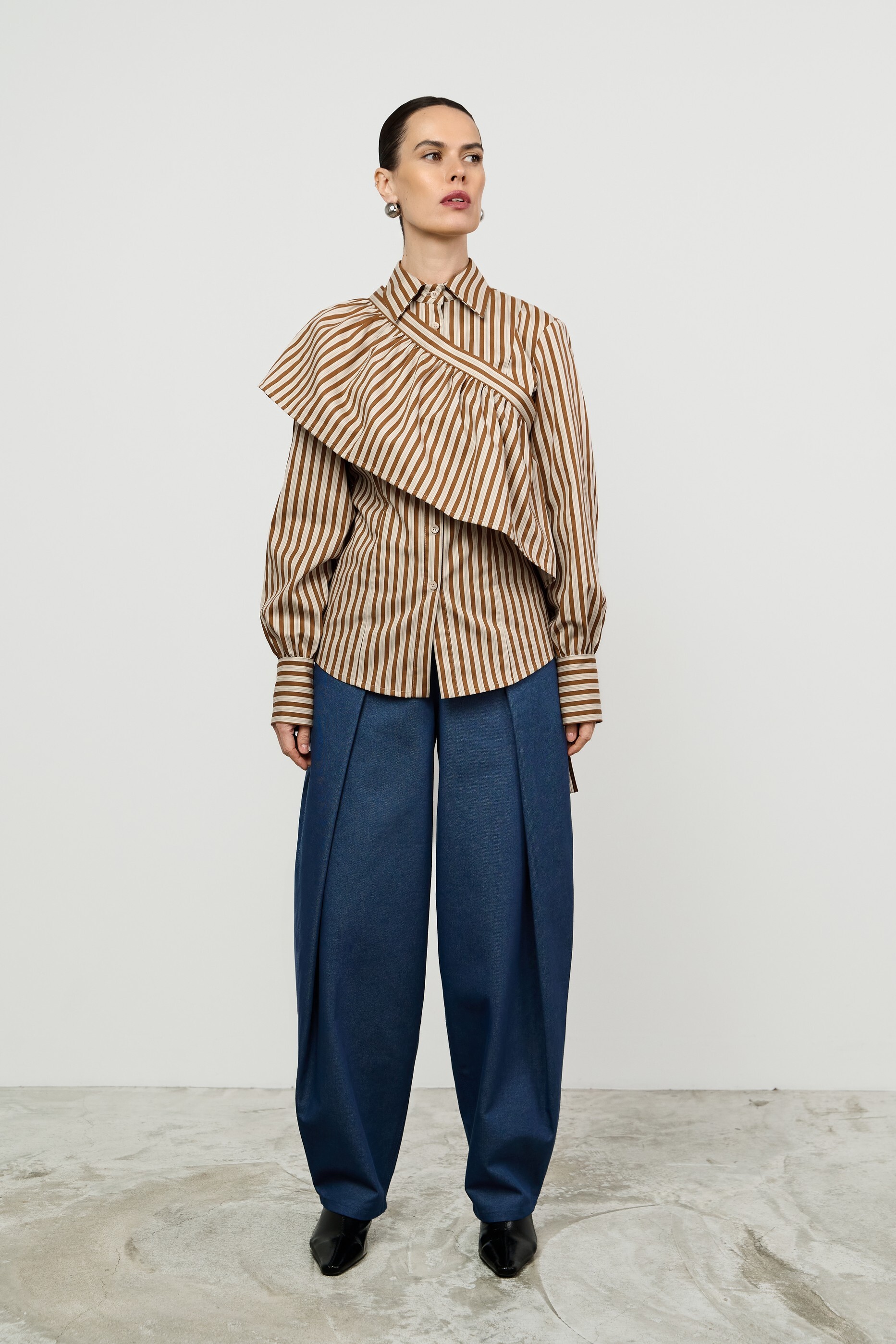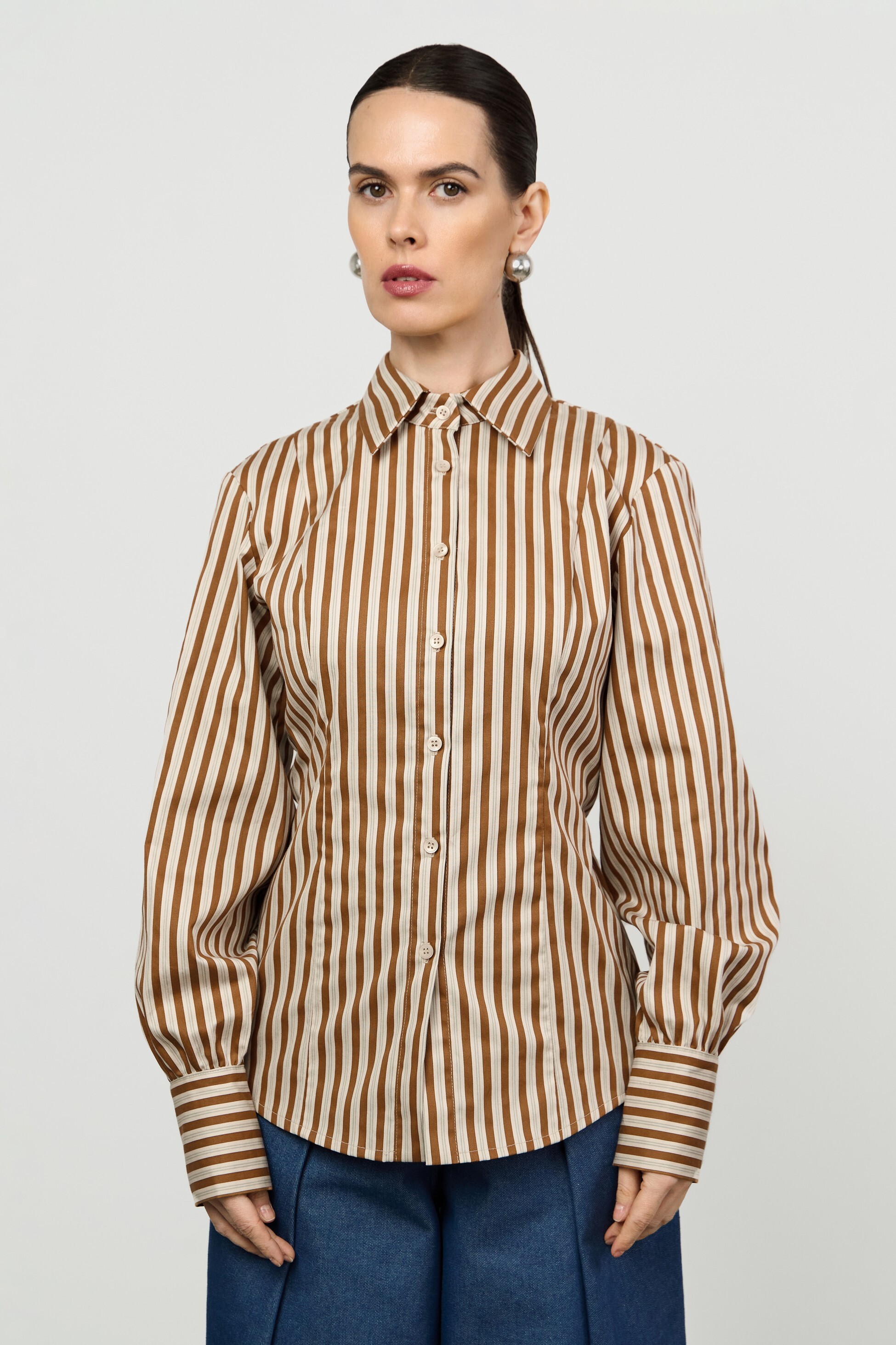 Рубашка умеренного объёма с приталенным силуэтом: длинный рукав с манжетой, рубашечный воротник и центральная застёжка на петли и пуговицы. Эффектный акцент — съёмная баска с поясом, завязками и сборкой по талии.