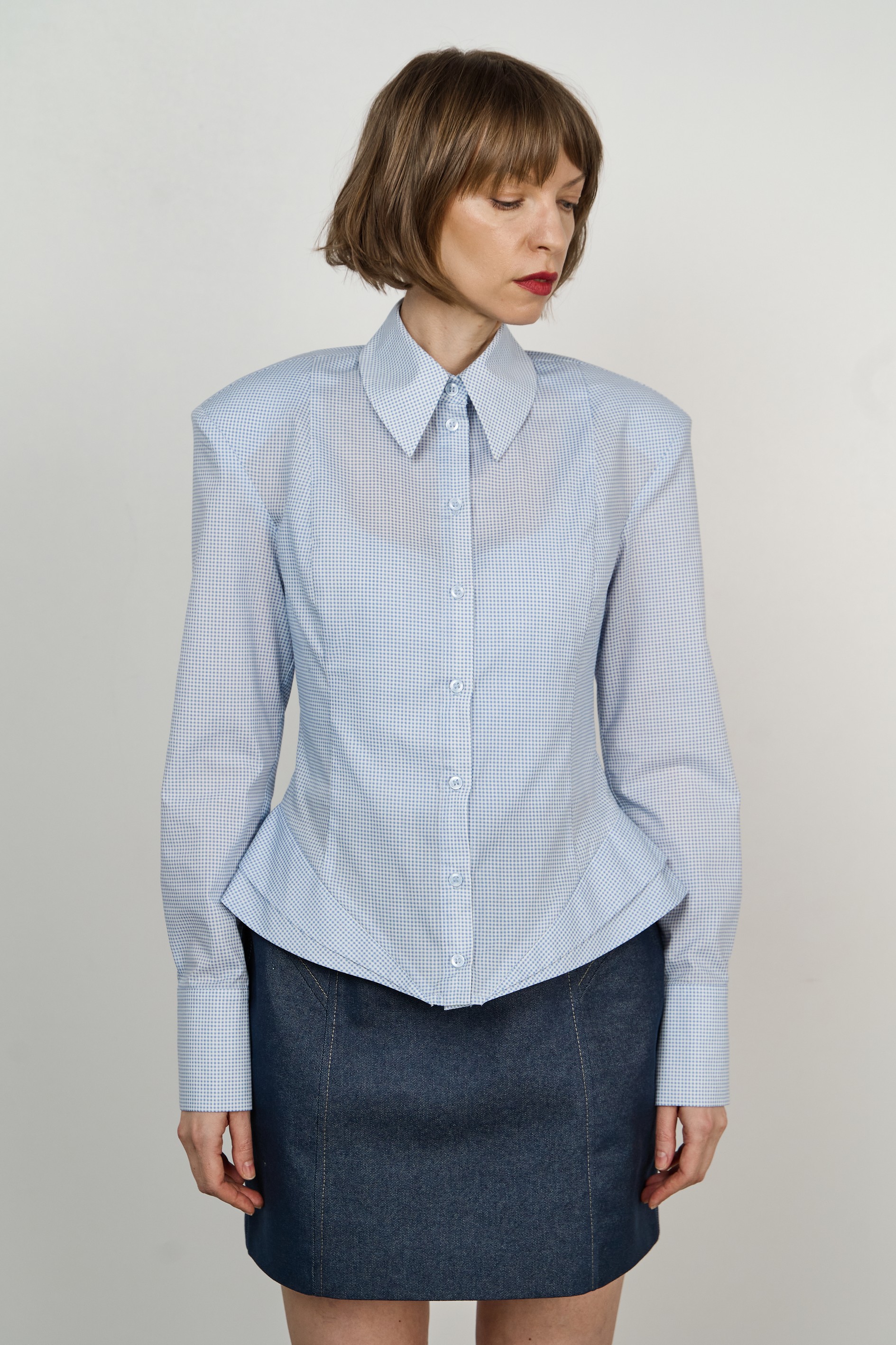 Рубашка с акцентной линией плеч и выразительной баской по линии бёдер — модель, которая формирует чёткий и женственный силуэт. Рельефы по переду и спинке создают красивую посадку и подчёркивают фигуру, а баска добавляет объёма и динамики в образе.