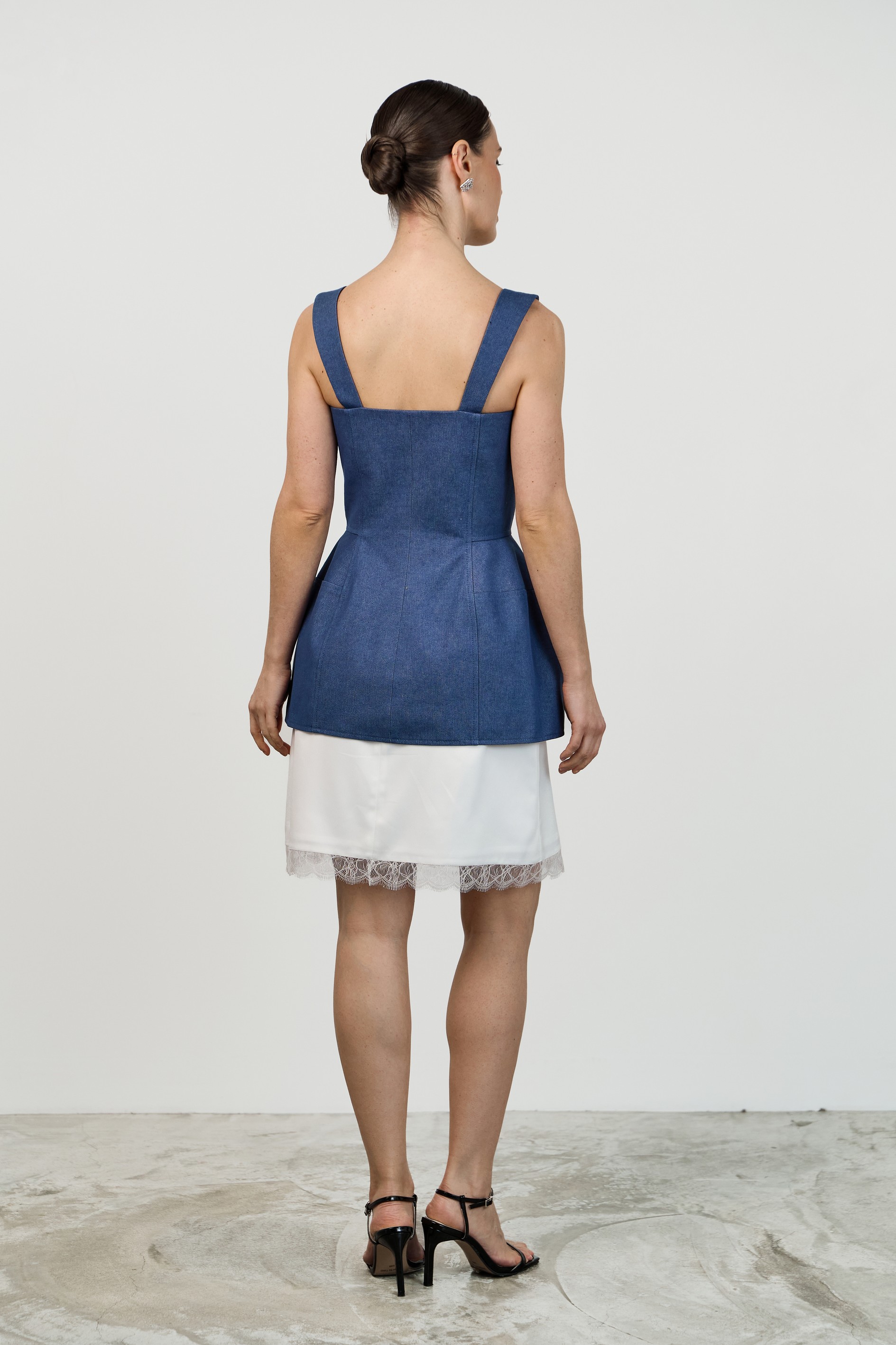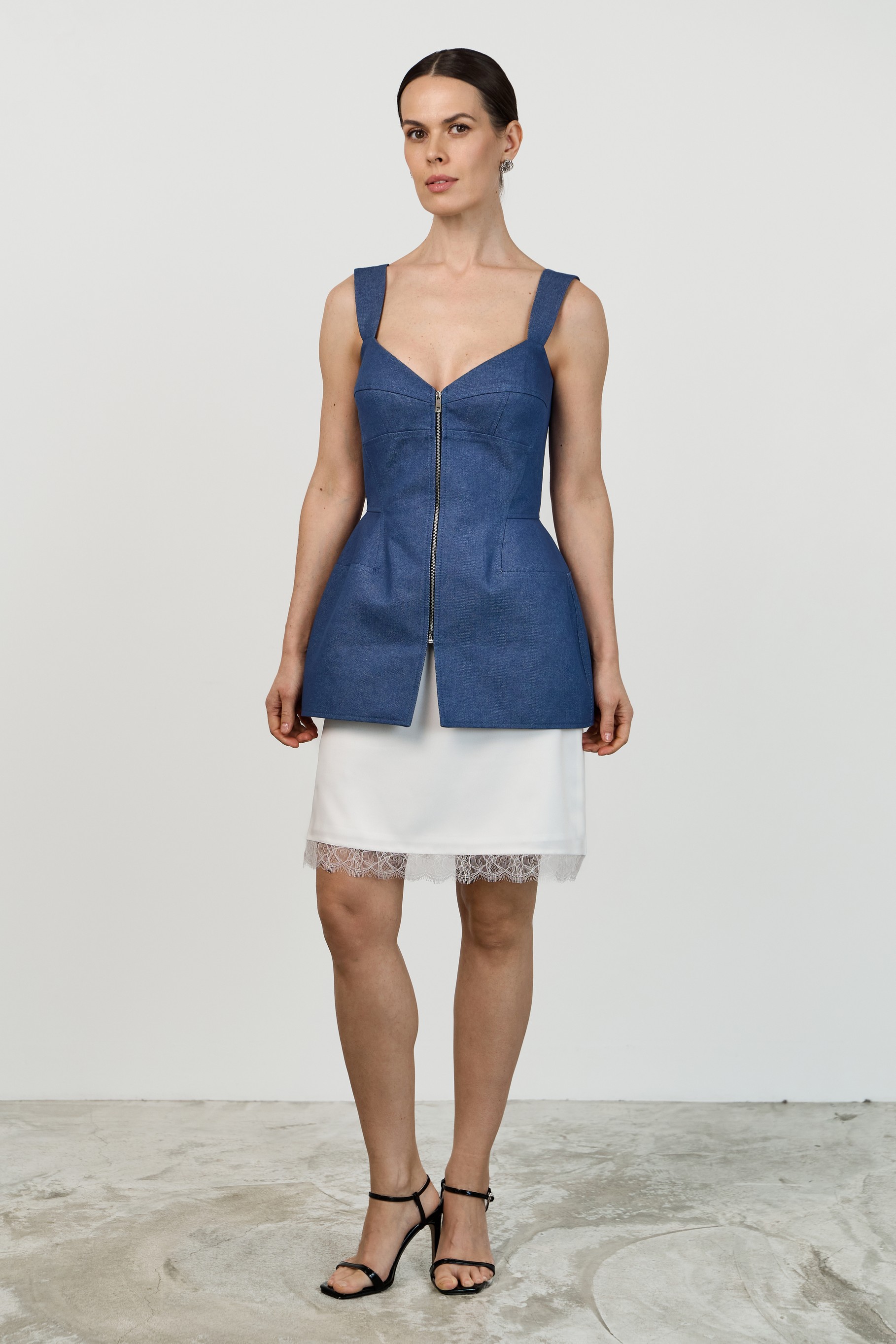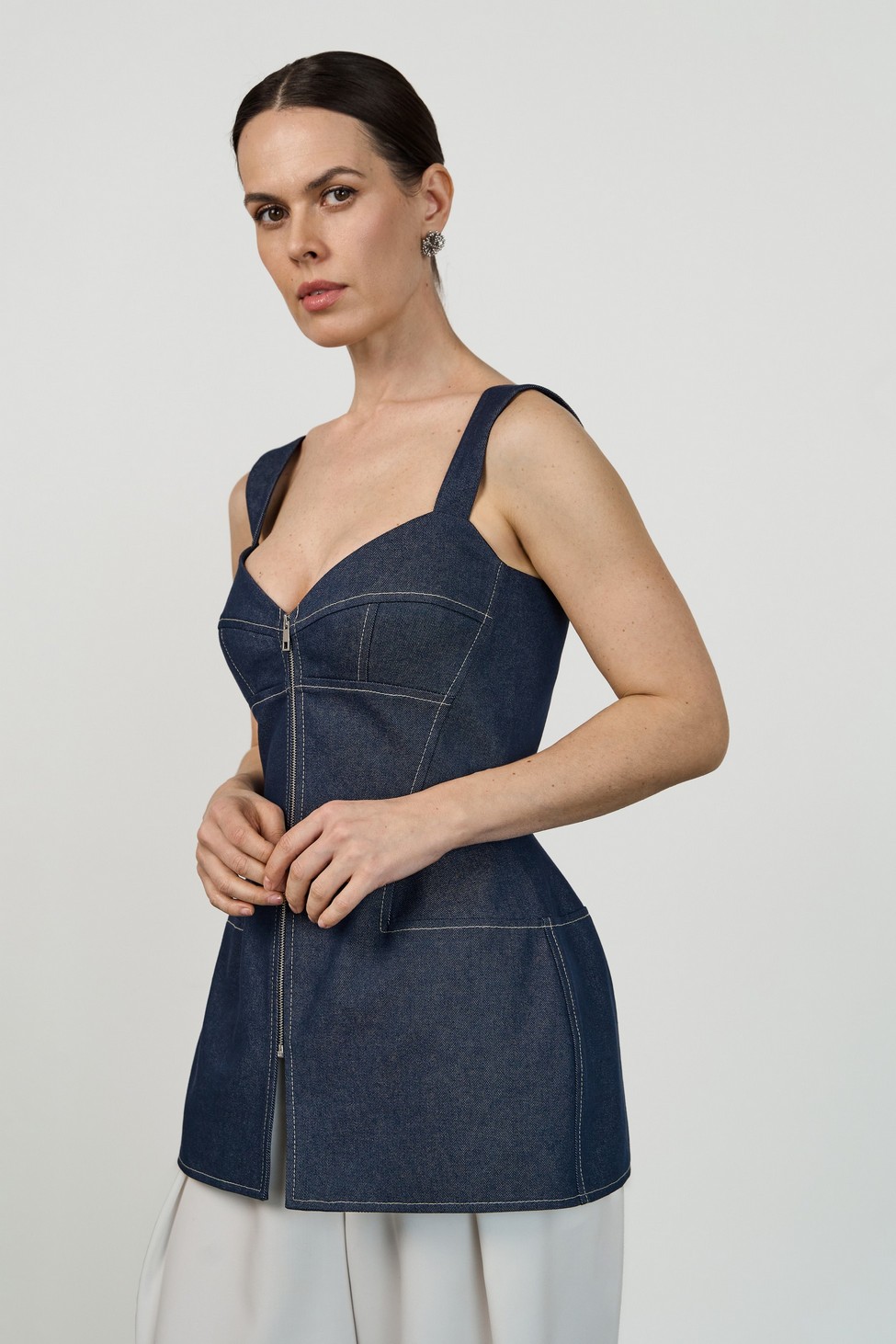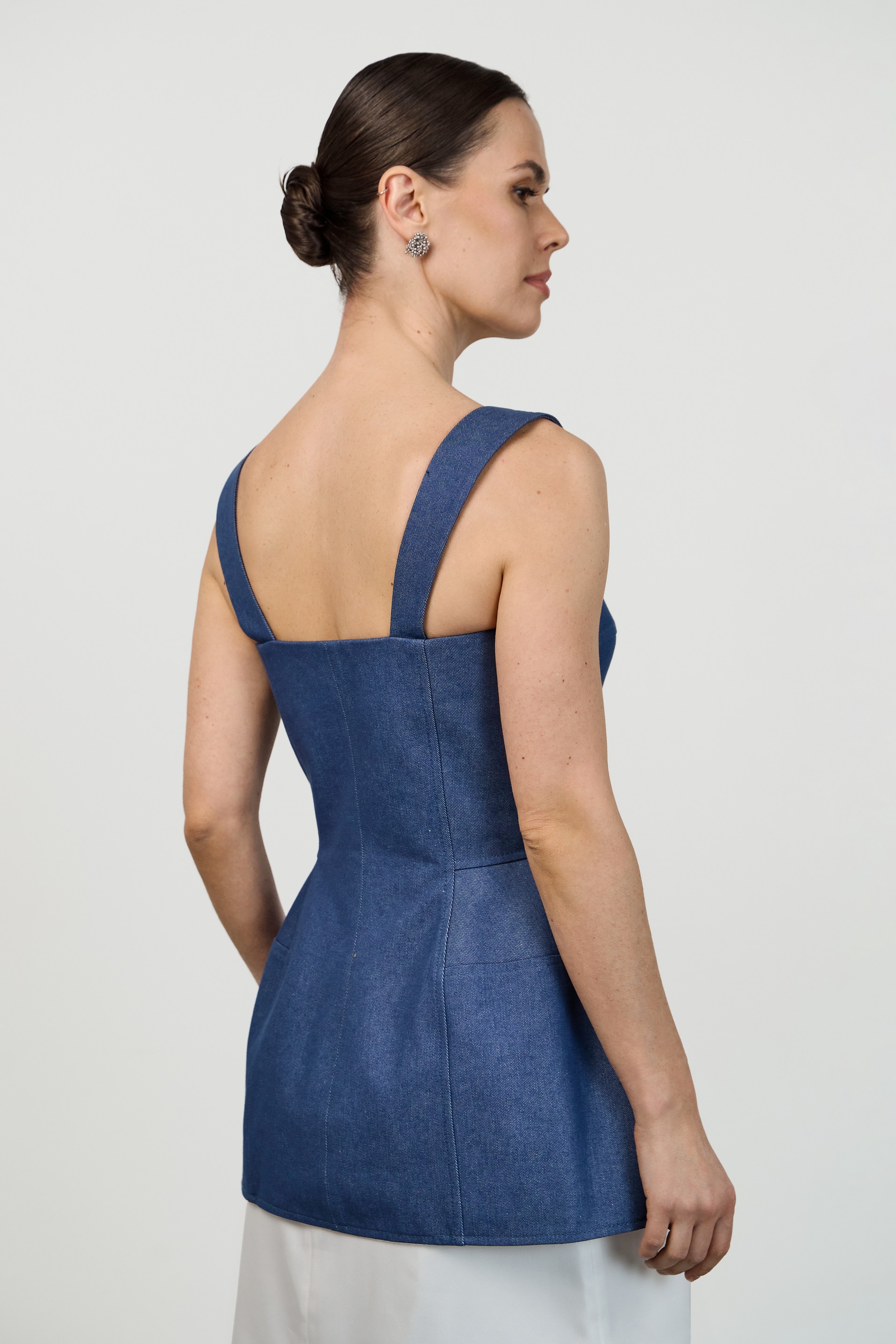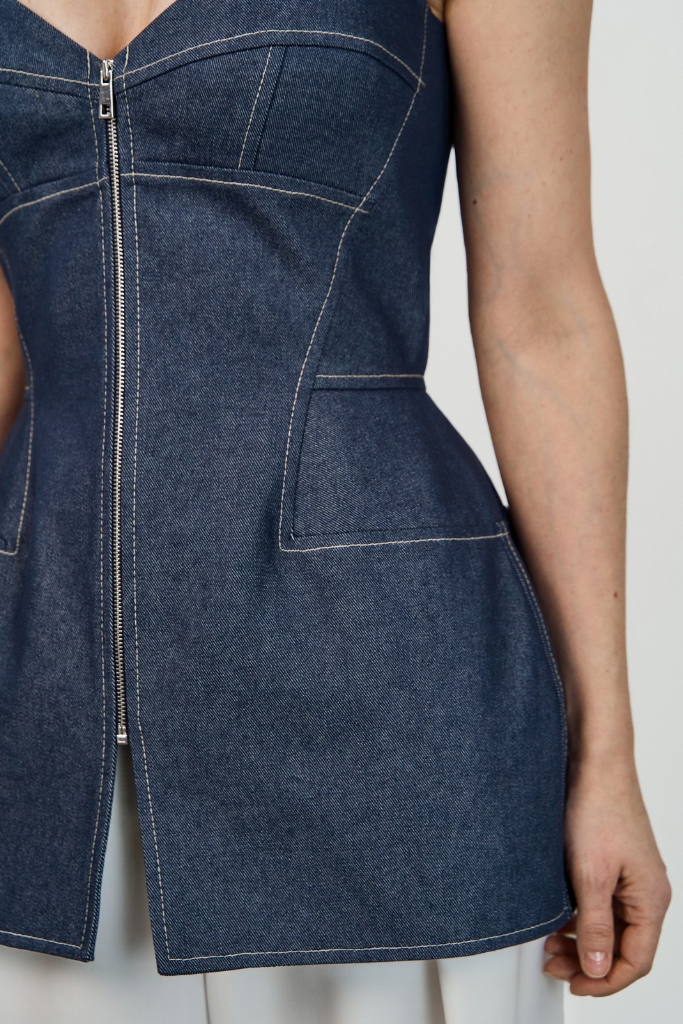 Топ из джинсы корсетного типа силуэта «песочные часы» с плотным прилеганием по фигуре. Застежка спереди- металлическая разъёмная молния.