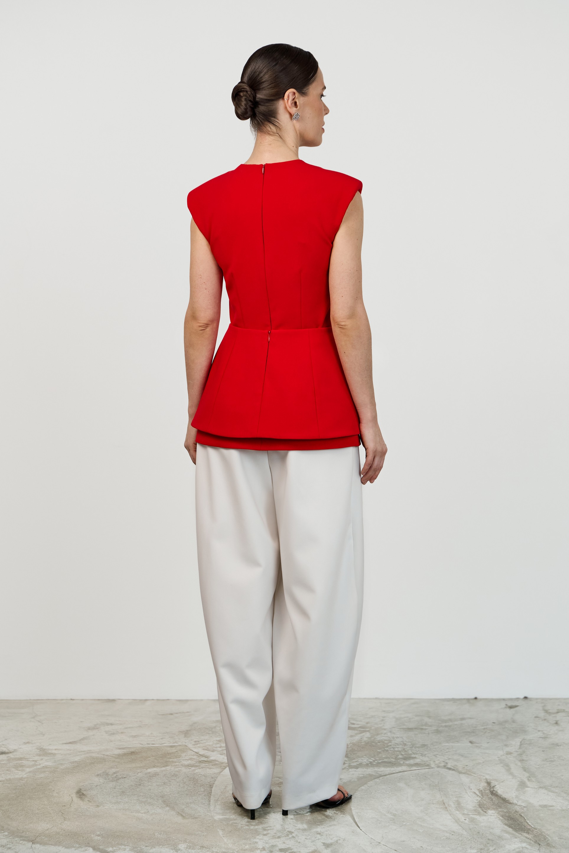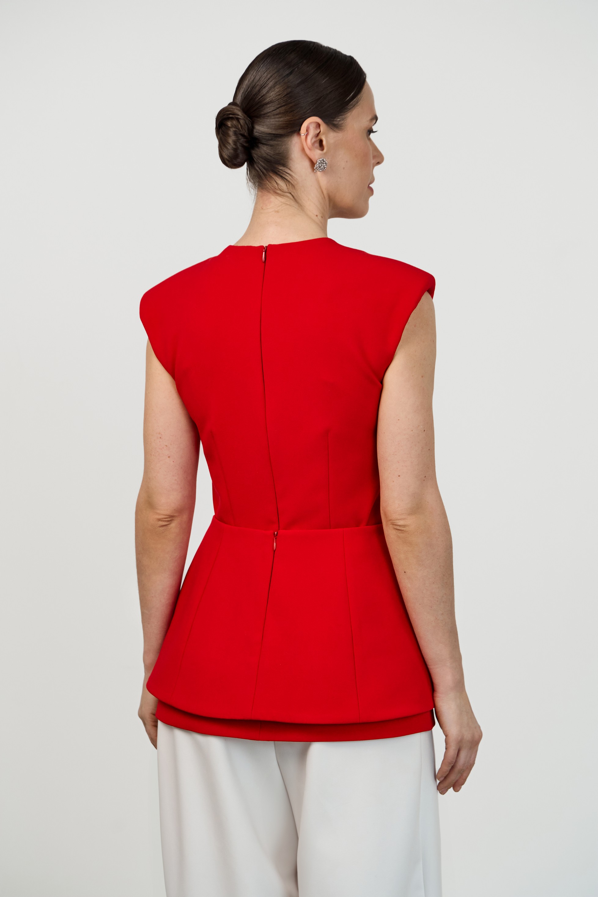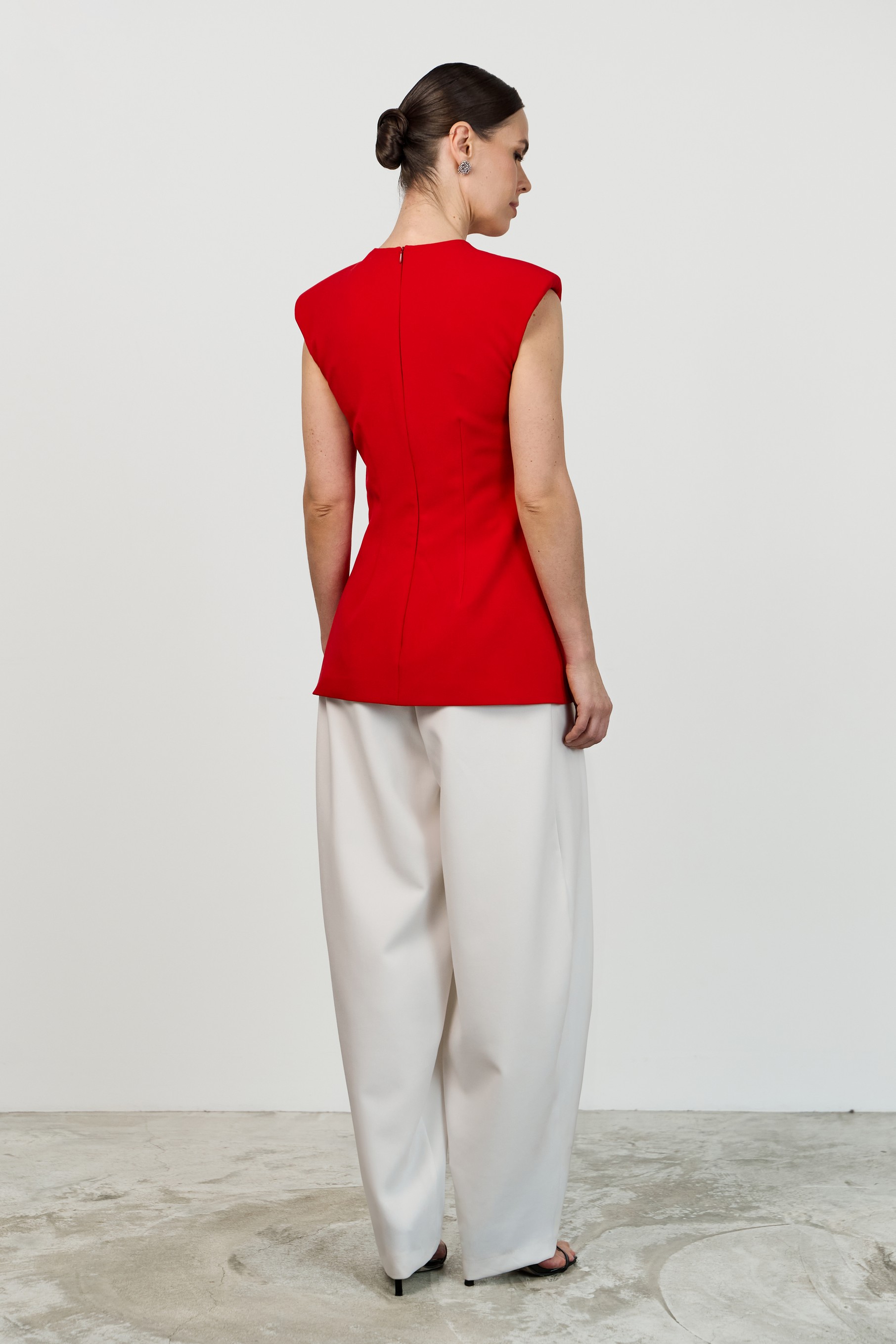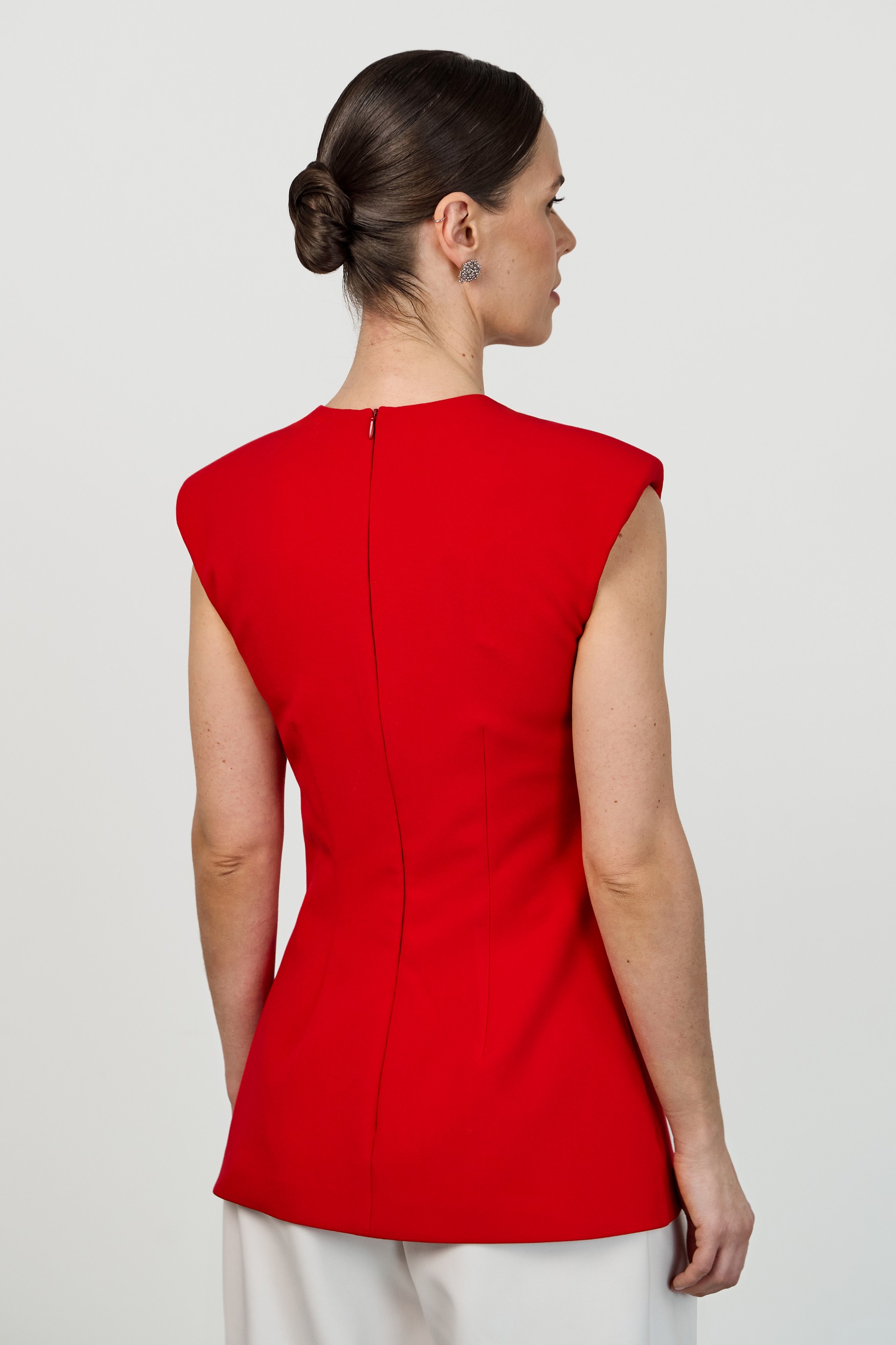Лаконичный приталенный топ с расширенной линией плеча и круглым вырезом горловины. Конструктивные особенности — центральные швы спереди и сзади, потайная молния на спинке, плечевые накладки. Модель выполнена на подкладке.