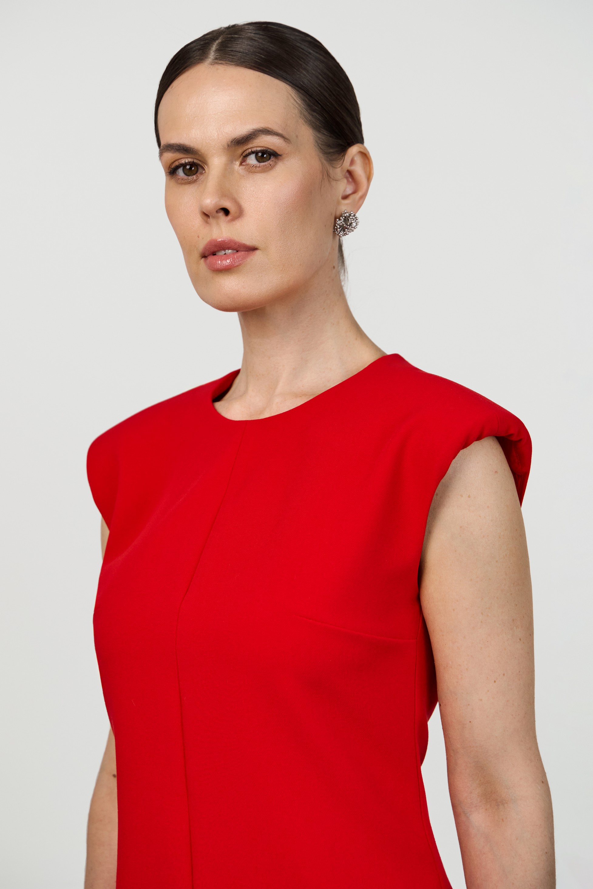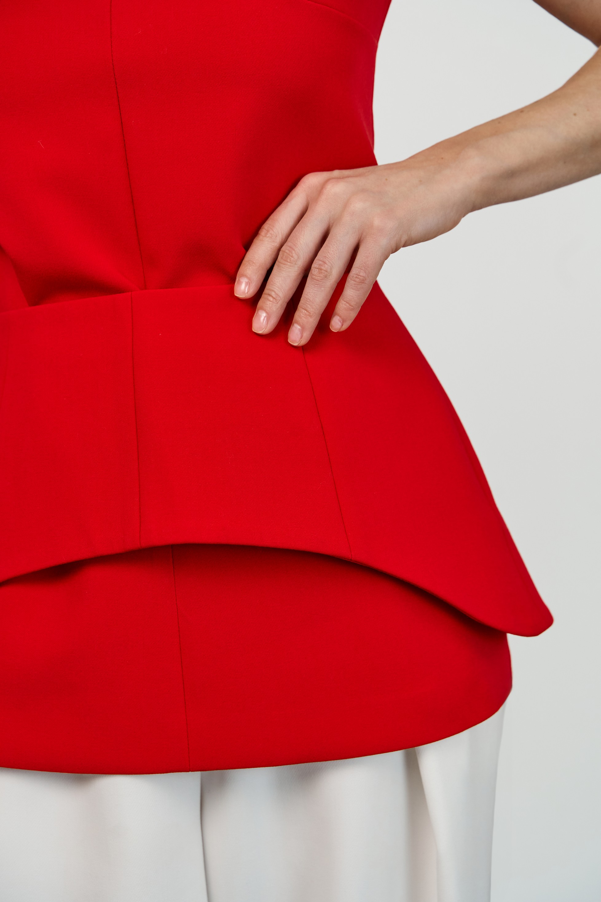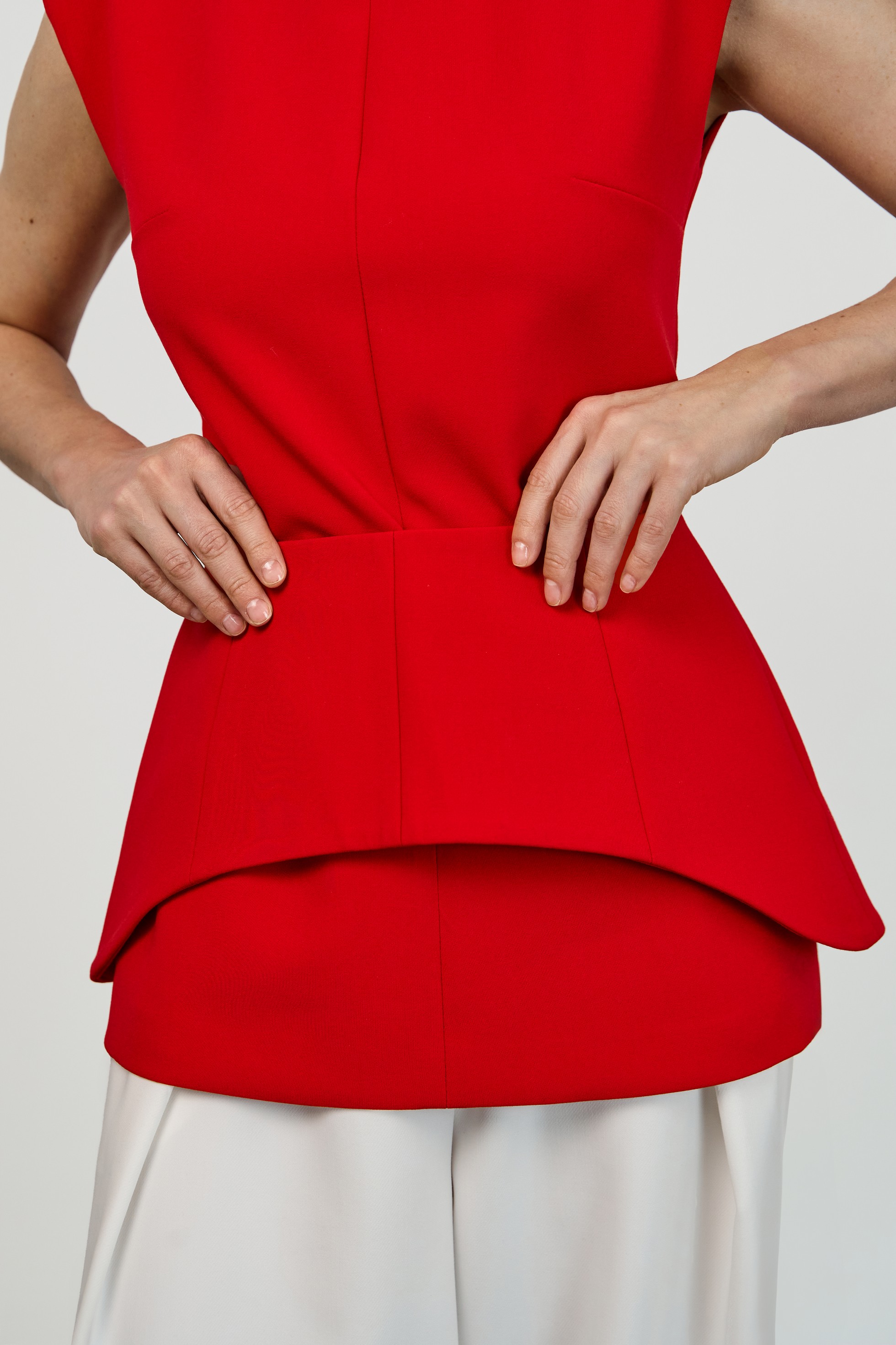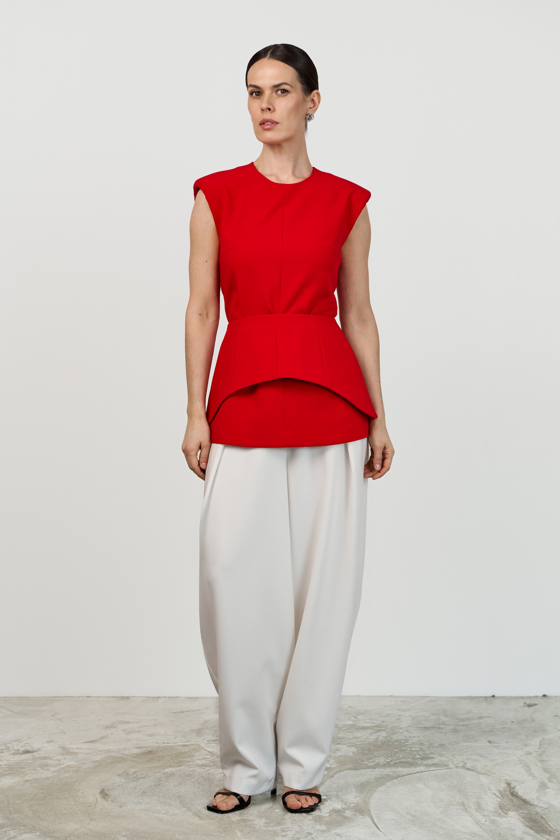 Лаконичный приталенный топ с расширенной линией плеча и круглым вырезом горловины. Конструктивные особенности — центральные швы спереди и сзади, потайная молния на спинке, плечевые накладки. Модель выполнена на подкладке.