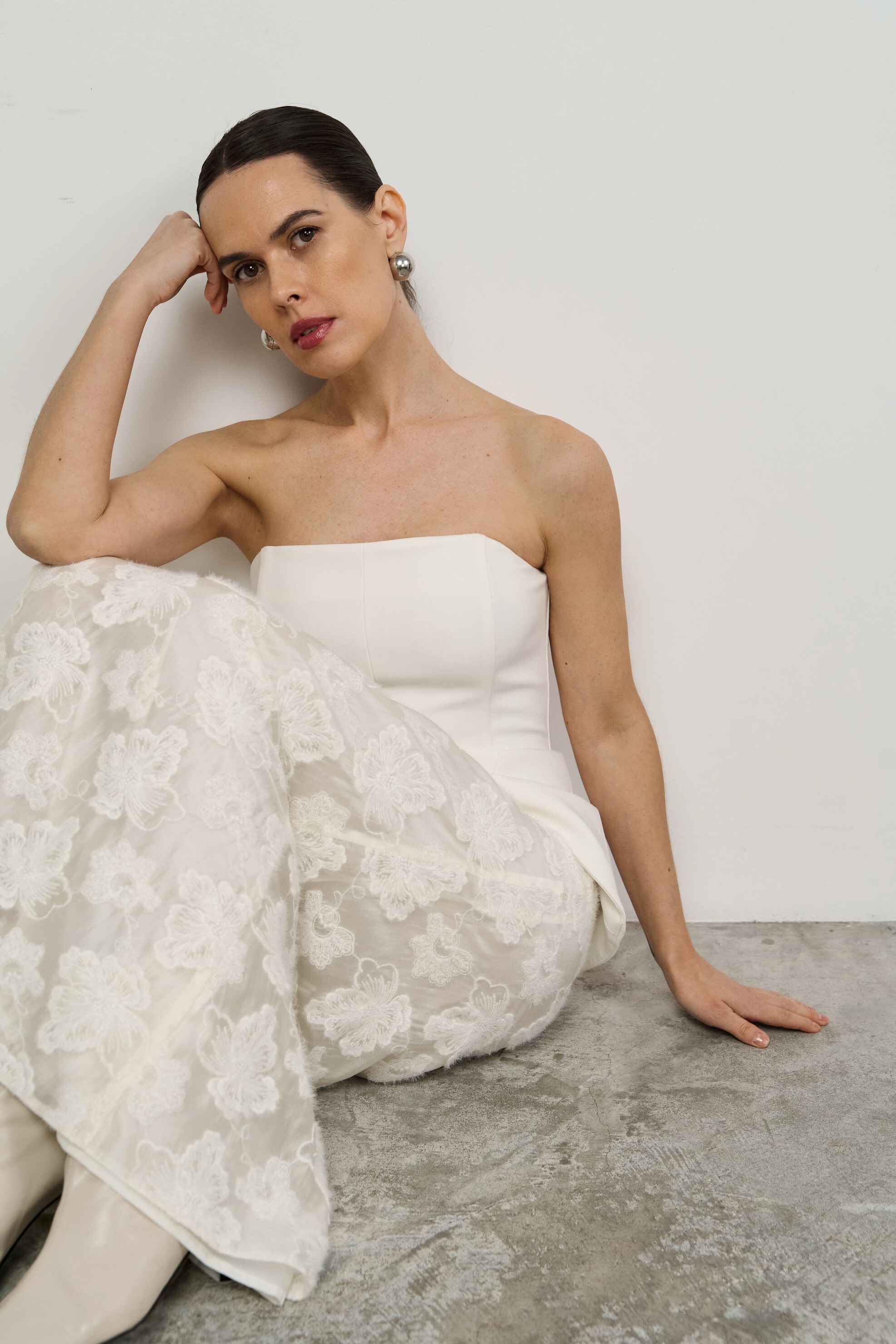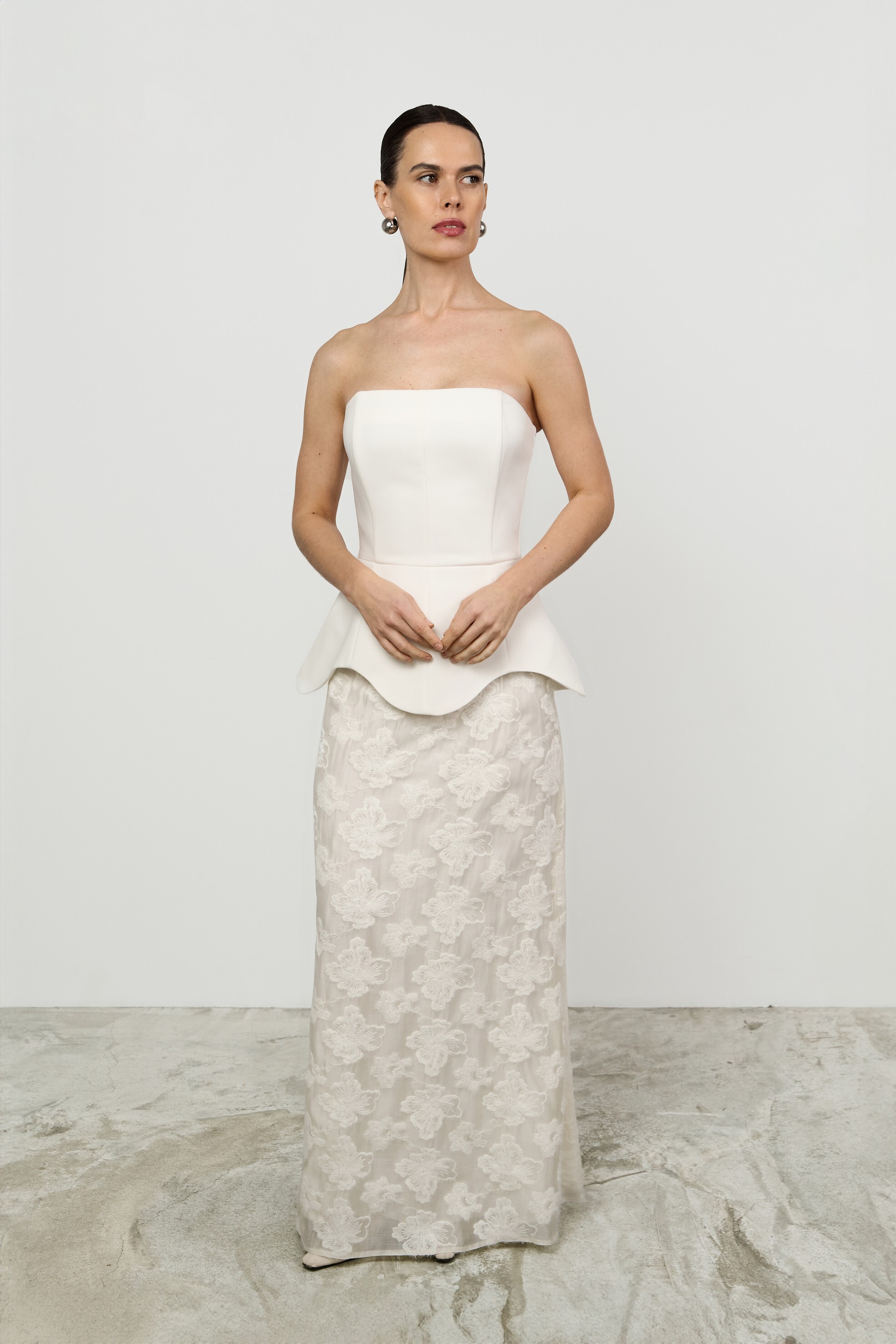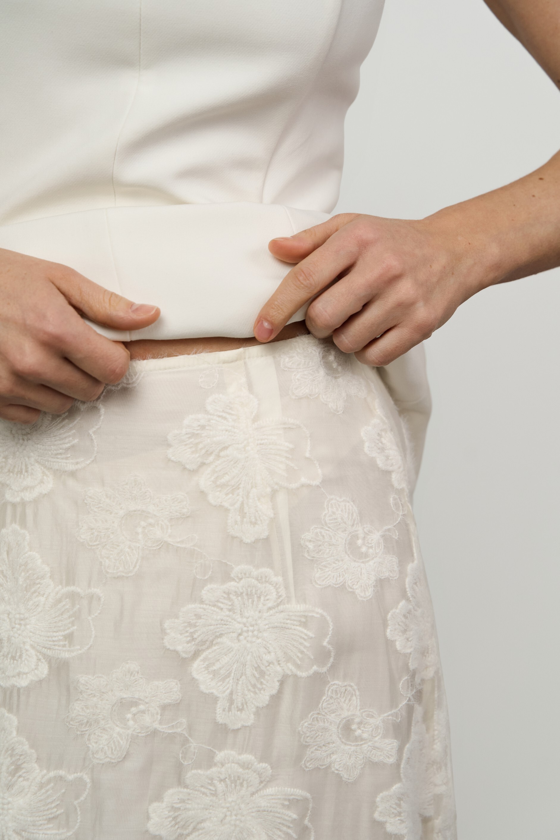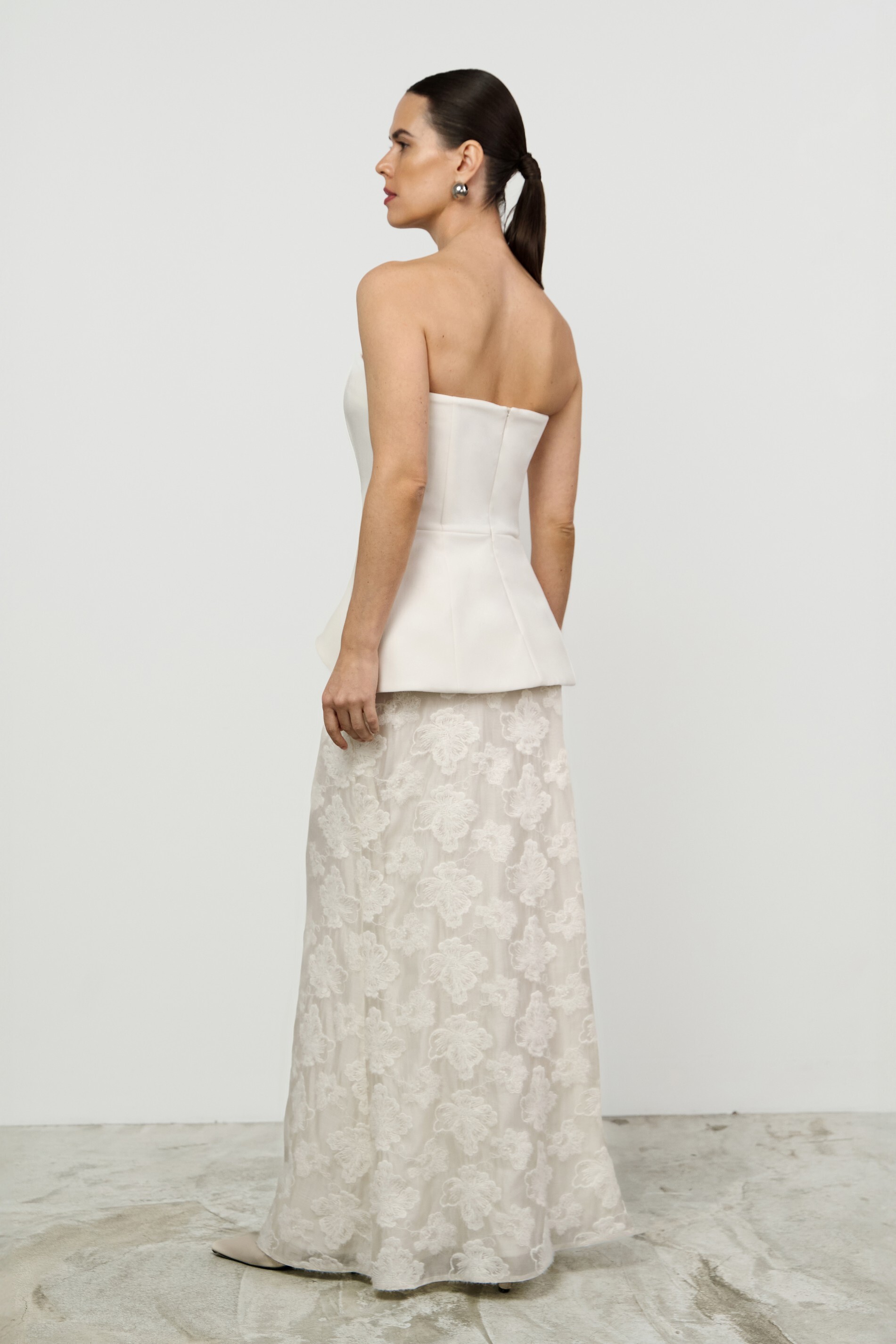 Юбка макси силуэта трапеция. Модель из тонкой органзы с вышивкой крупными цветами, на подкладке.