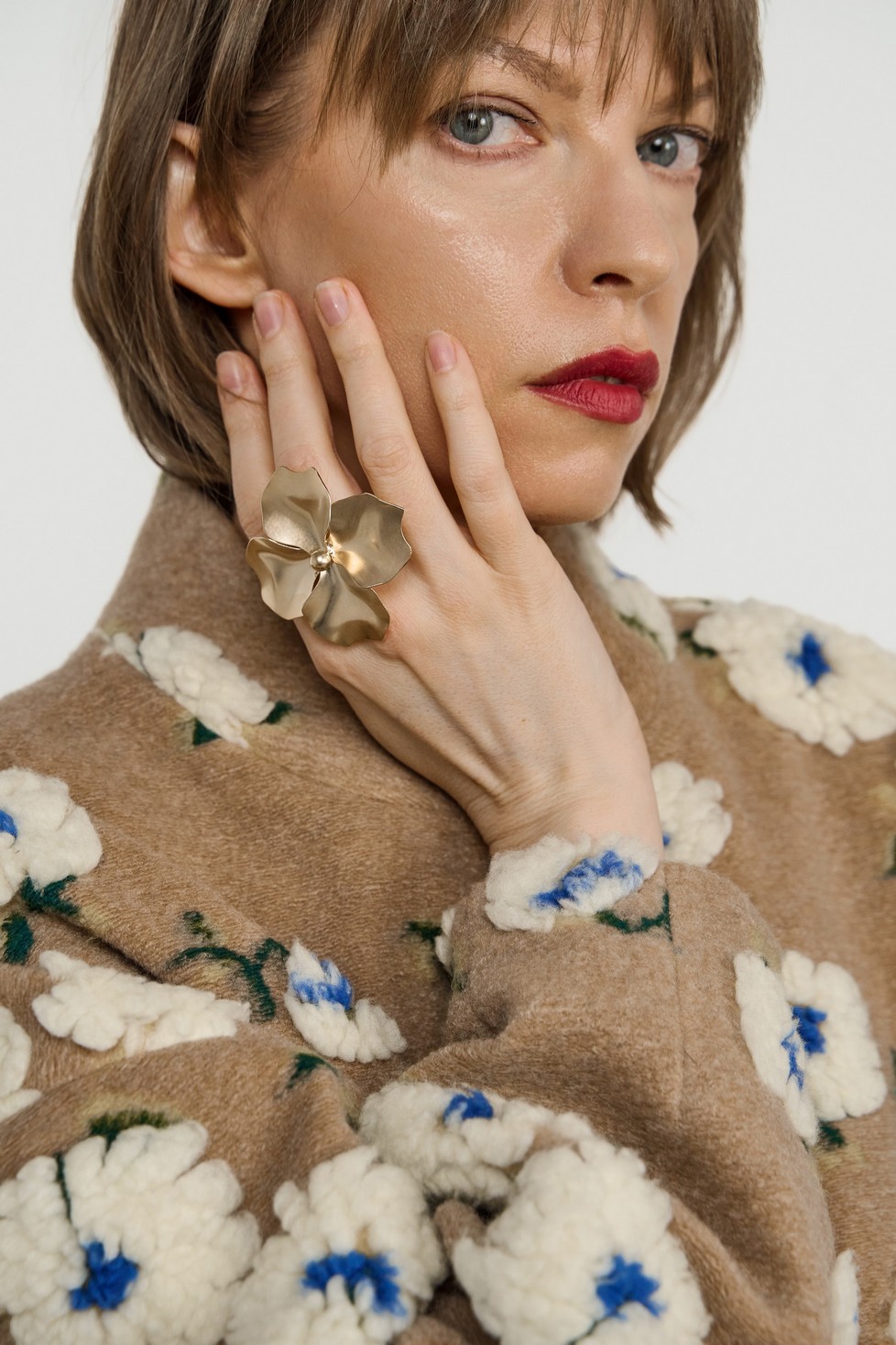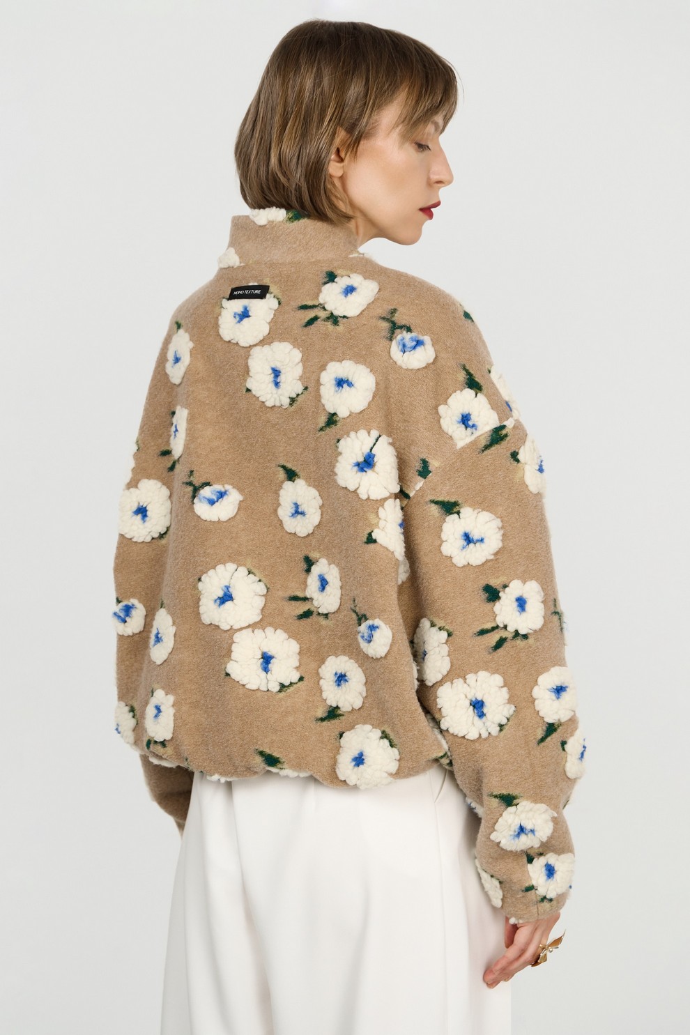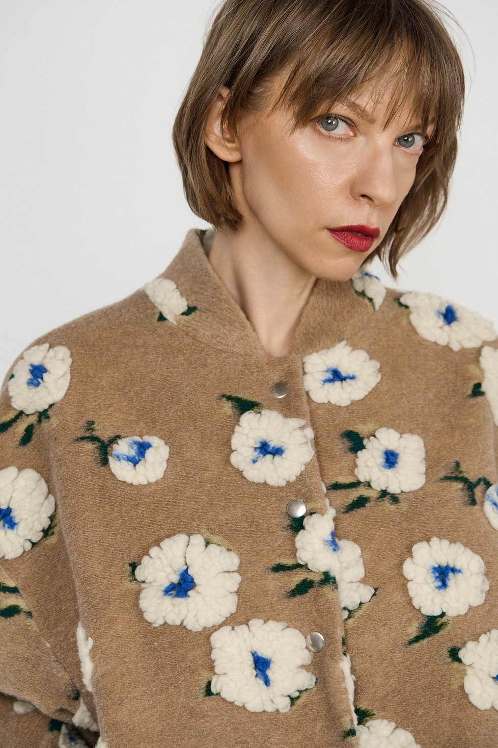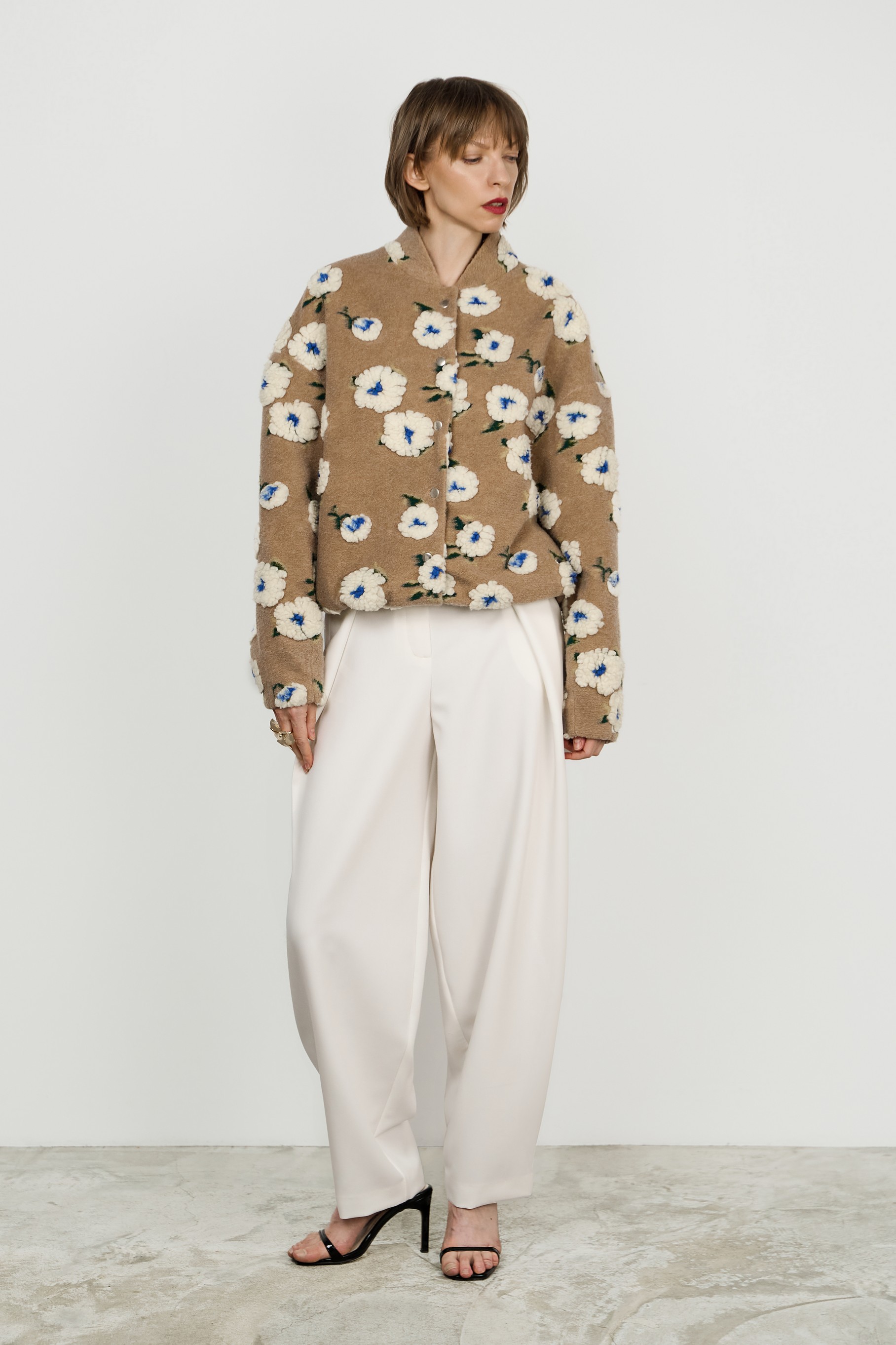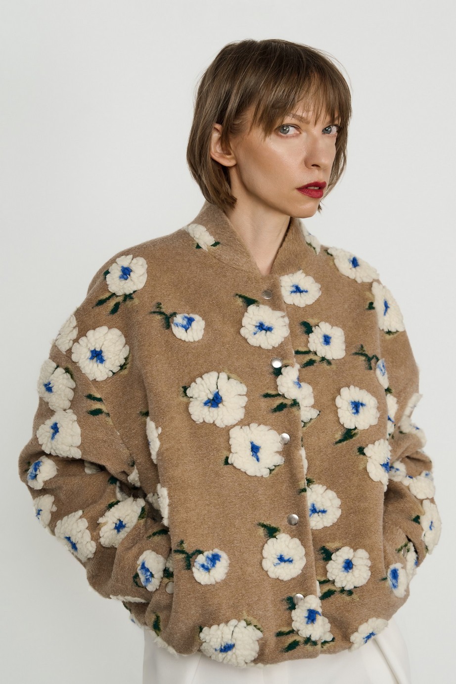 Теплый и уютный бомбер свободного кроя с подкладкой — яркий акцент в гардеробе. Объемный принт в виде цветов добавляет индивидуальности образу.