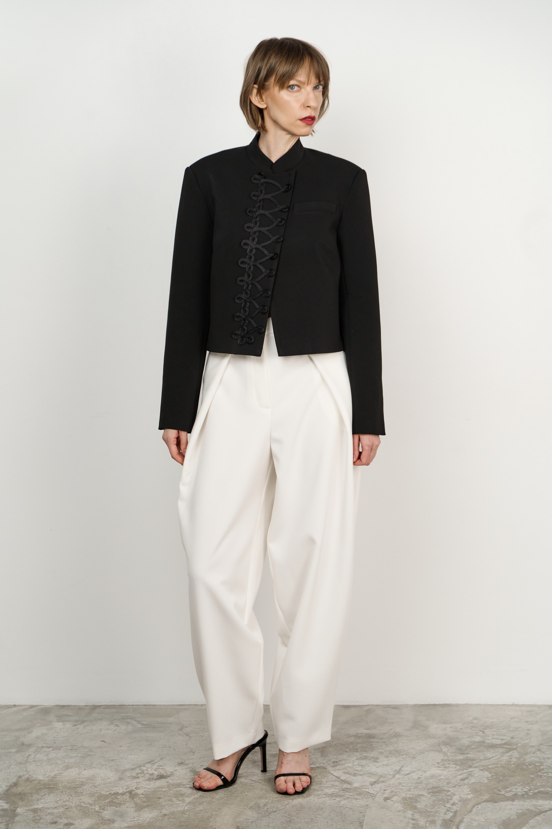 Воротник-стойка добавляет строгости, а застёжка на скрытые кнопки сохраняет минималистичный вид. Рукава с аккуратной шлицей и рядом пуговиц подчёркивают внимание к деталям. Особый акцент — декоративная «гусарская» нашивка на правой полочке, которая придаёт изделию индивидуальность.